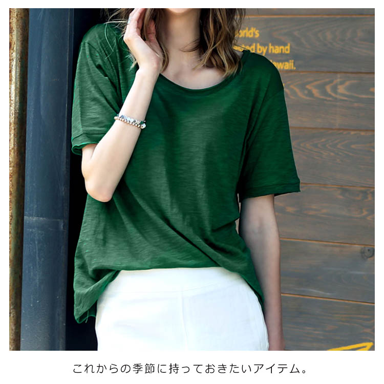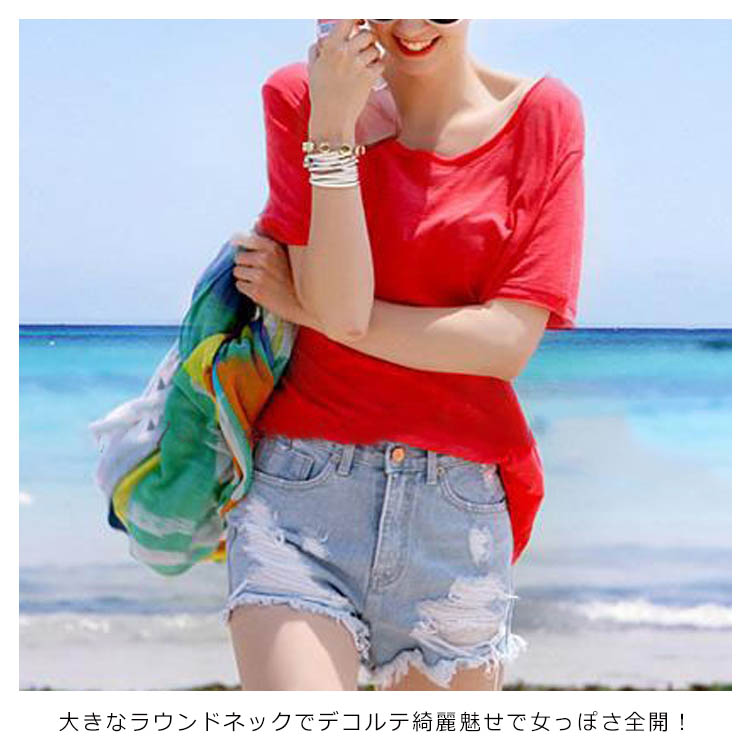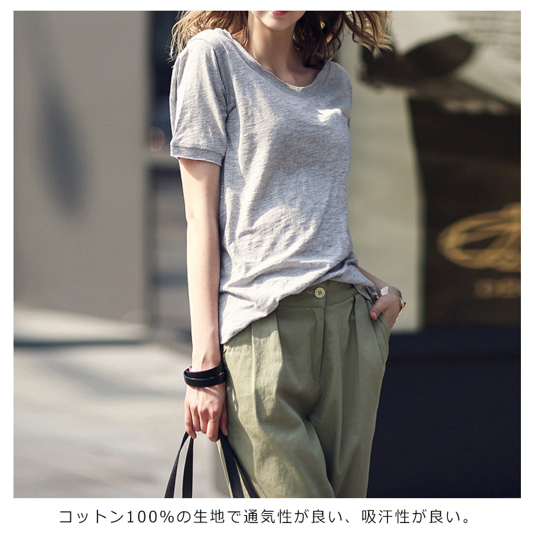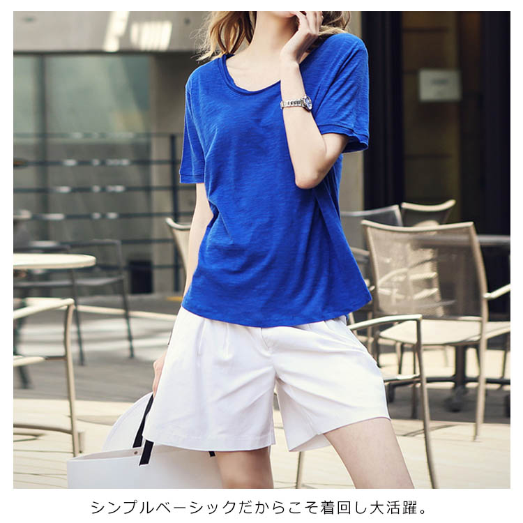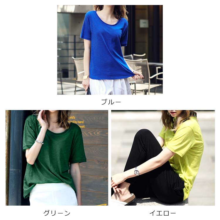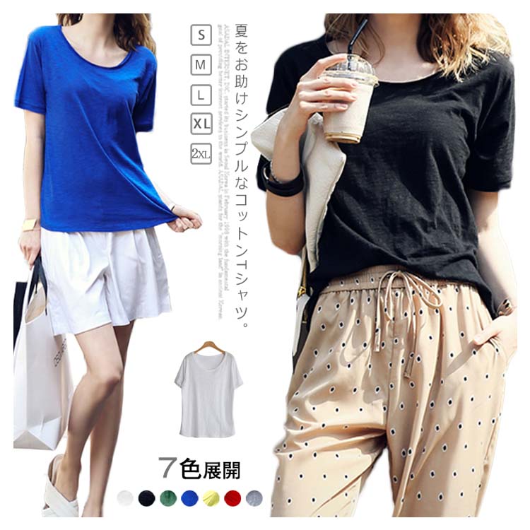 Tシャツ カットソー ラウンドネック トップス レディース ゆったり シンプル 無地 半袖 夏服 コットン 夏物