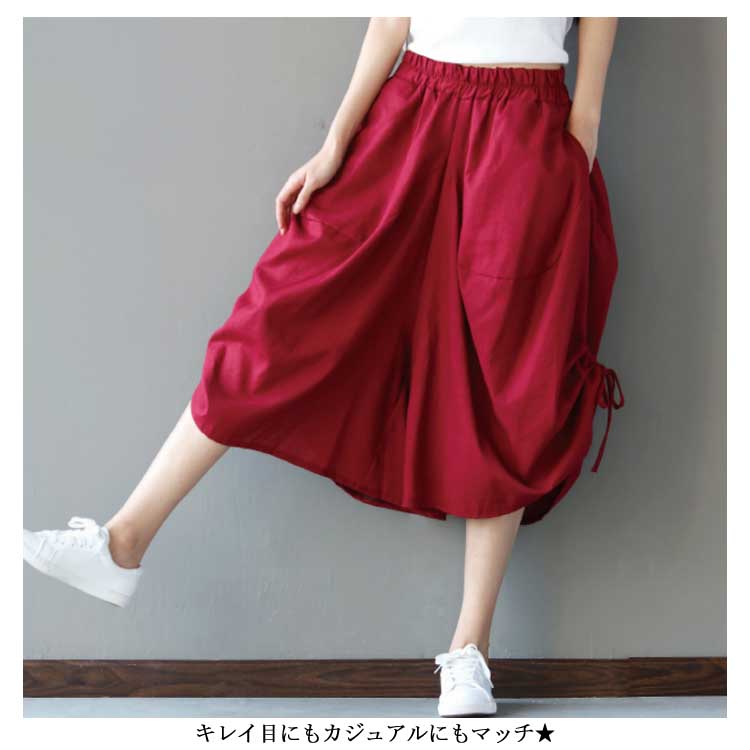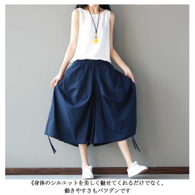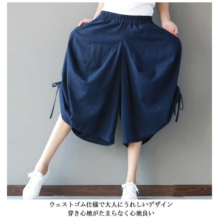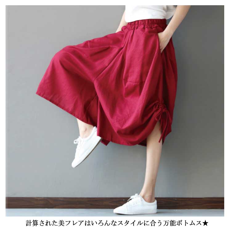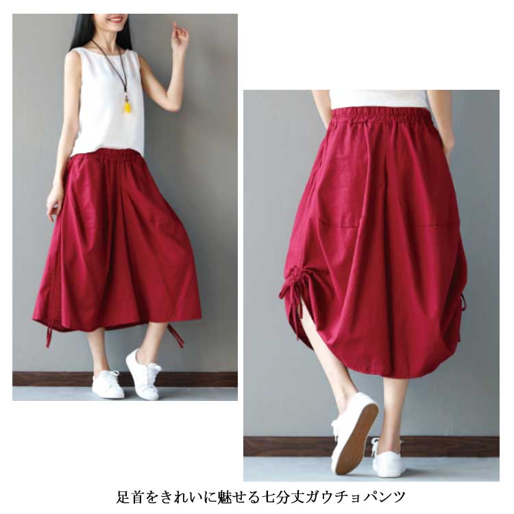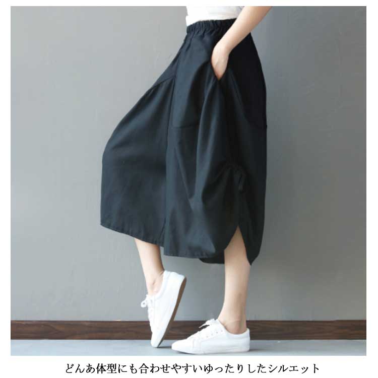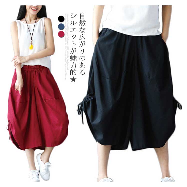 送料無料 ガウチョパンツ レディース ワイドパンツ フレアパンツ 七分丈パンツ ゆるパンツ 無地パンツ ポケット付き ボタン付き ハイウエスト ゴム入り ゆったり リラックス カジュアル キレイめ お洒落 体型カバー 着痩せ ボトムス 春物 夏物 夏新作