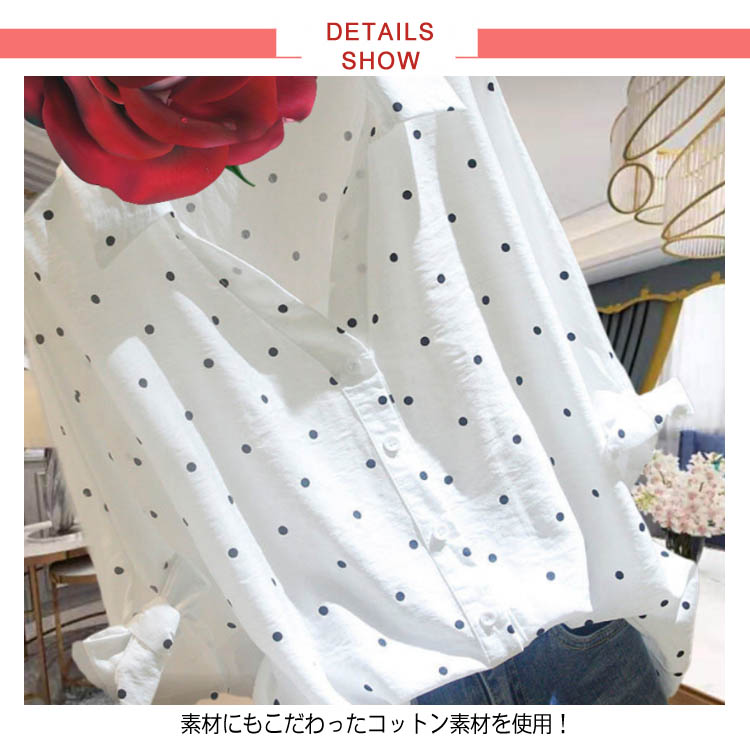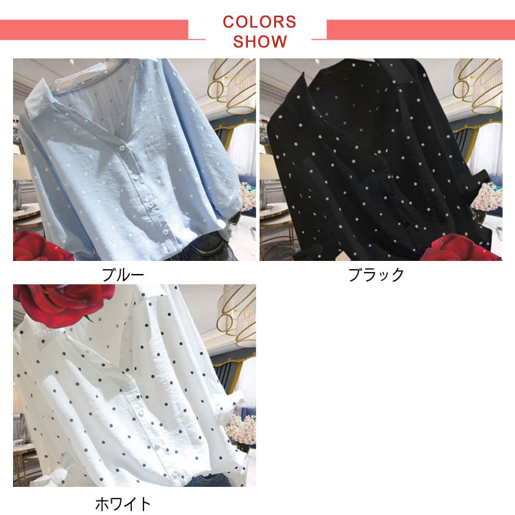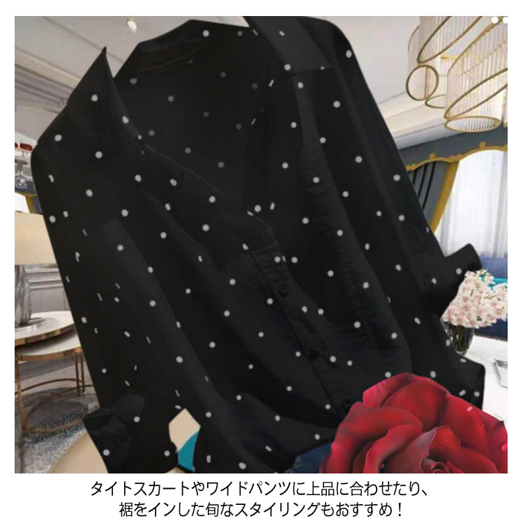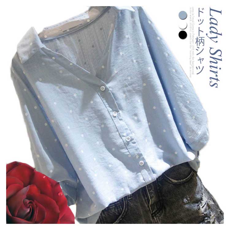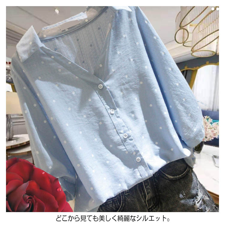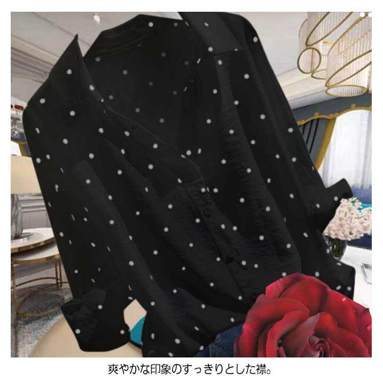 韓国 ファッション 水玉柄 ドット柄 シャツ ブラウス レディース 中袖 半袖 シャツ ブラウス Vネック 通勤 フェミニン オフィス