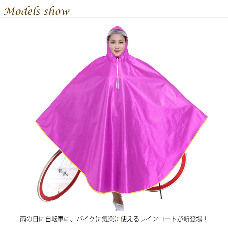 | 雨の日に自転車に、バイクに気楽に使えるレインコートが新登場! 柔らかくて通気性に優れた素材で快適な着心地! 突然の雨でも安心!さっと着れる!さっと脱げる!携帯にも便利! | |