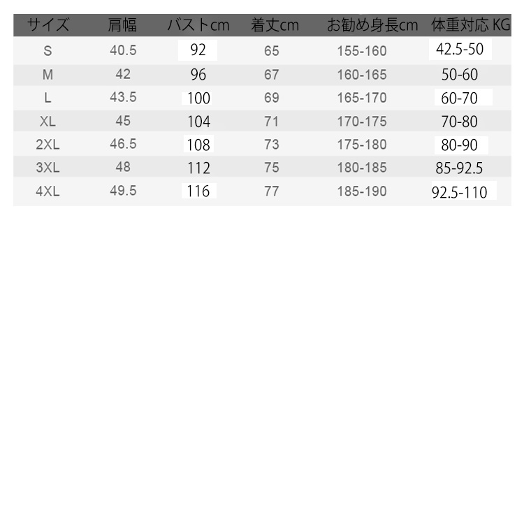 | サイズ | S M L XL 2XL 3XL 4XL |