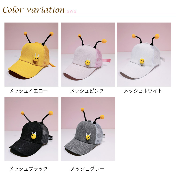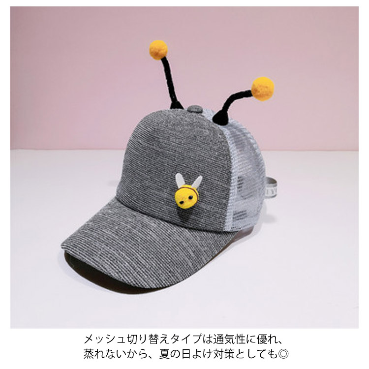 | ミツバチが可愛い子供キャップです。 キュートなミツバチデザインにメロメロ。 メッシュ切り替えタイプは通気性に優れ、蒸れないから、夏の日よけ対策としても◎ アジャスター付きで、サイズ調節が可能ですから、長く愛用できます。 夏、春秋のお出かけや通学にとても便利な日よけアイテムです。 | |