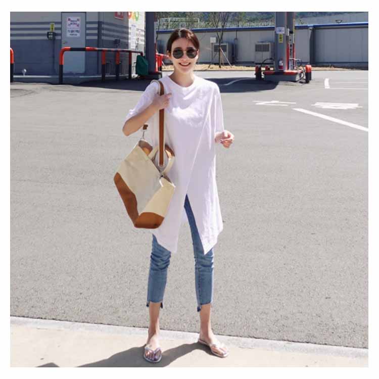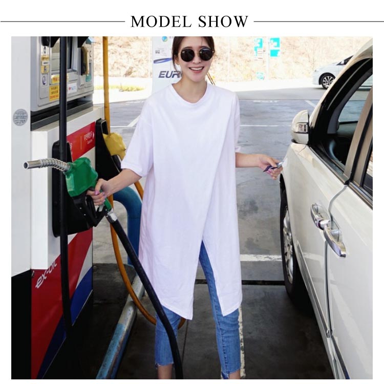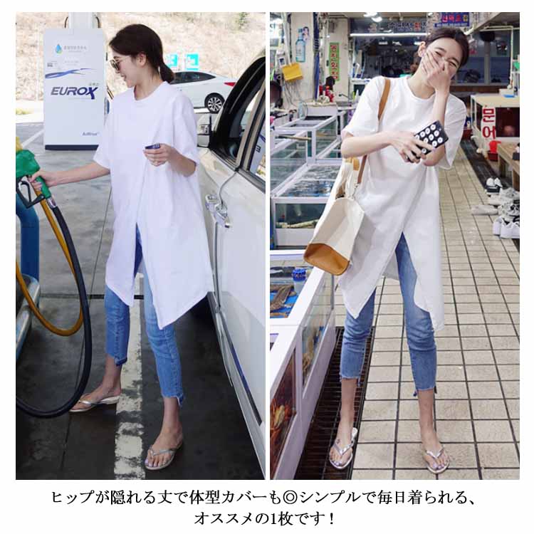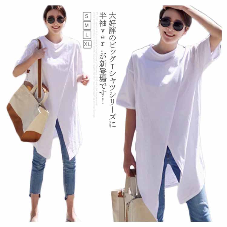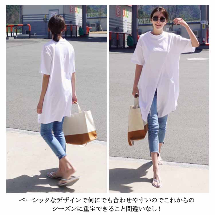 アシンメトリー Tシャツ ロングTシャツ レディース ロング丈 Tシャツ スリット入り 半袖 Tシャツ ラウンドネック シンプル トップス 体型カバー 韓国ファッション