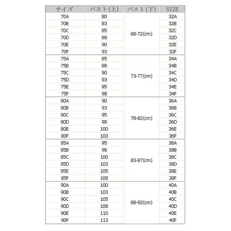 | サイズ | 70A(32A) 70B(32B) 75A(34A) 75B(34B) 75C(34C) 80A(36A) 80B(36B) 80C(36C) 85A(38A) 85B(38B) 85C(38C) 90C(40C) |