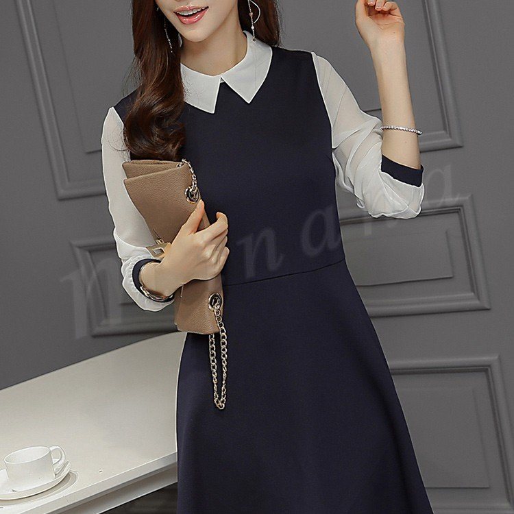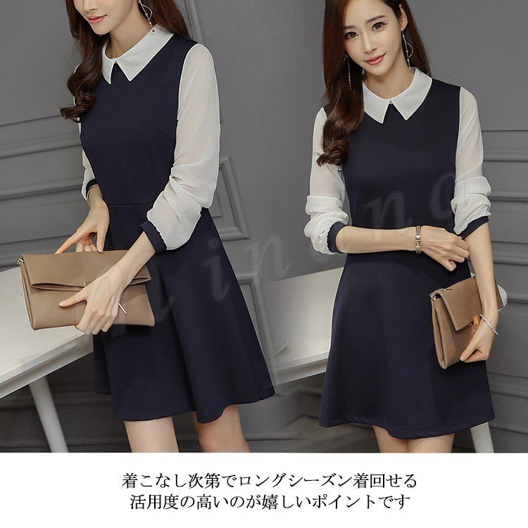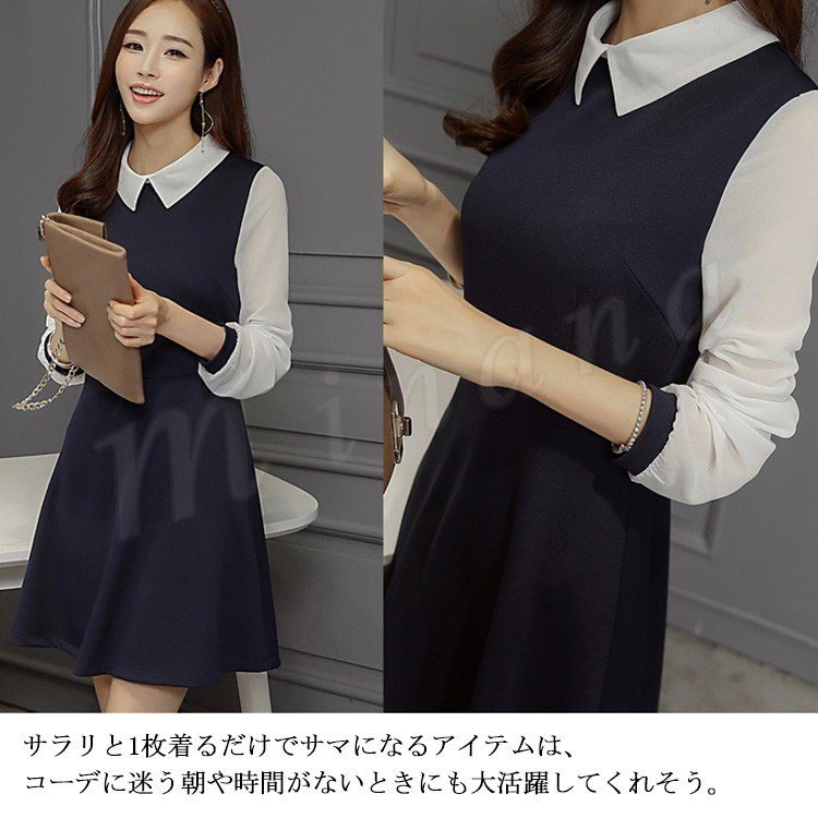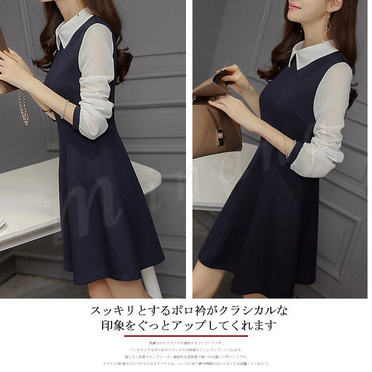 レディースワンピース フォーマルワンピース Aラインワンピース 配色 長袖 ポロ衿 フレアワンピース おしゃれ ミニ丈 デート 可愛い 大人 上品