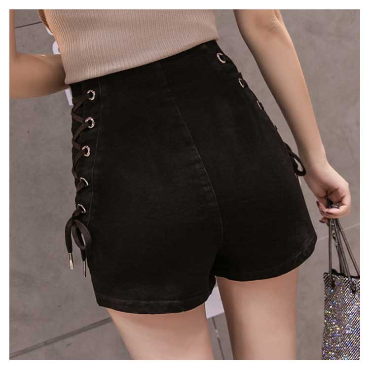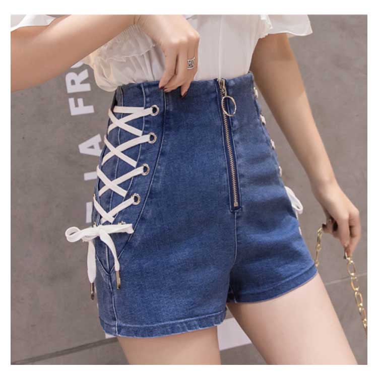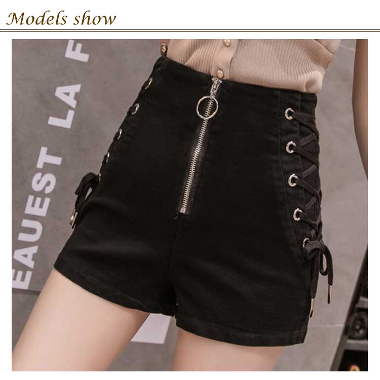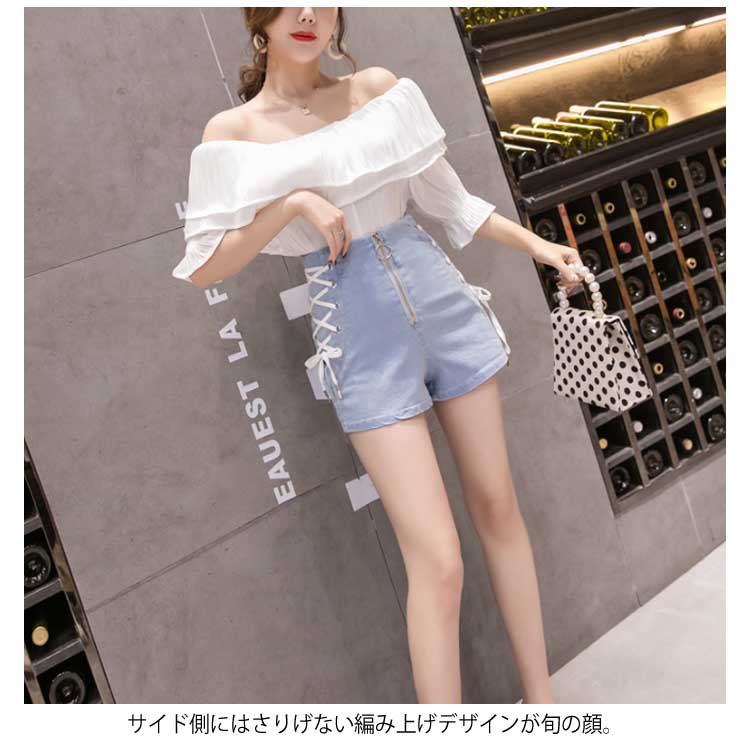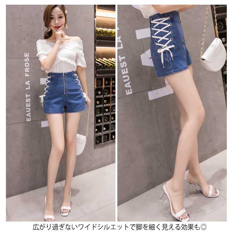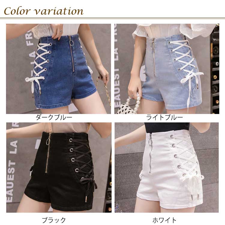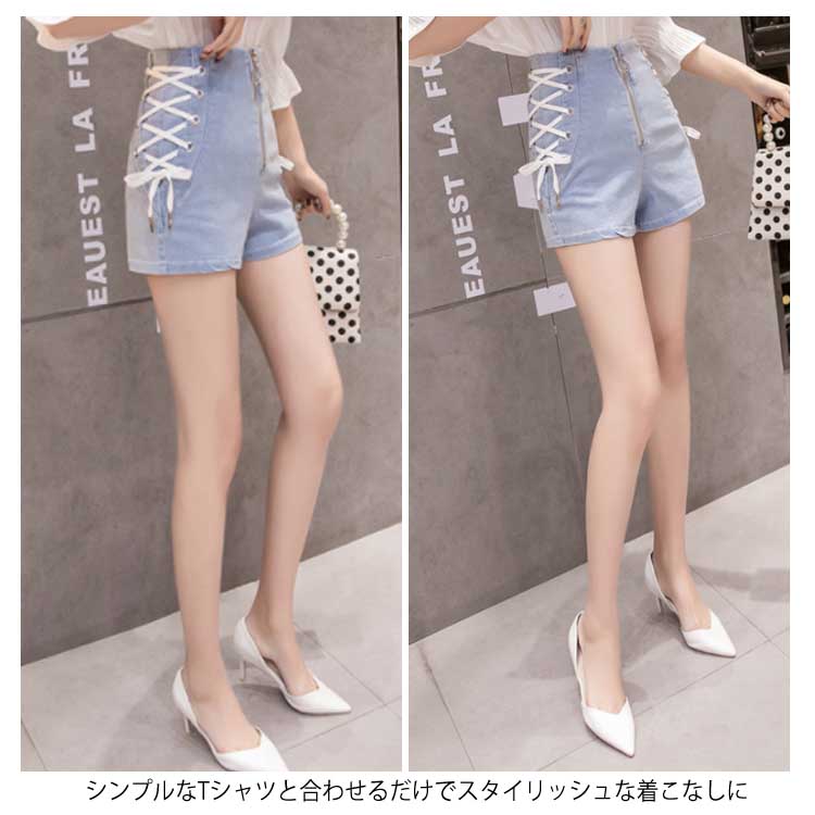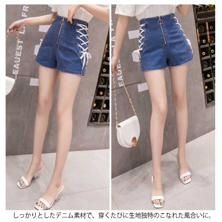 《送料無料》全4色×4サイズ!フロントジッパー ハイウエスト デニムショートパンツ サイド編み上げ デニム ショートパンツ ハイウエスト 短パン ショーパン 美脚 夏 おしゃれ レディース