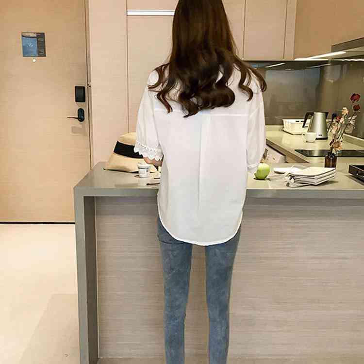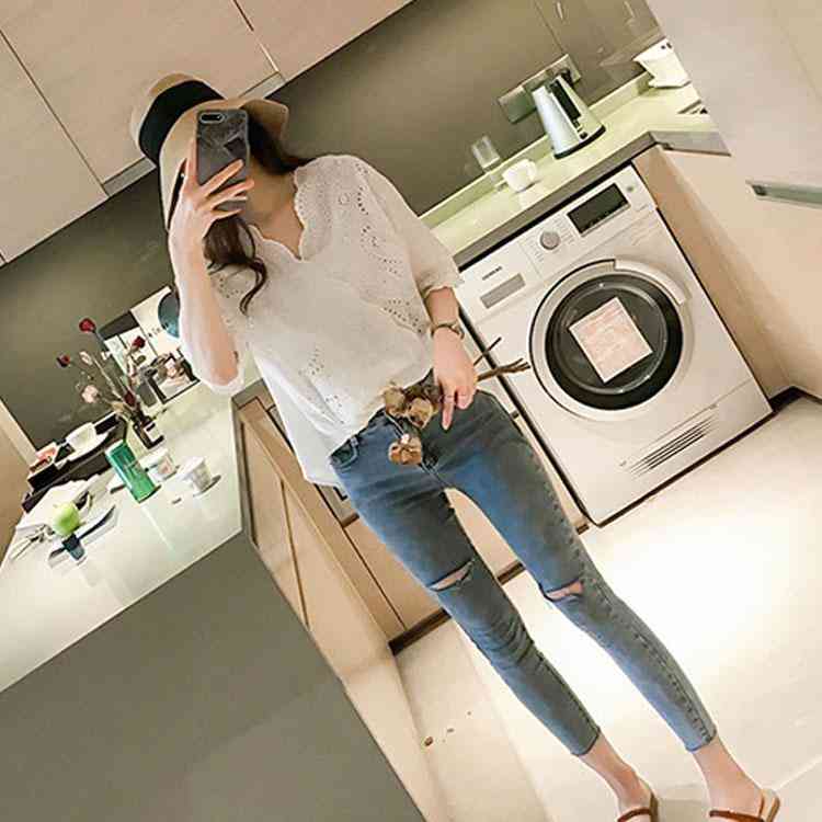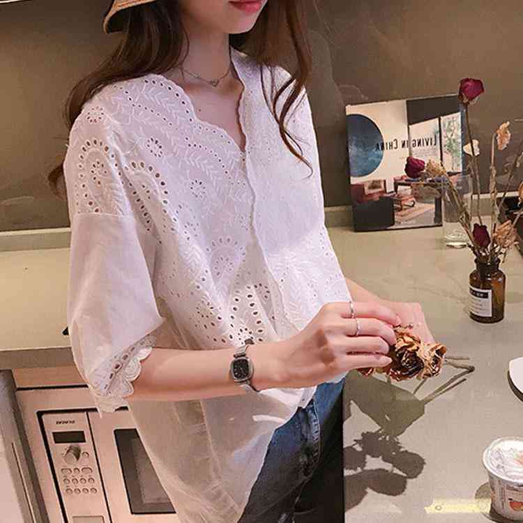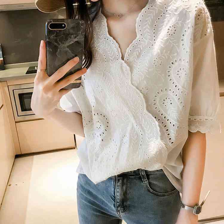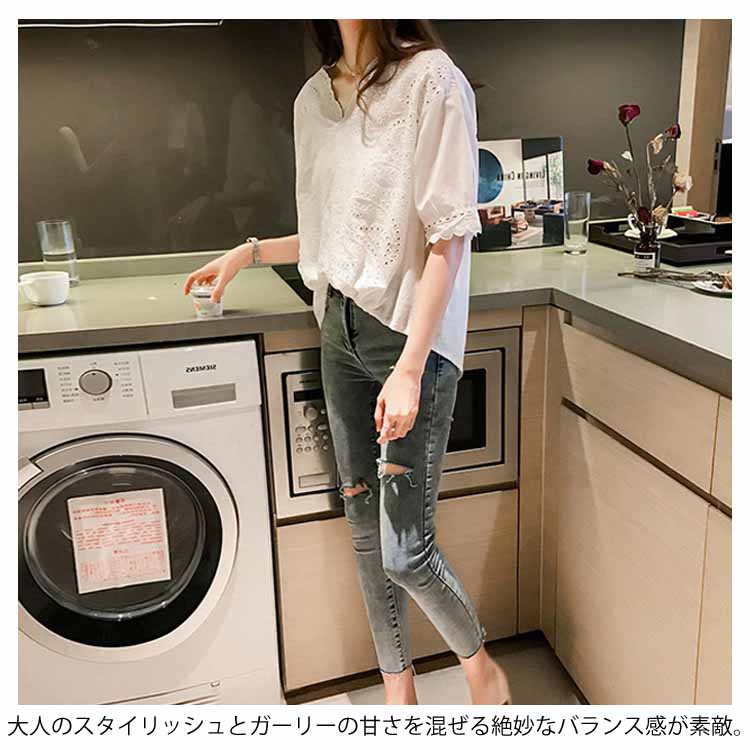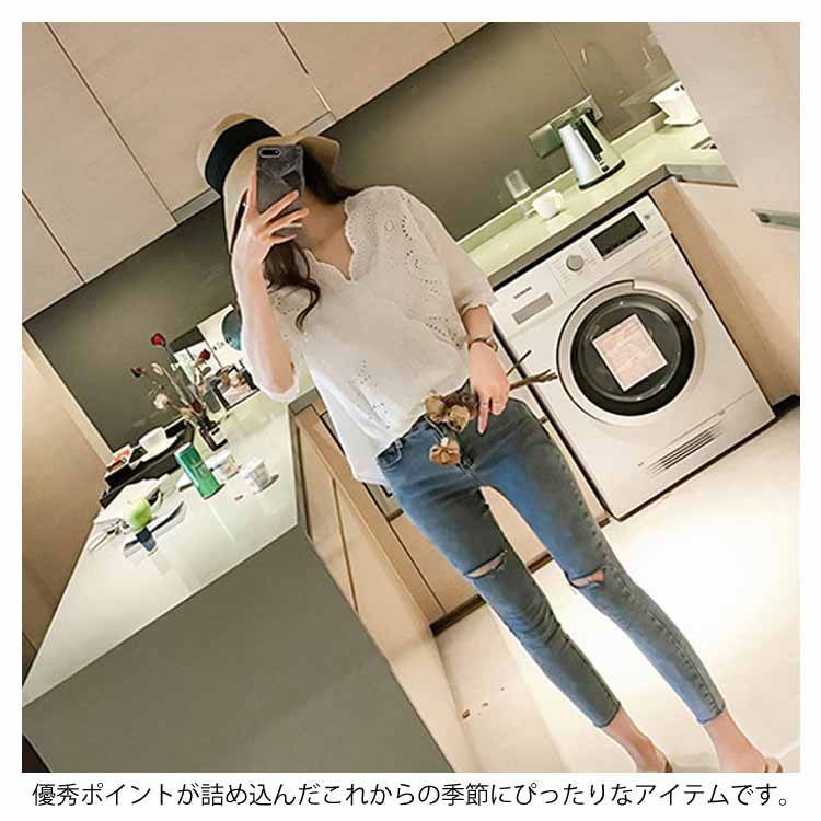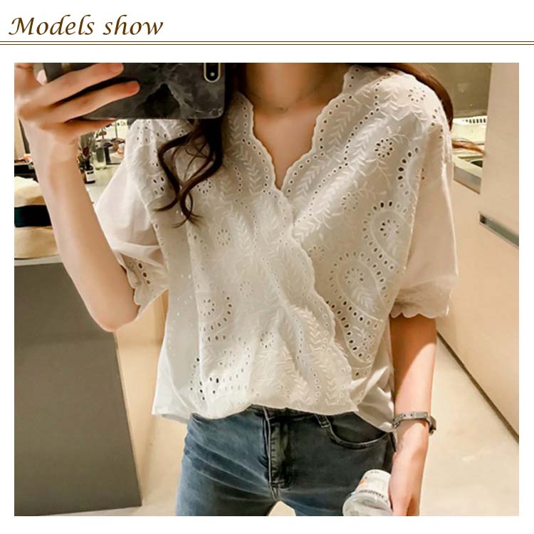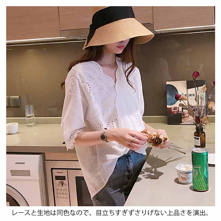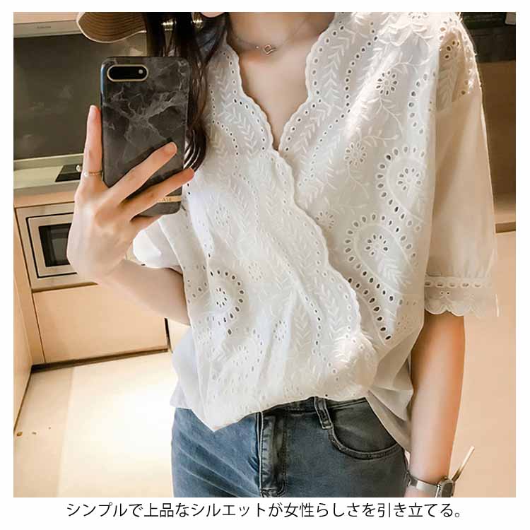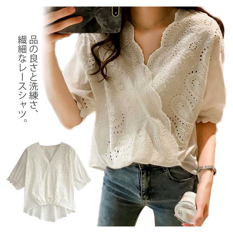 送料無料 シャツ レースシャツ 2019夏の新作 大サイズ 半袖シャツ Vネック トップス ブラウス 夏服 ゆったり 大人可愛 無地 カバー レディース 合わせやすい