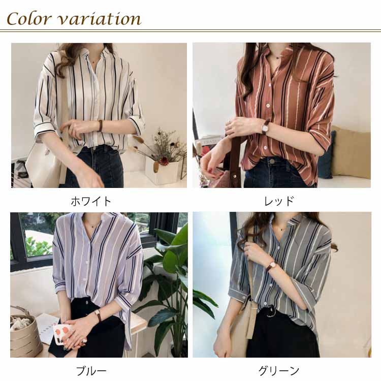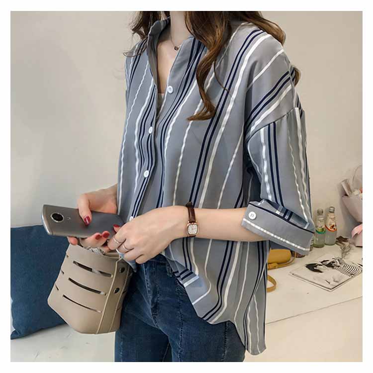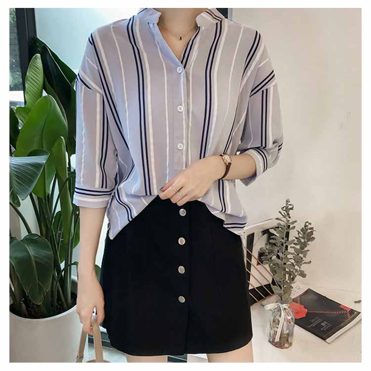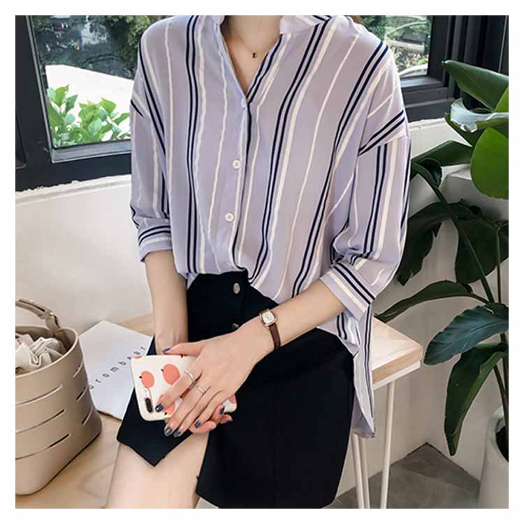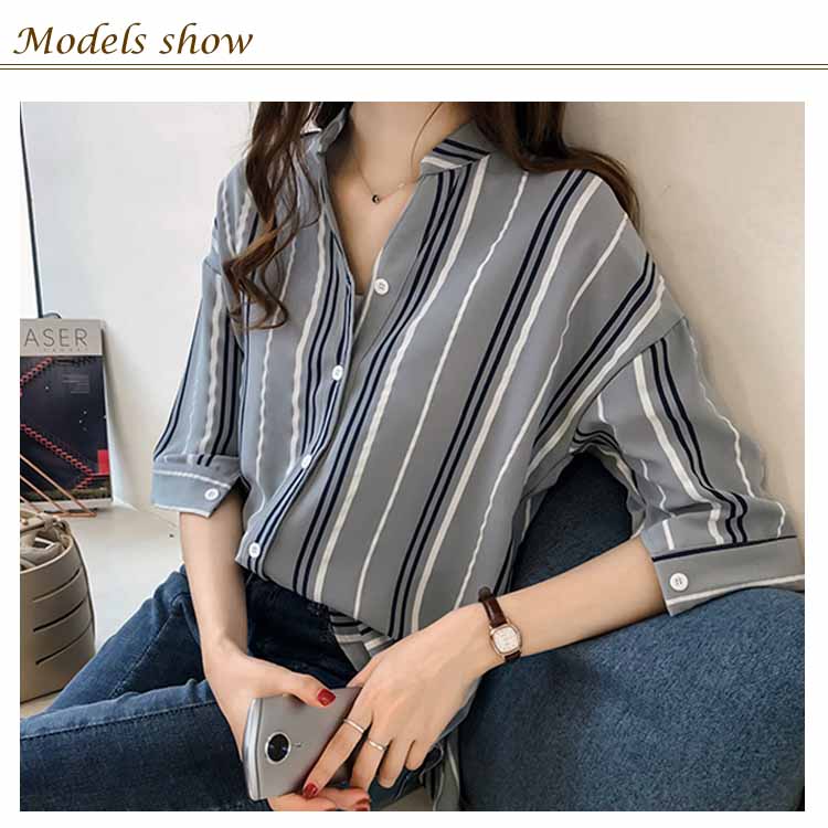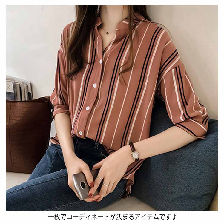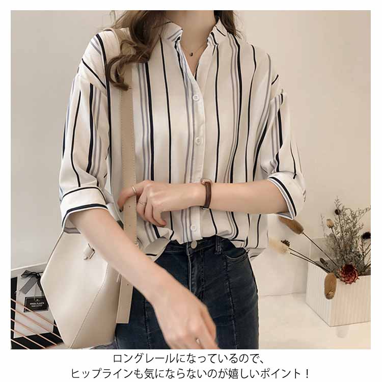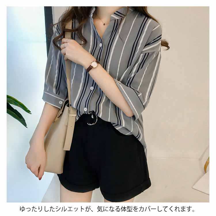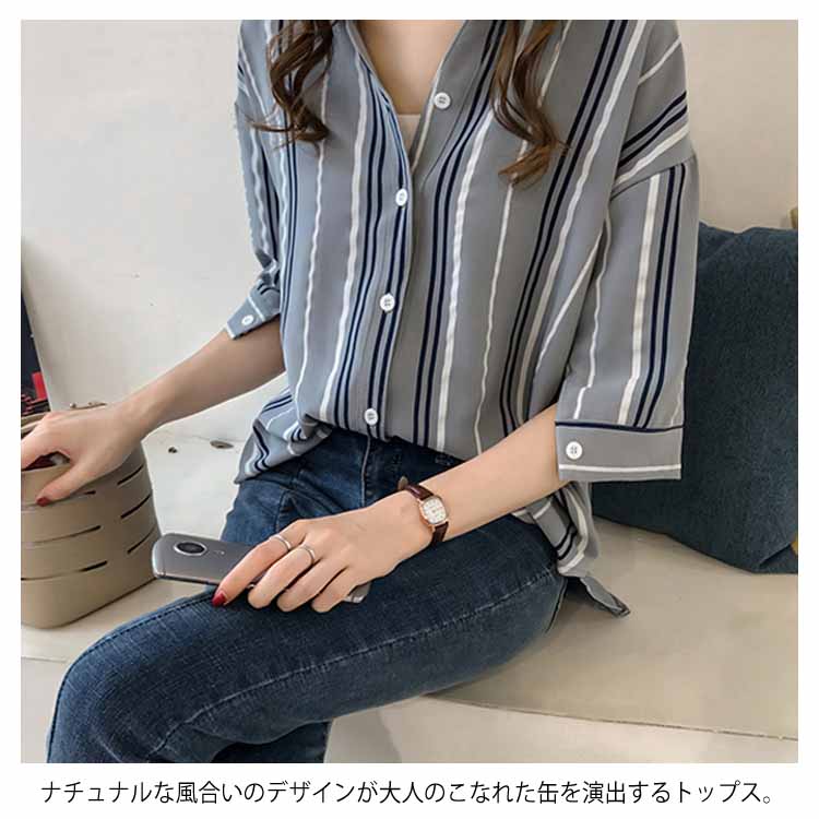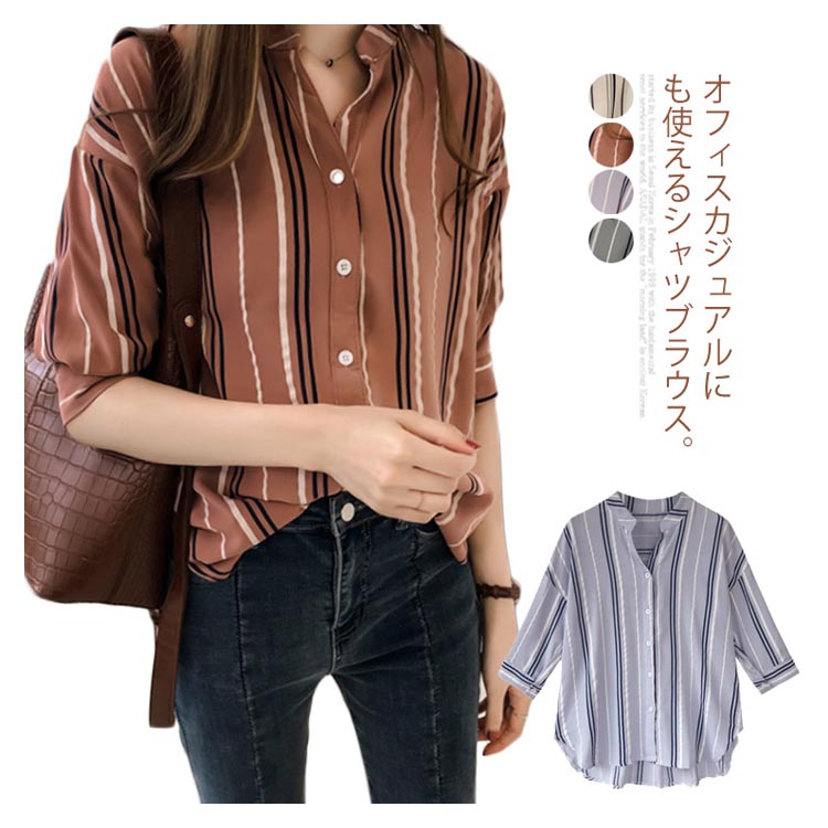 送料無料 シャツ ストライプ 2019夏の新作 大サイズ 7分袖 Vネック トップス ブラウス 夏服 ゆったり お洒落 無地 カバー レディース 体型カバー 全4色