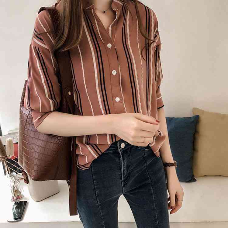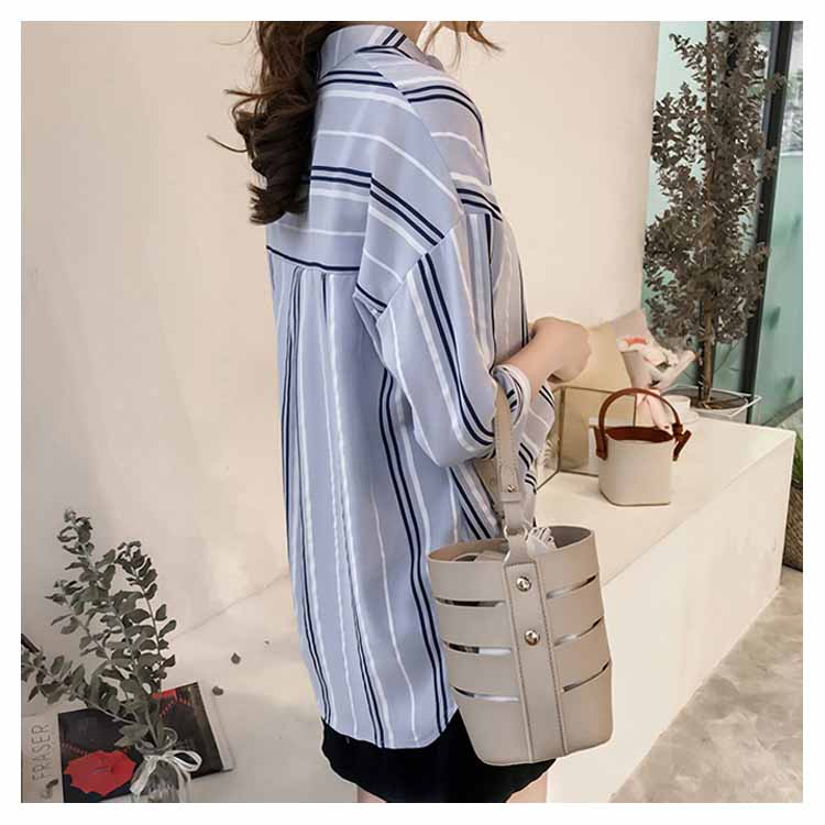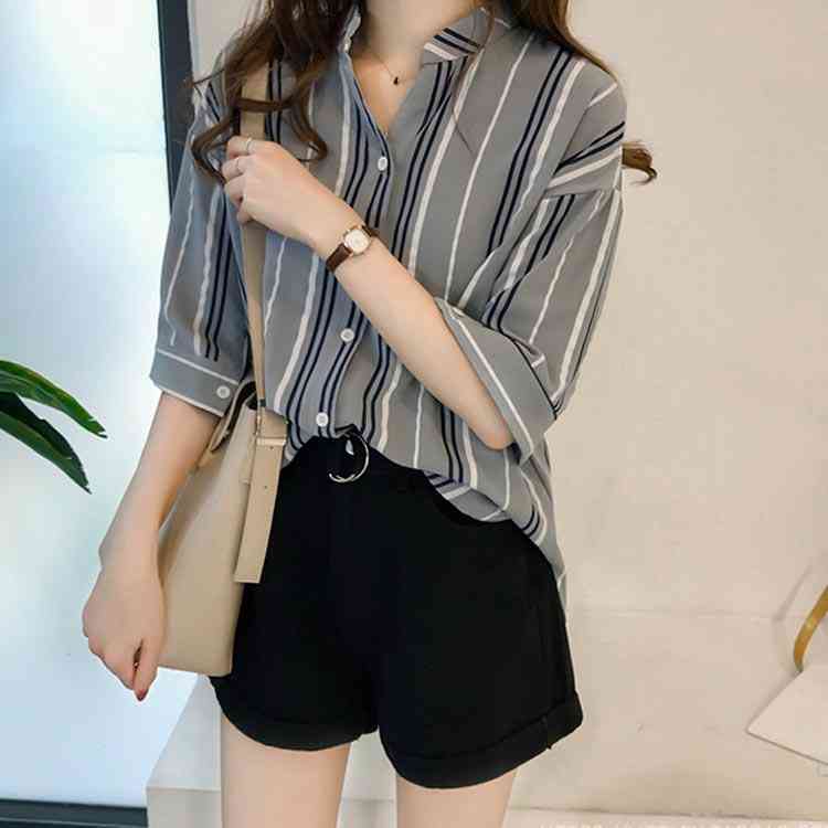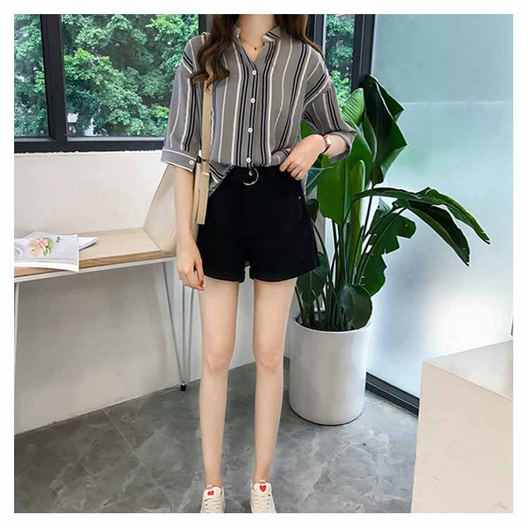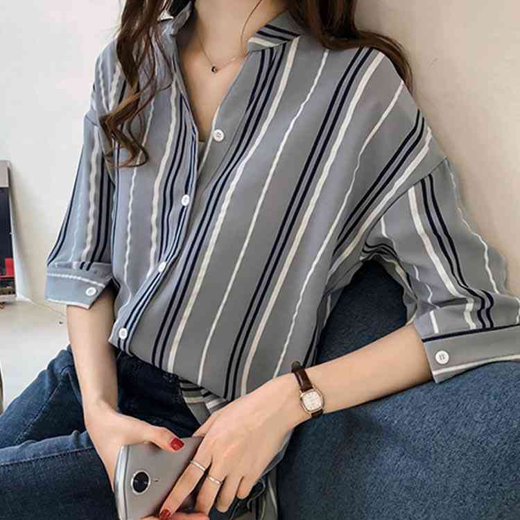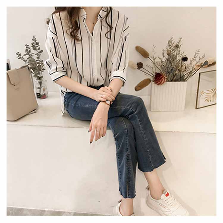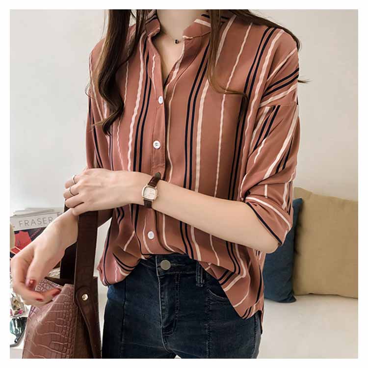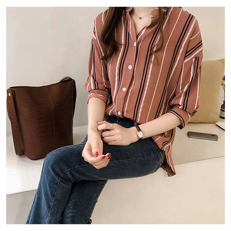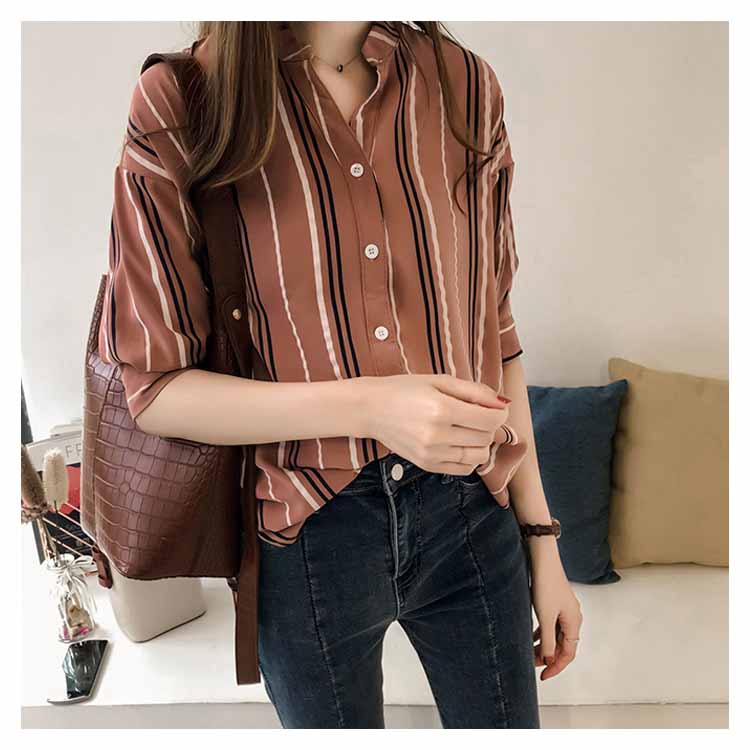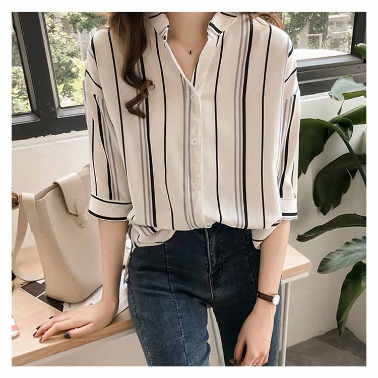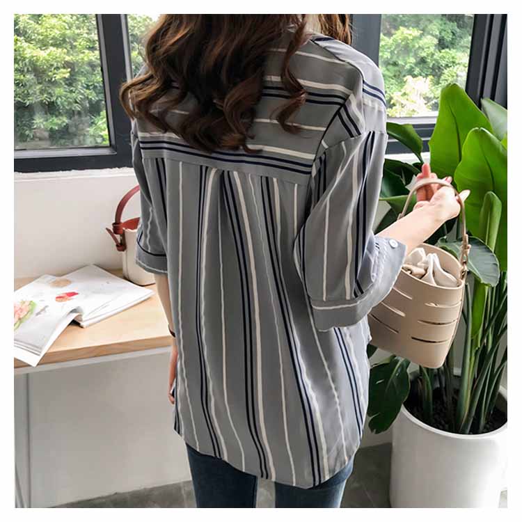 送料無料 シャツ ストライプ 2019夏の新作 大サイズ 7分袖 Vネック トップス ブラウス 夏服 ゆったり お洒落 無地 カバー レディース 体型カバー 全4色