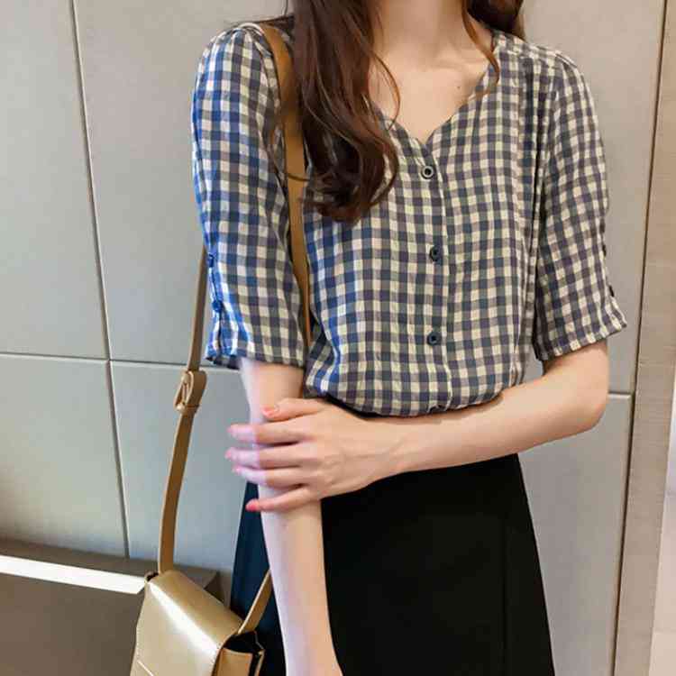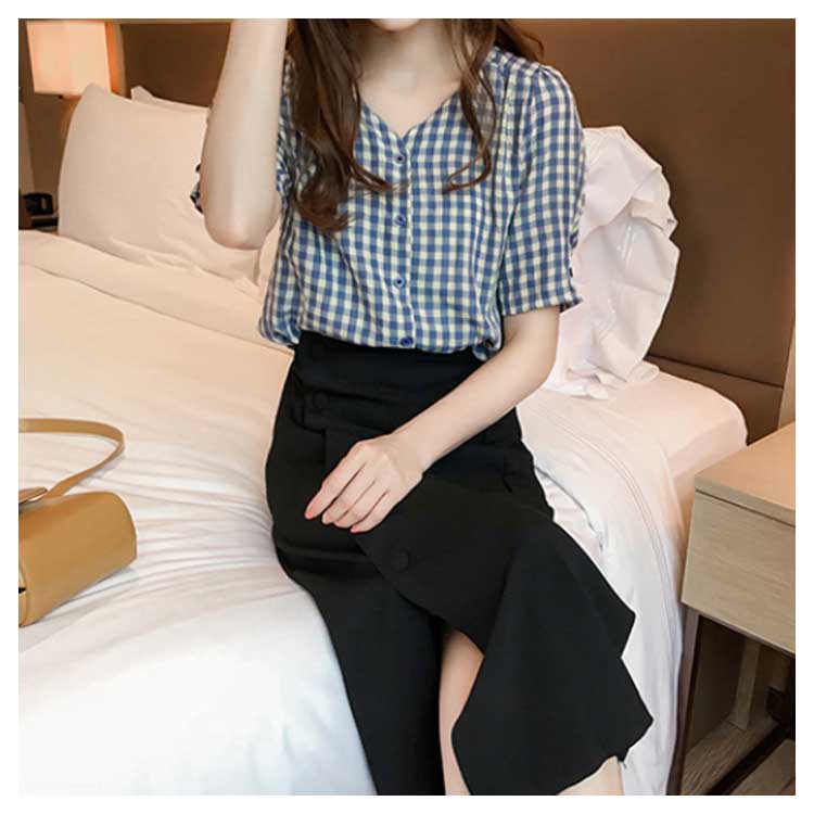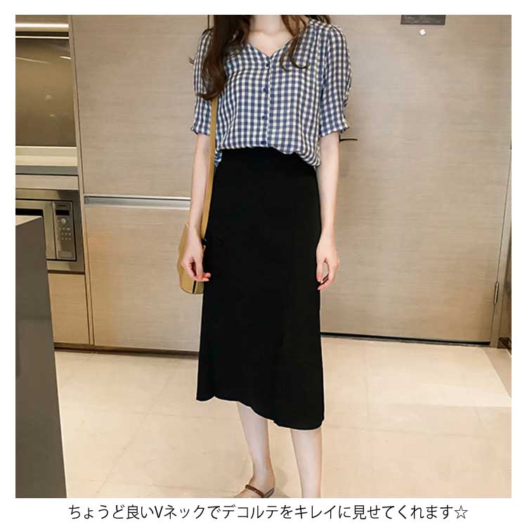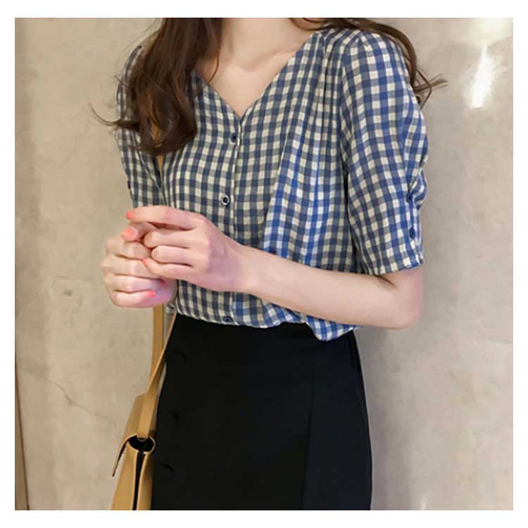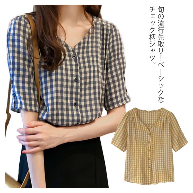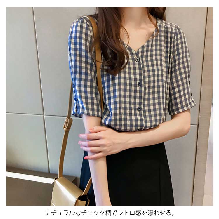 送料無料 シャツ チェック柄 2019夏の新作 大サイズ 5分袖 Vネック トップス ブラウス 夏服 ゆったり 大人女子 着痩せ カバー レディース エレガント 体型カバー