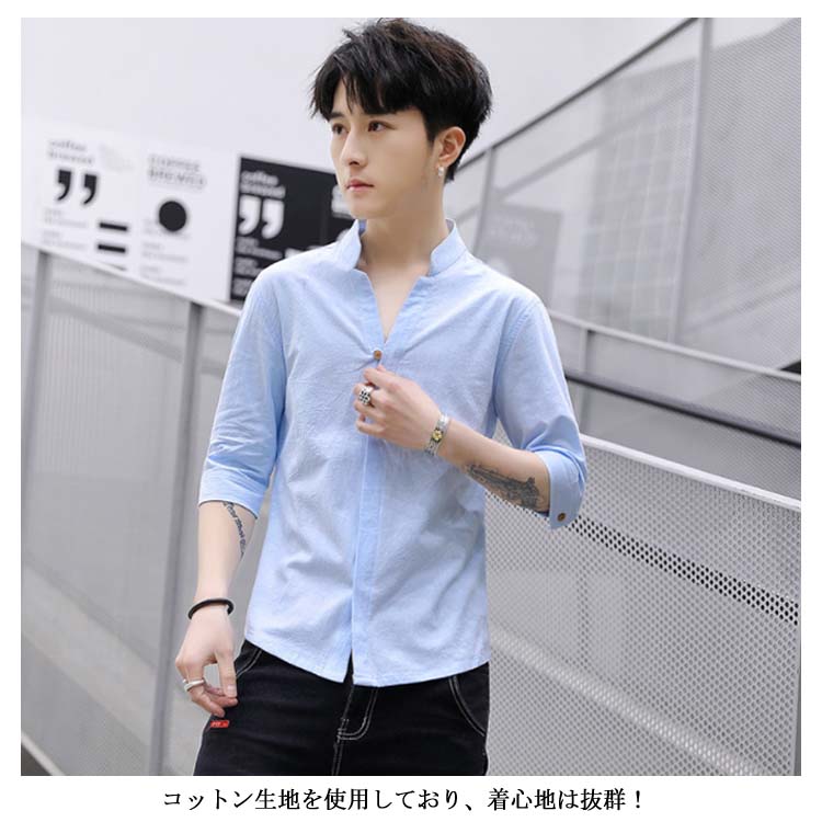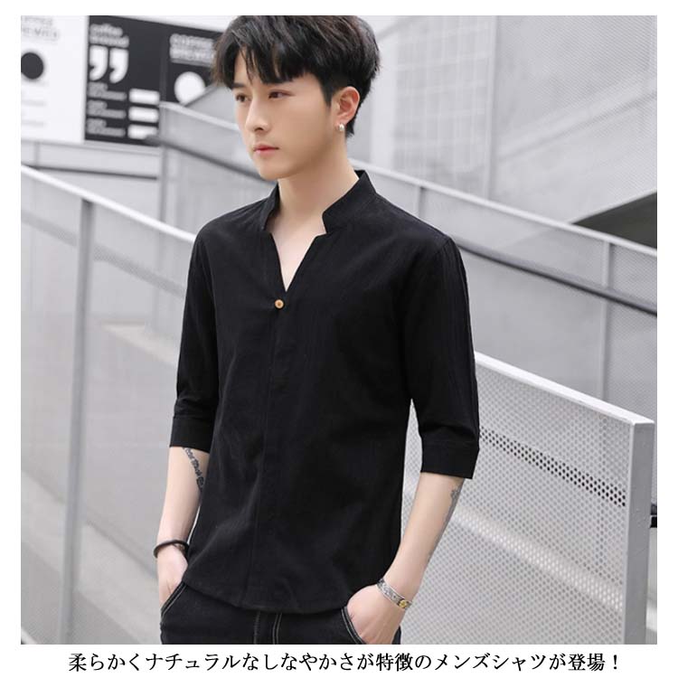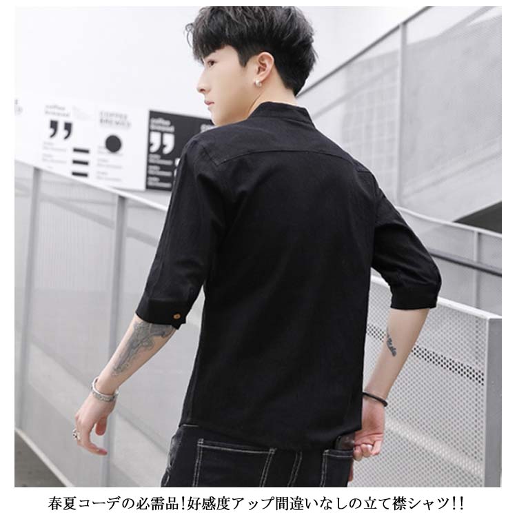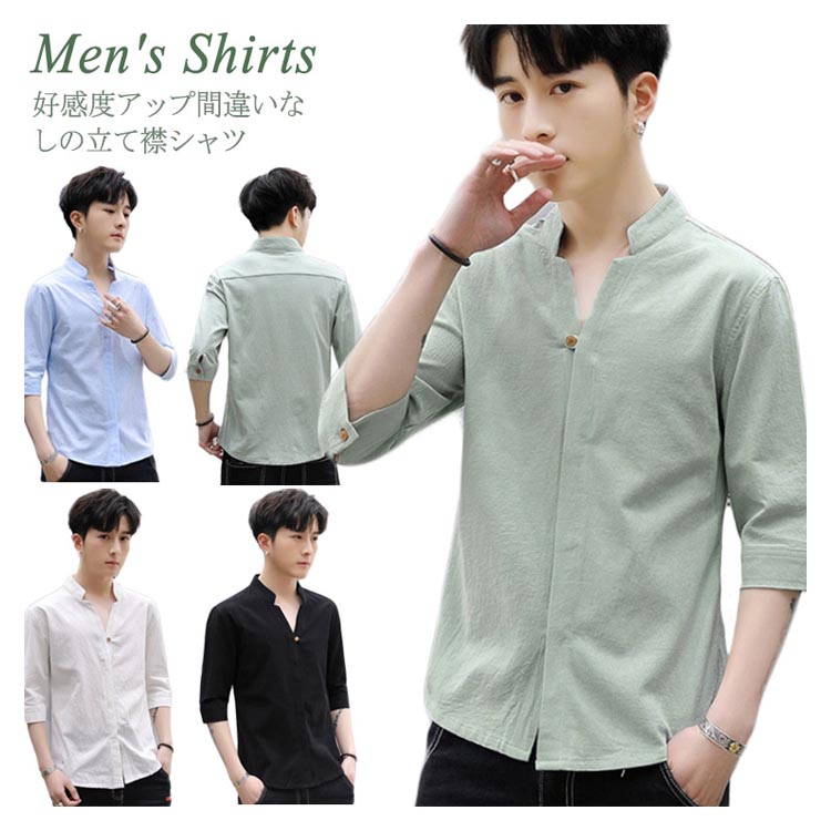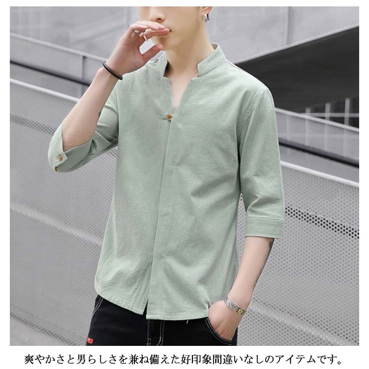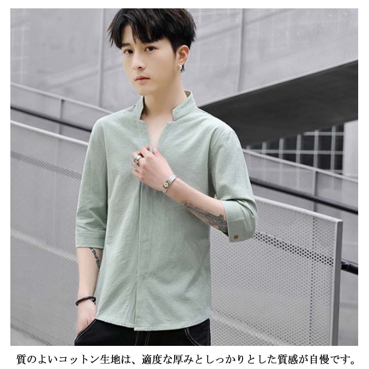 シャツ スタンドカラー シャツ 7分袖 メンズ 薄手 シャツ 無地 和風 立ち襟 バンドカラー シャツ カジュアル 春夏 春物