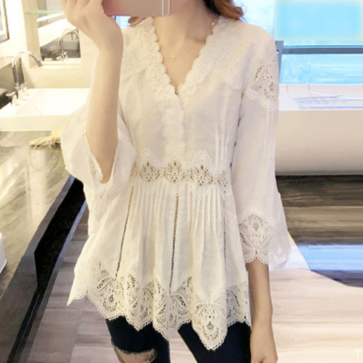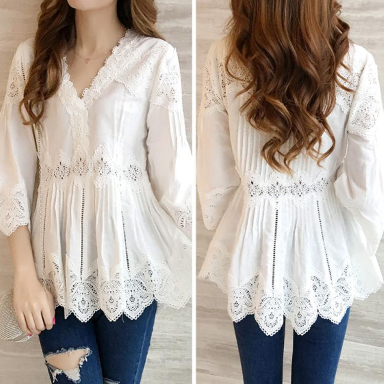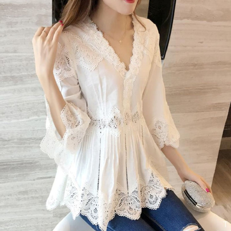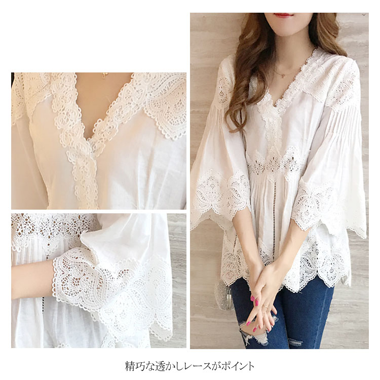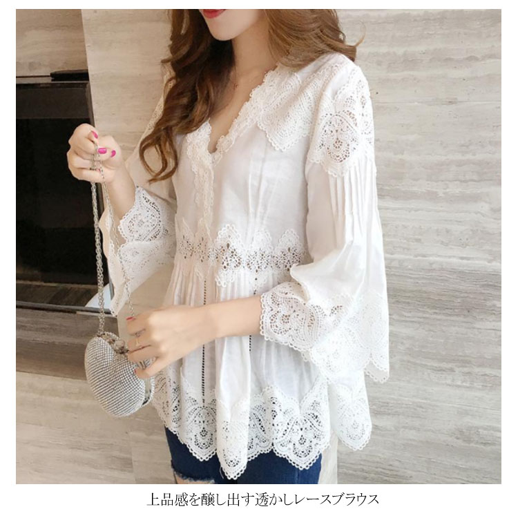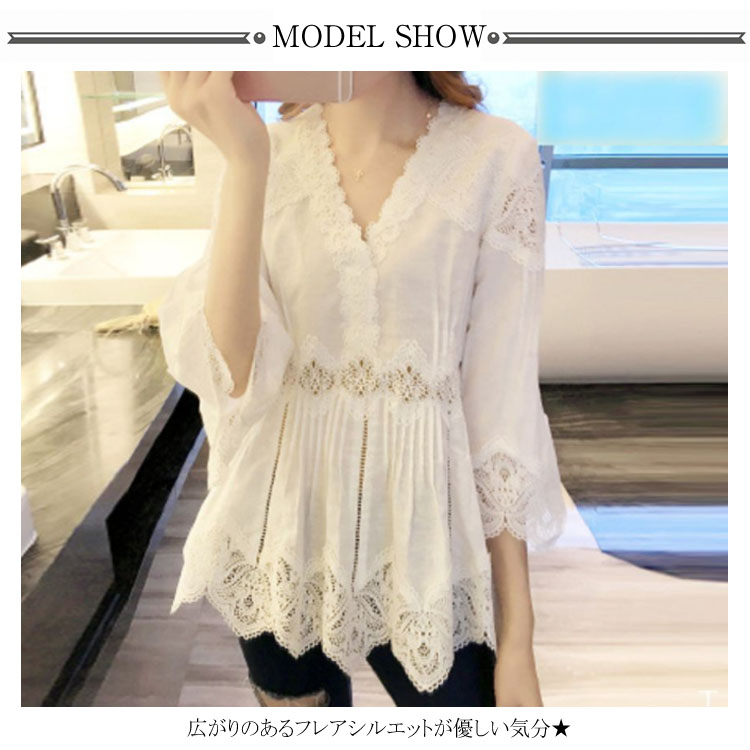 送料無料 レースブラウス レディース ブラウス 透かしレース 五分袖 フレアスリーブ Vネック スカラップ 透け感 フレアブラウス ふんわり 揺れる お洒落 キレイめ 大人 こなれ感 フェミニン トップス 夏新作