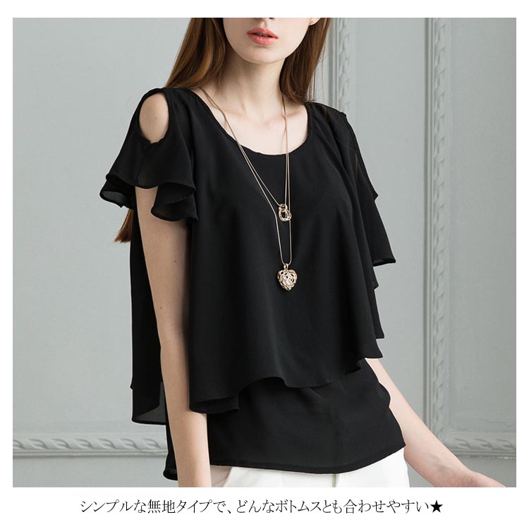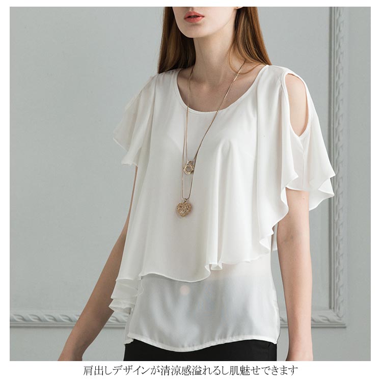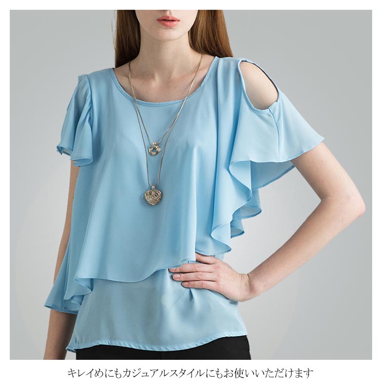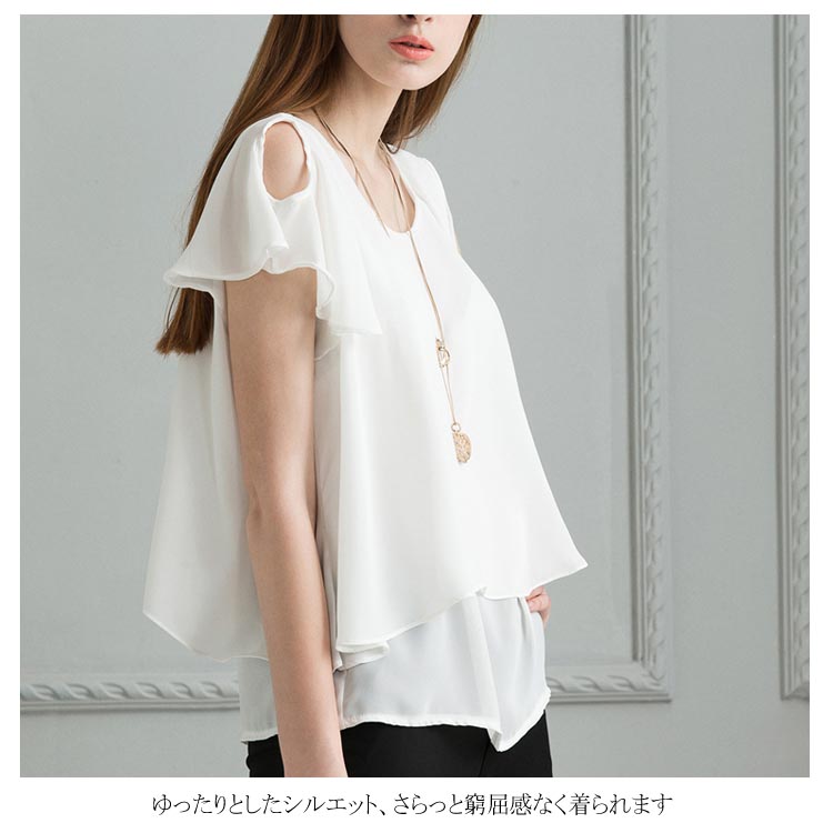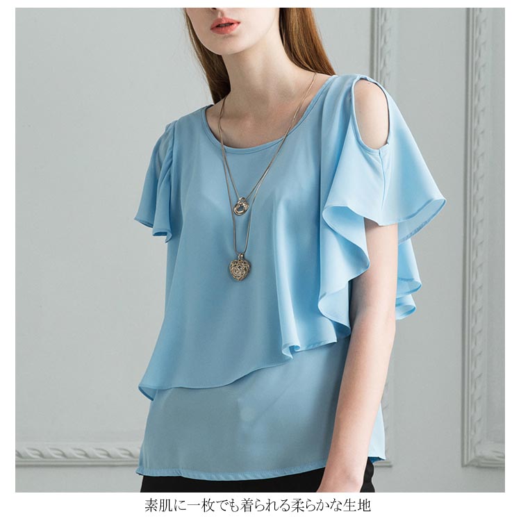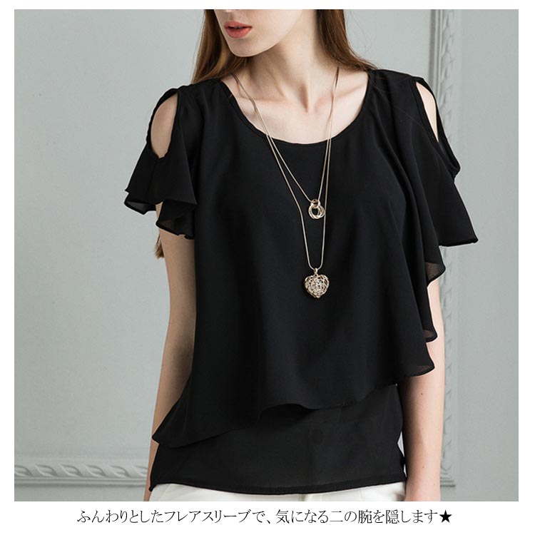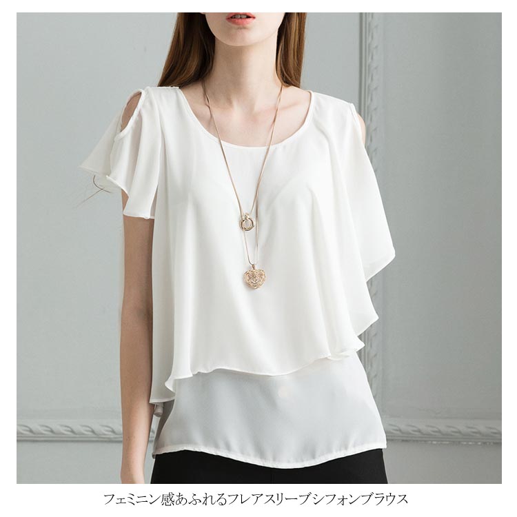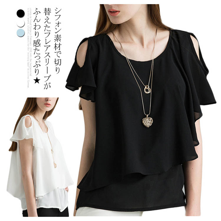 送料無料 ブラウス/レディース/半袖ブラウス/無地ブラウス/薄手ブラウス/フレアスリーブ/シフォン袖/透け感/肩あき/ラウンドネック/ゆったり/プルオーバー/トップス/お洒落/キレイめ/フェミニン/カジュアル/夏新作