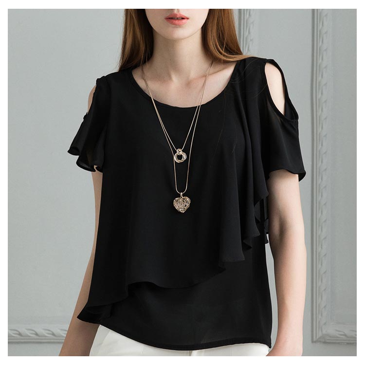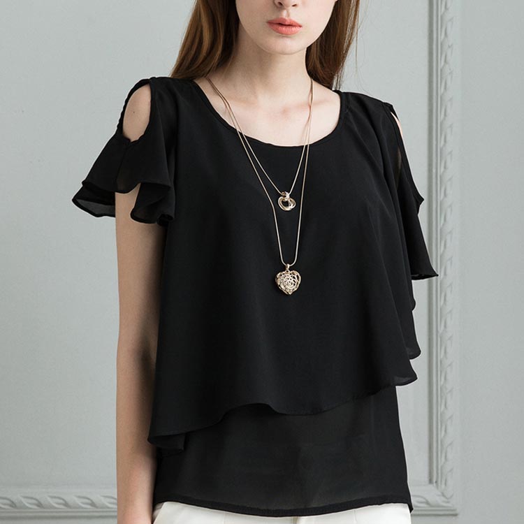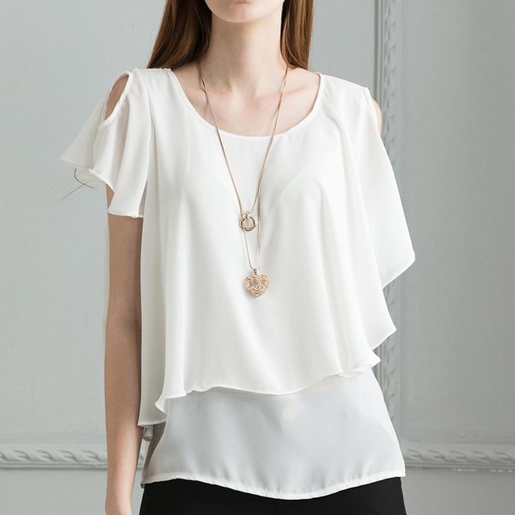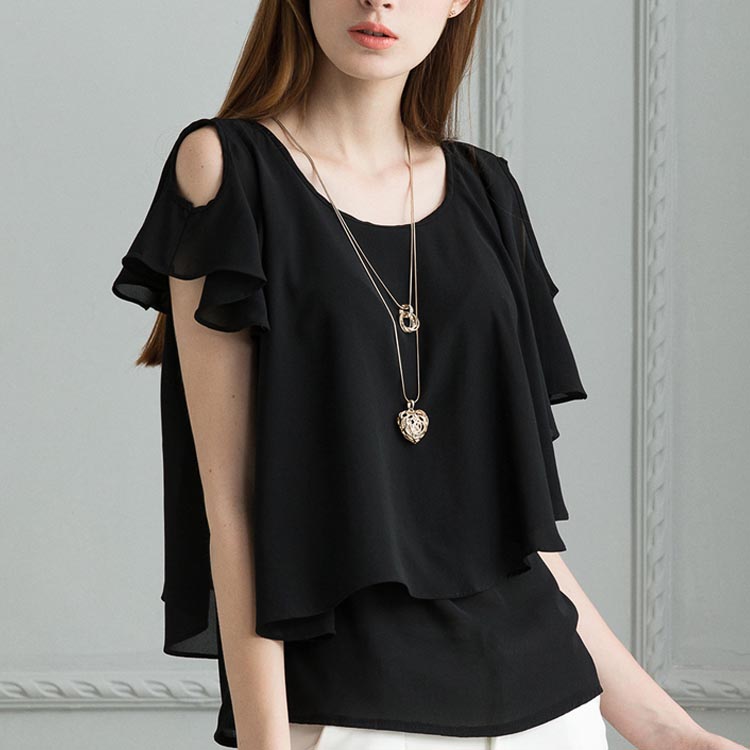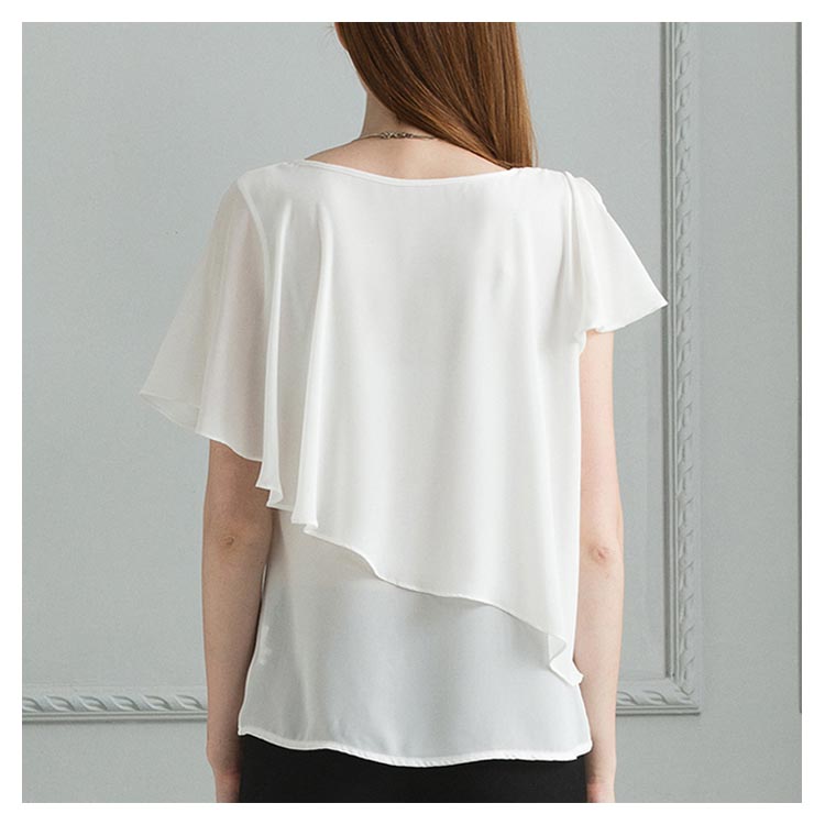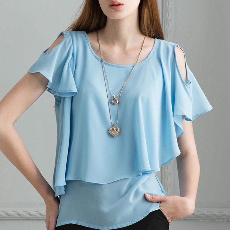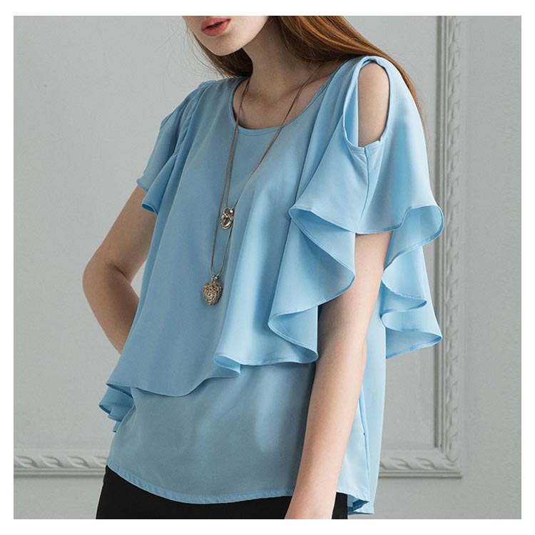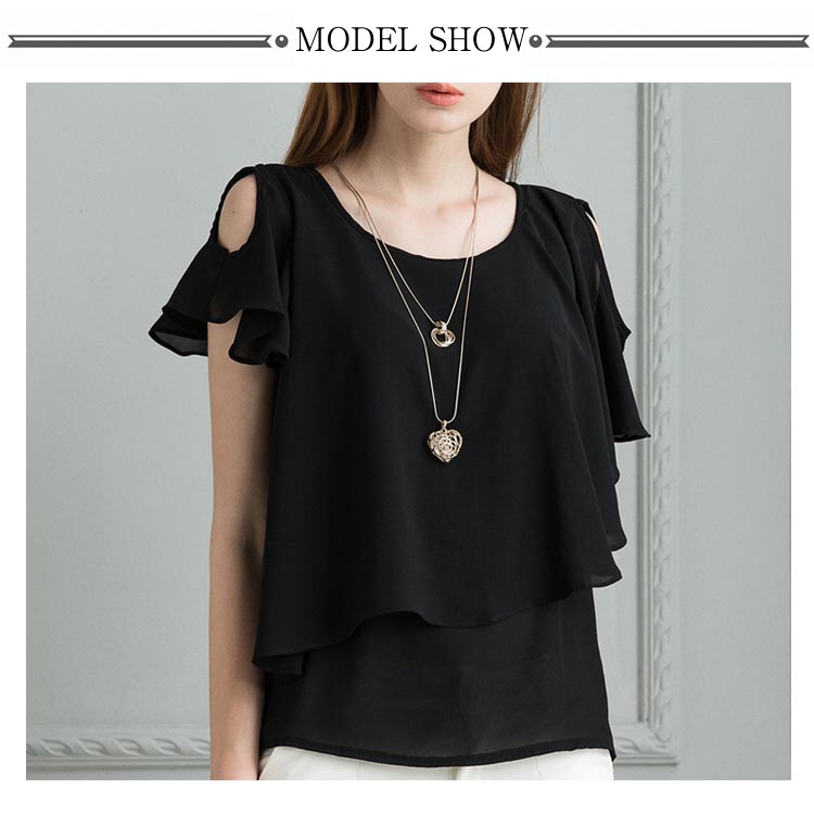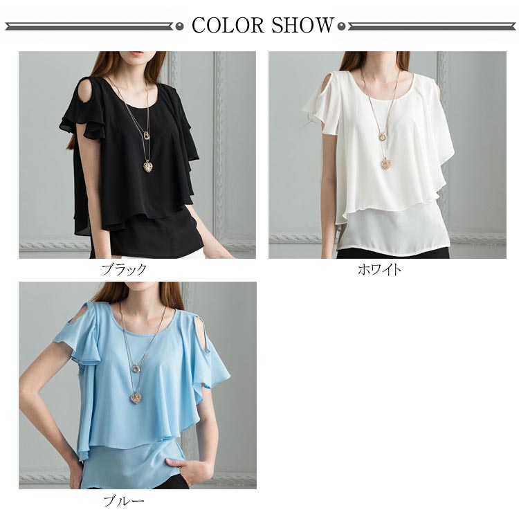 送料無料 ブラウス/レディース/半袖ブラウス/無地ブラウス/薄手ブラウス/フレアスリーブ/シフォン袖/透け感/肩あき/ラウンドネック/ゆったり/プルオーバー/トップス/お洒落/キレイめ/フェミニン/カジュアル/夏新作