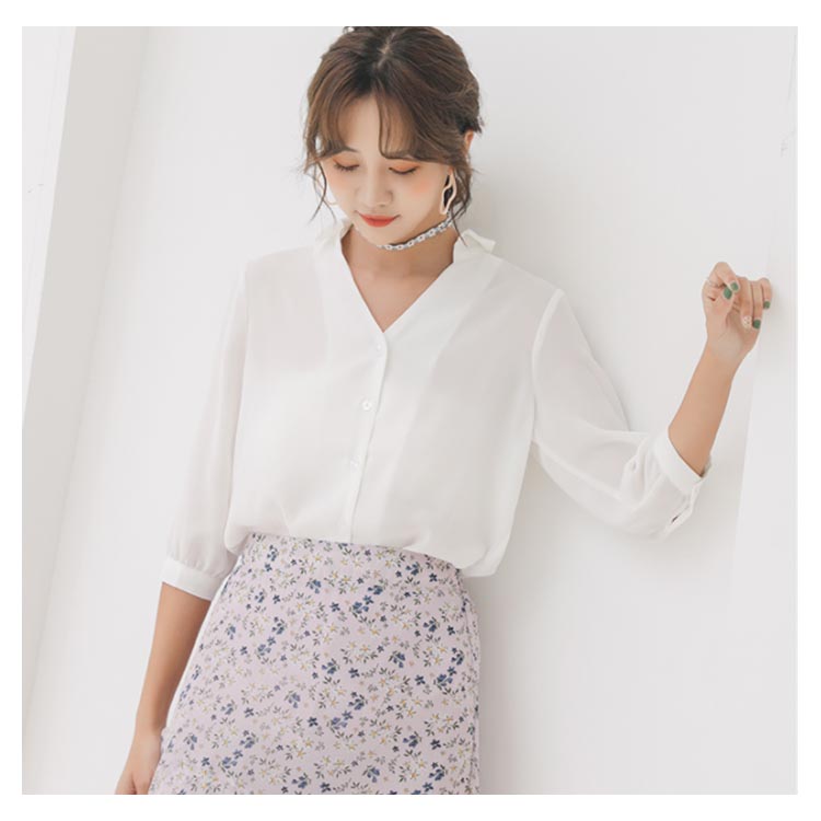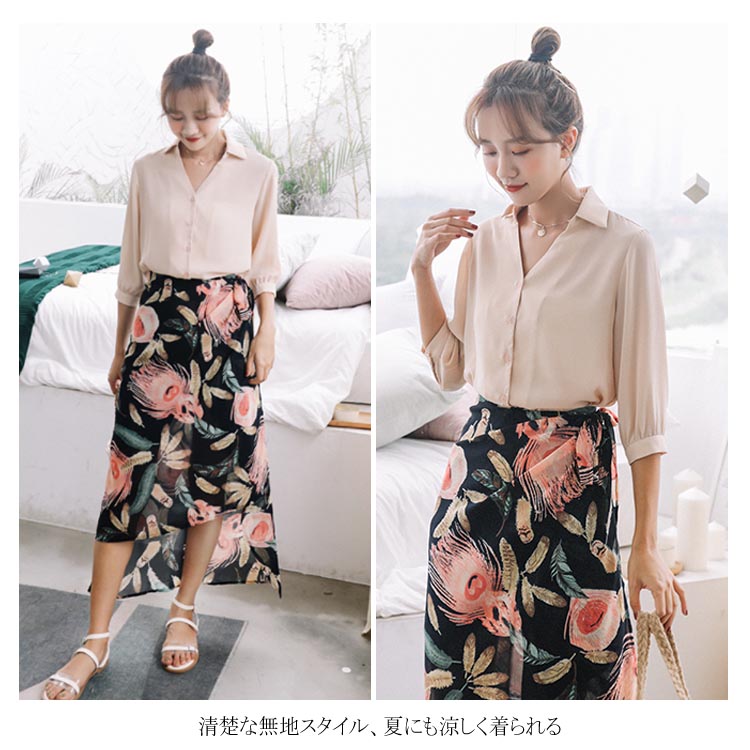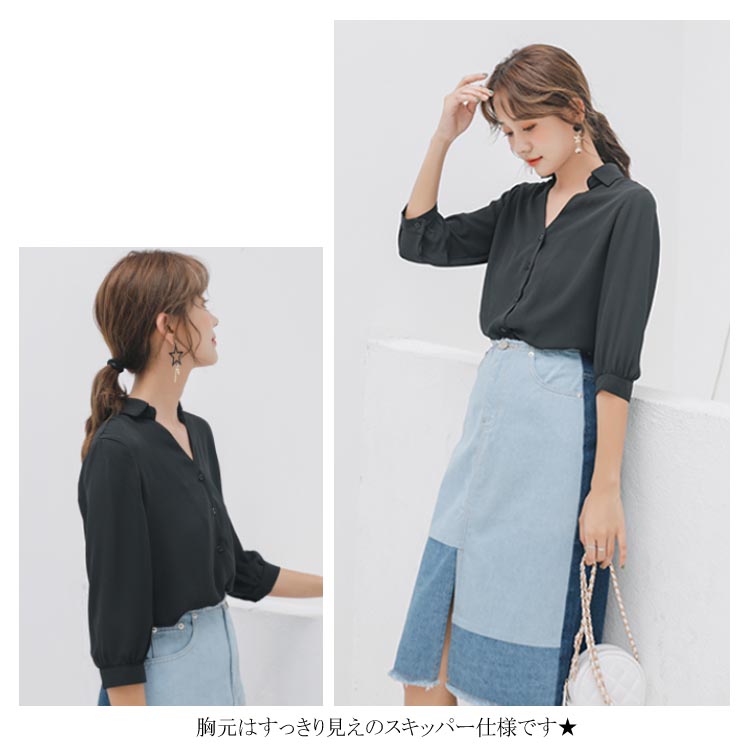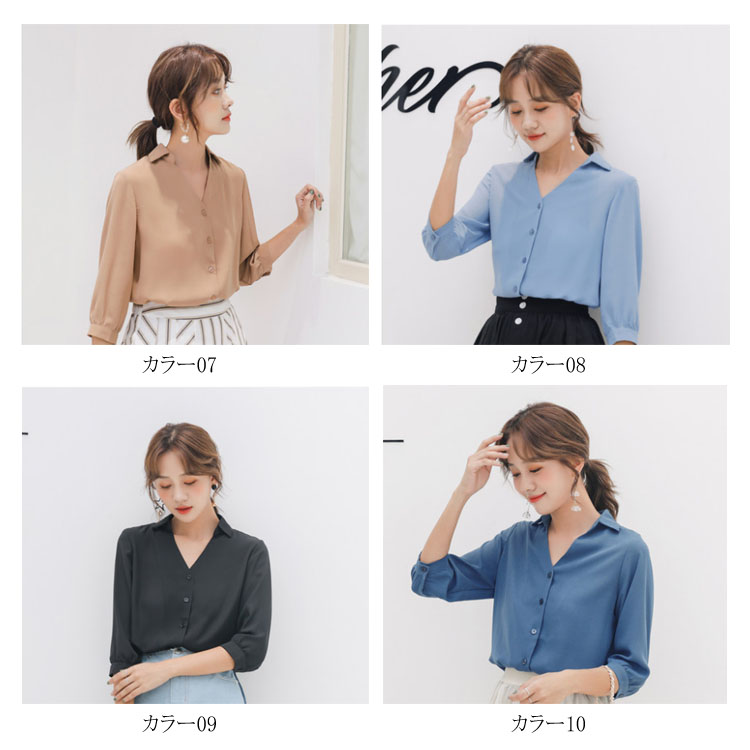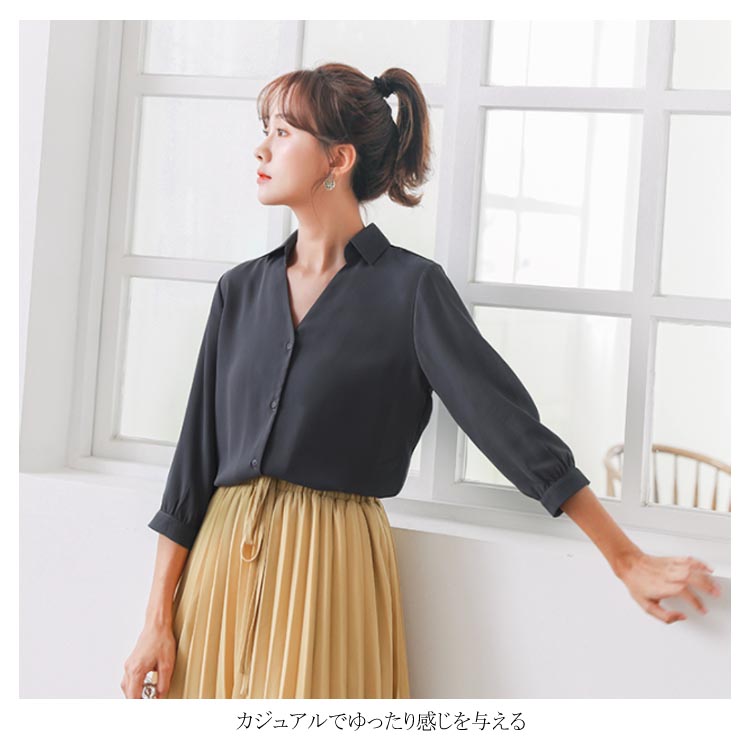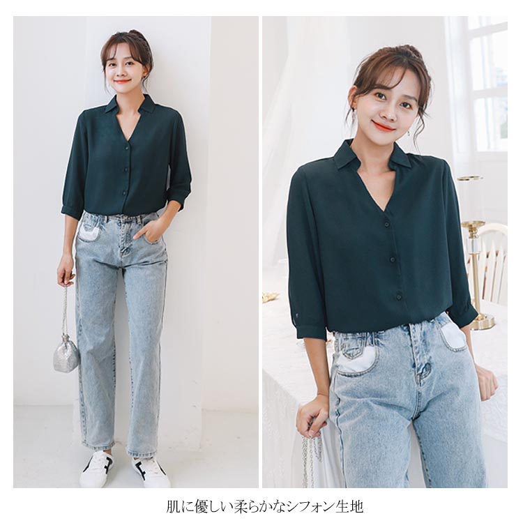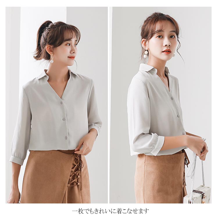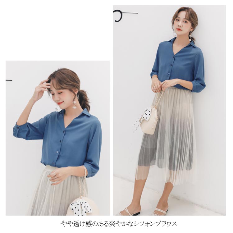 送料無料 ブラウス レディース シフォンブラウス シャツブラウス 七分袖 スキッパーシャツ Vネック 透かしブラウス 無地ブラウス キレイめ こなれ感 フェミニン こなれ感 トップス プルオーバー 春物 夏物 夏新作
