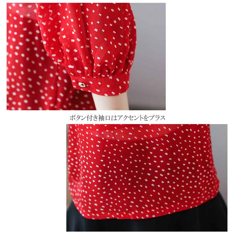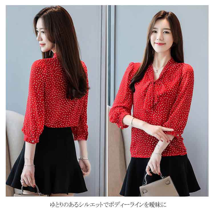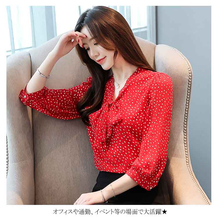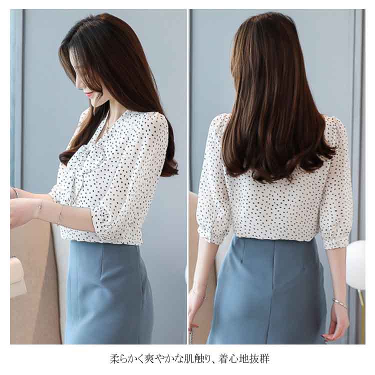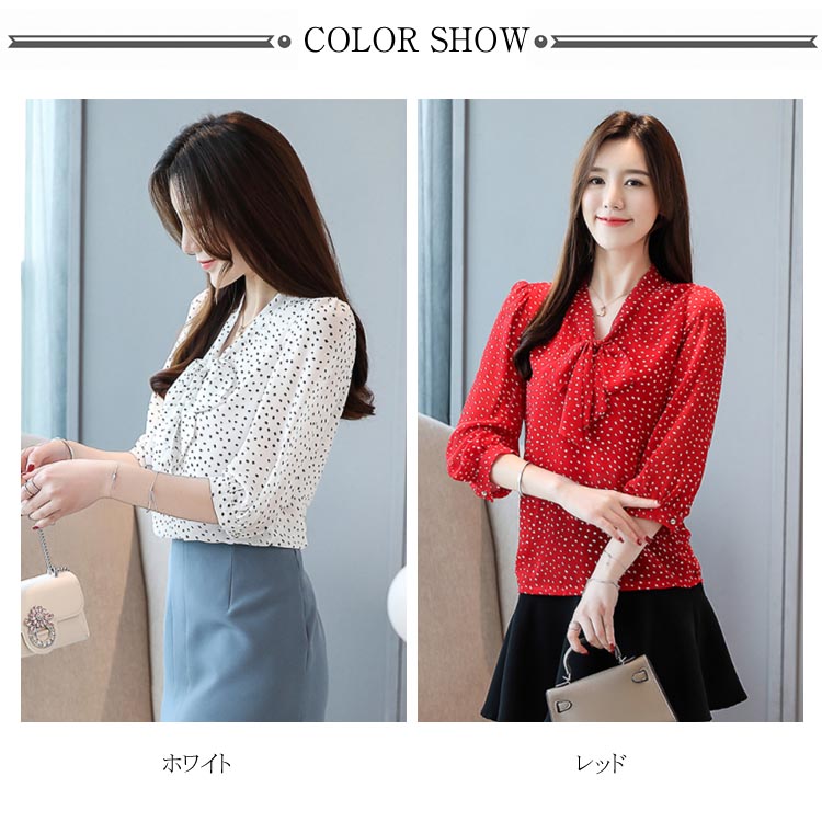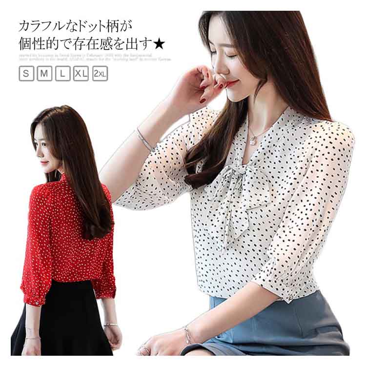 送料無料 シフォンブラウス レディース シャツブラウス 七分袖ブラウス ドット柄 ボウタイ カジュアルブラウス トップス リボン付き カラーバリ お洒落 通勤 上品 大人可愛い エレガント シンプル 夏新作