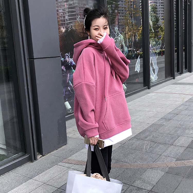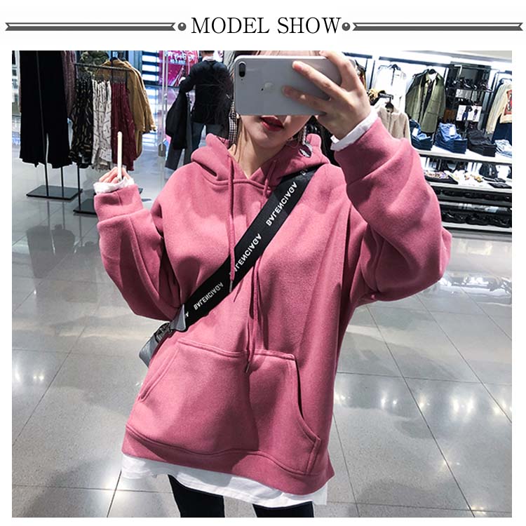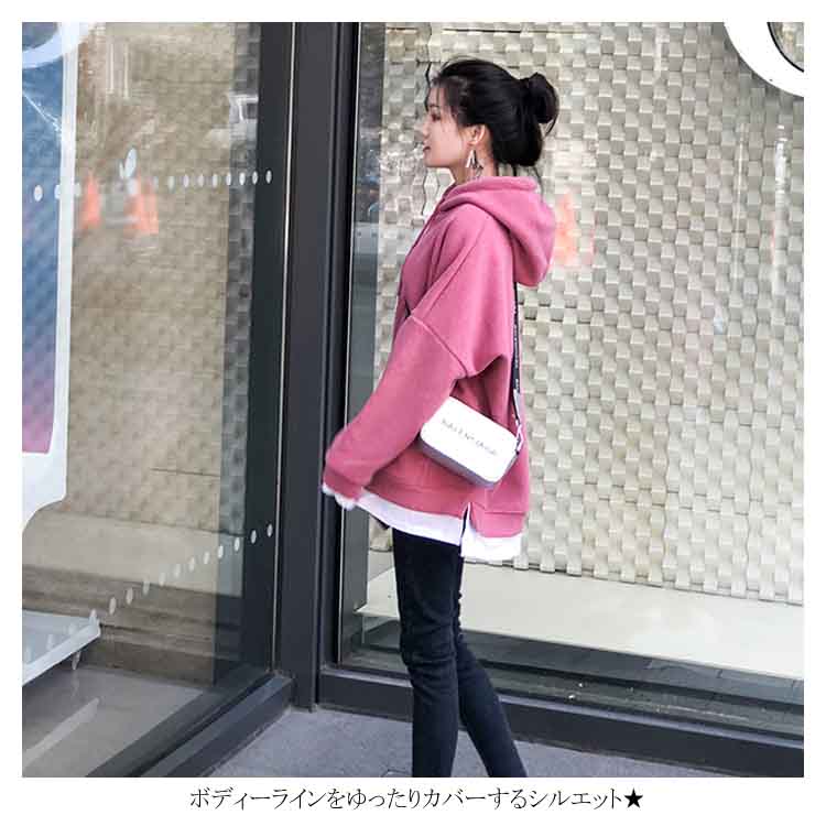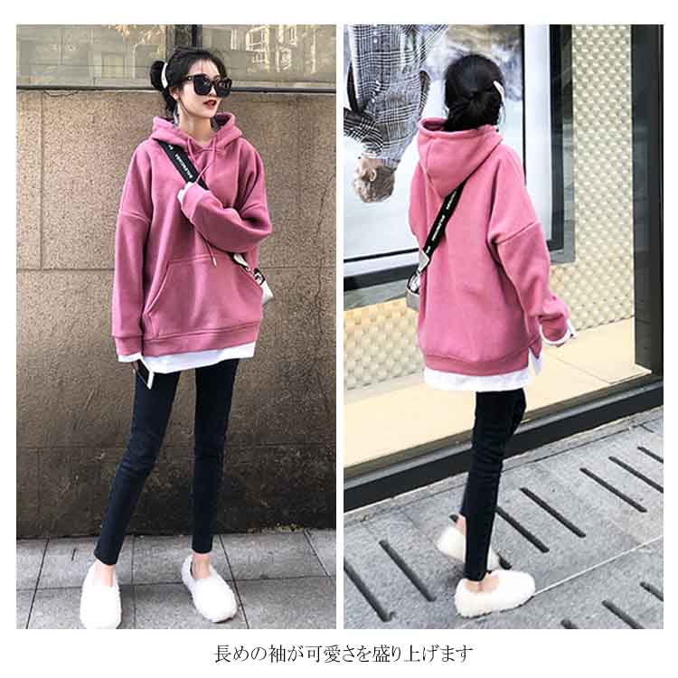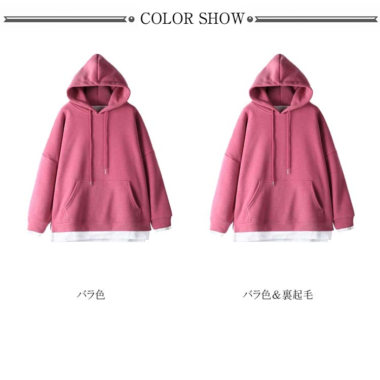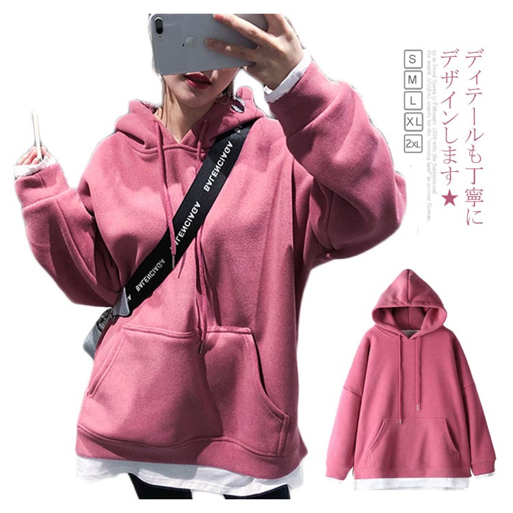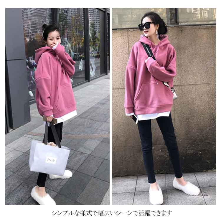 送料無料 パーカー レディース プルパーカー フード付き 長袖 ポケット付き 無地 重ね着 暖かい 厚かパーカー レイヤード かわいい シンプル カジュアル お洒落 体型カバー 普段着 プルオーバー トップス 夏新作