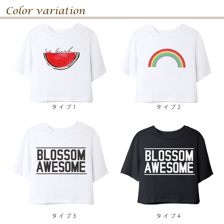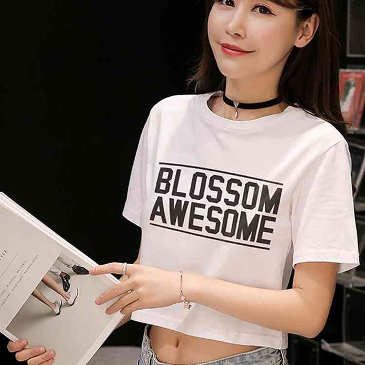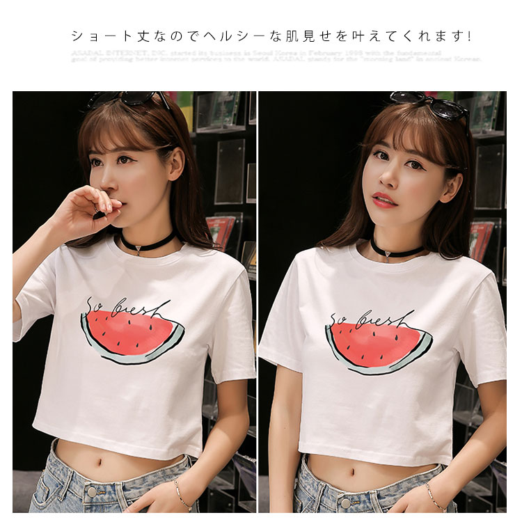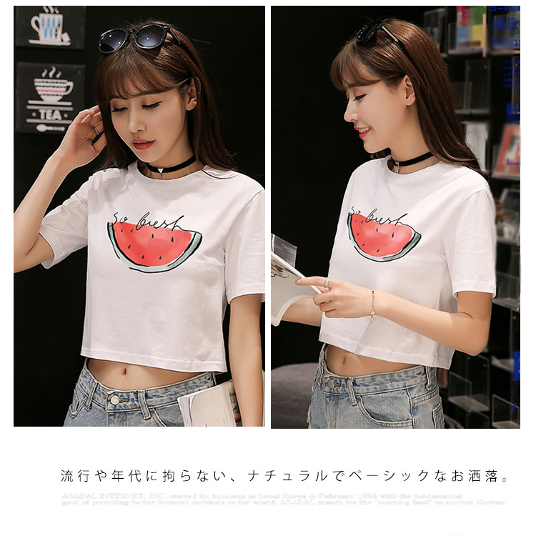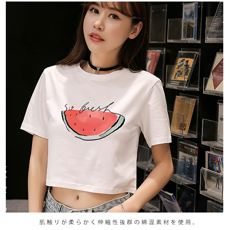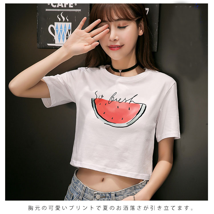 送料無料 Tシャツ 半袖 ラウンドネック コットン プリント トップス レディース 夏服 ショート丈 へそ出し ホワイト シンプル 新作 お洒落 着痩せ