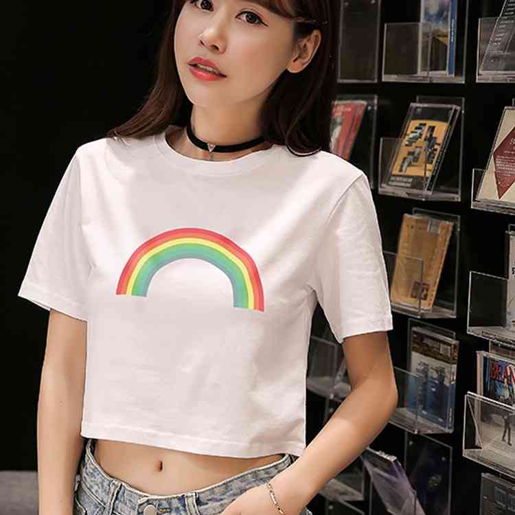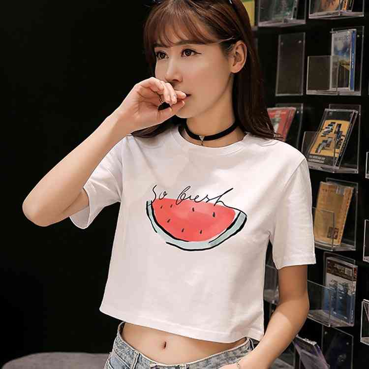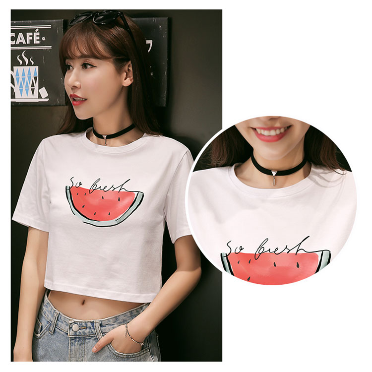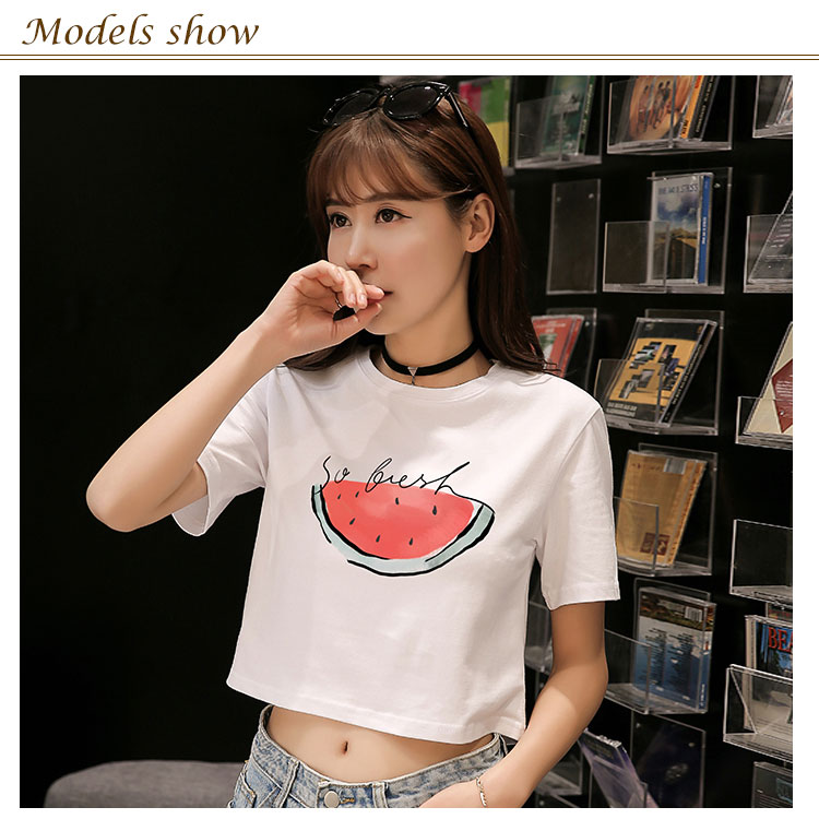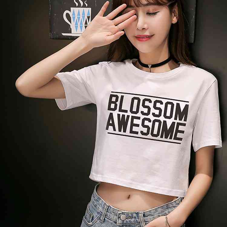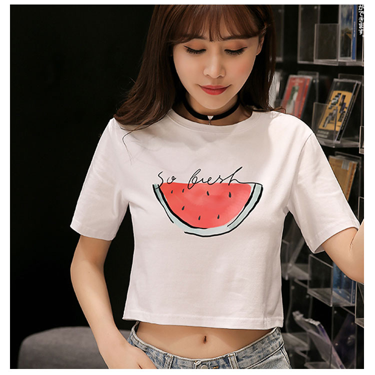 送料無料 Tシャツ 半袖 ラウンドネック コットン プリント トップス レディース 夏服 ショート丈 へそ出し ホワイト シンプル 新作 お洒落 着痩せ