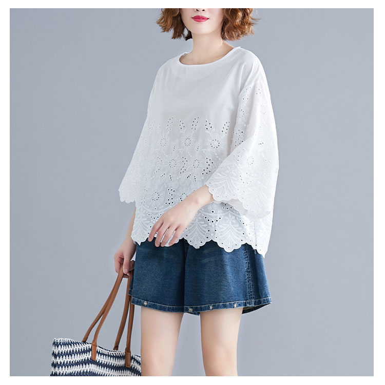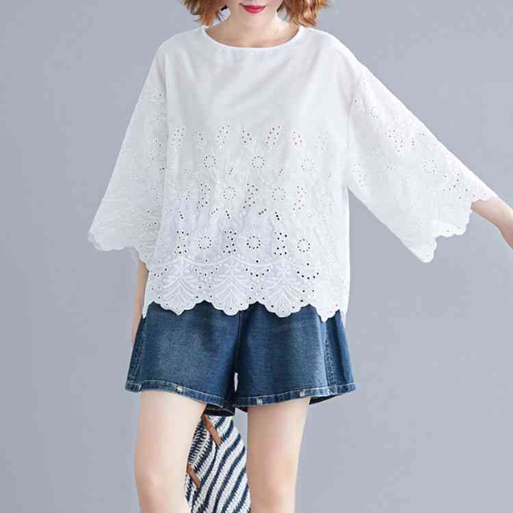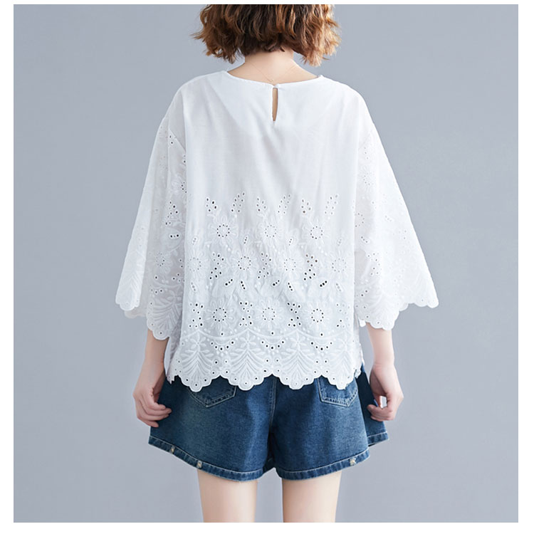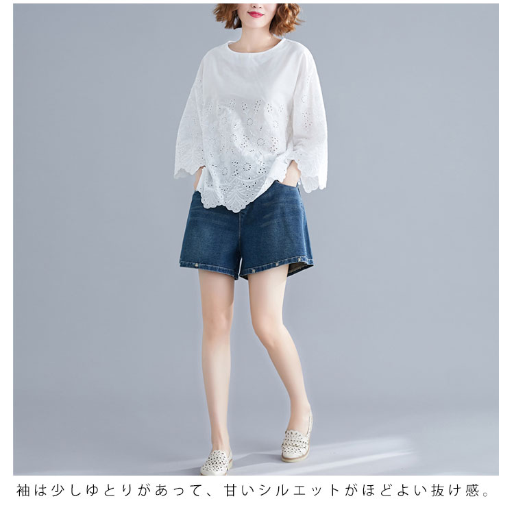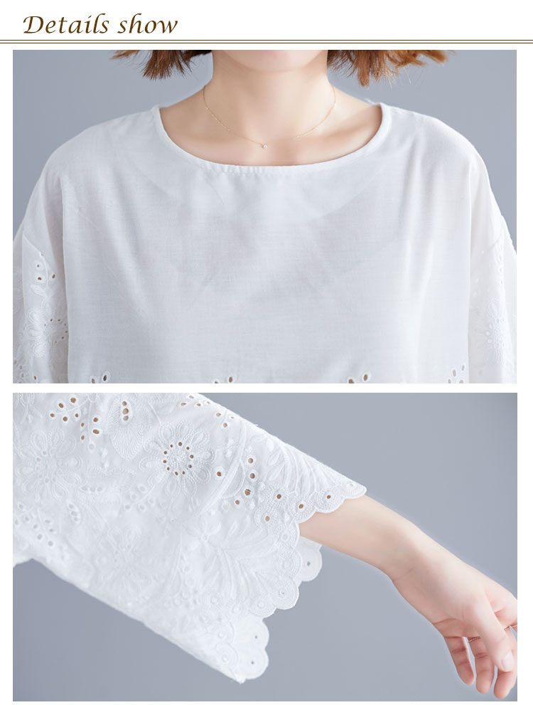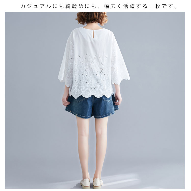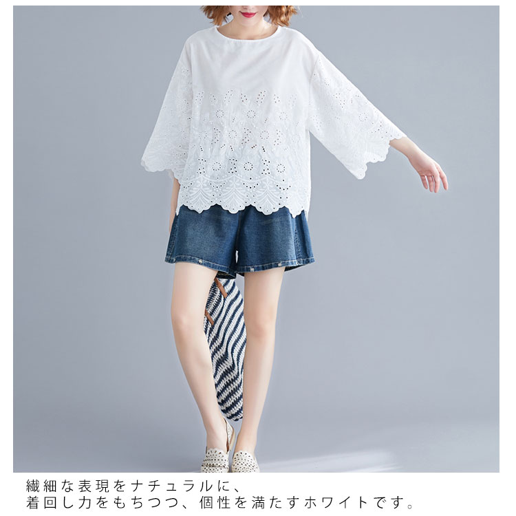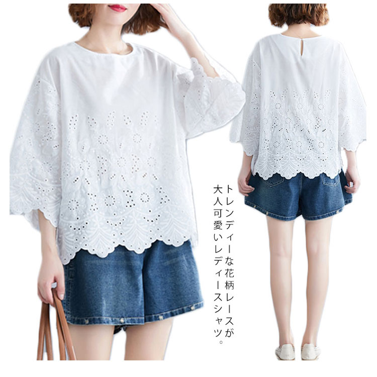 送料無料 シャツ 7分袖 レースシャツ ワイドシャツ トップス 白シャツ ブラウス レディース 大人可愛い 綿麻混 ホワイト 無地 刺繍レース