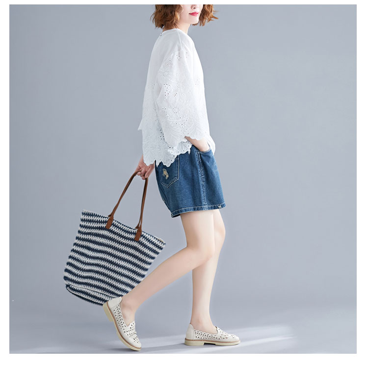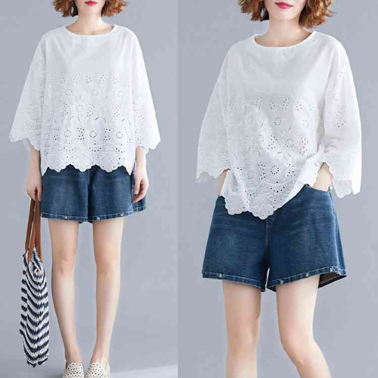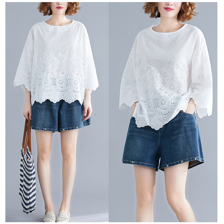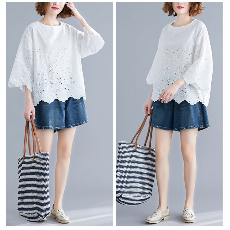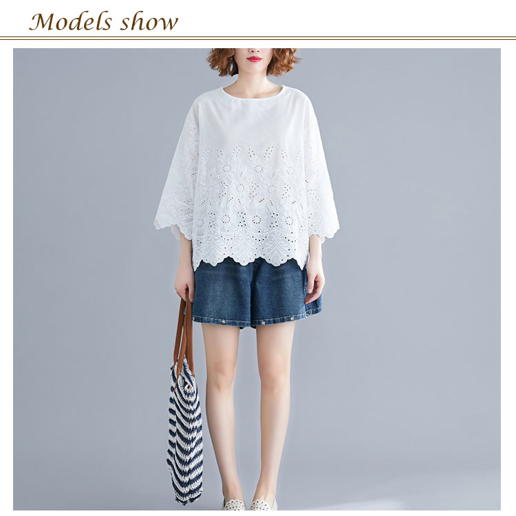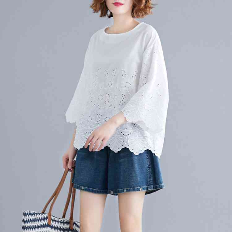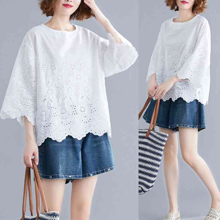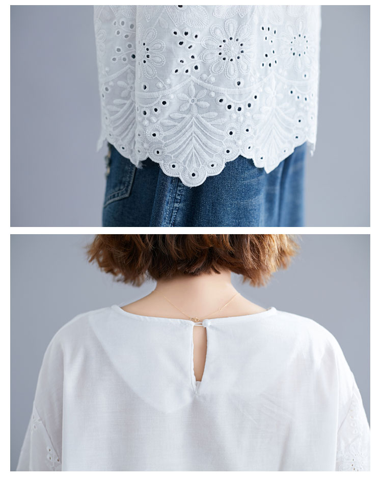 送料無料 シャツ 7分袖 レースシャツ ワイドシャツ トップス 白シャツ ブラウス レディース 大人可愛い 綿麻混 ホワイト 無地 刺繍レース