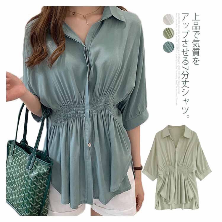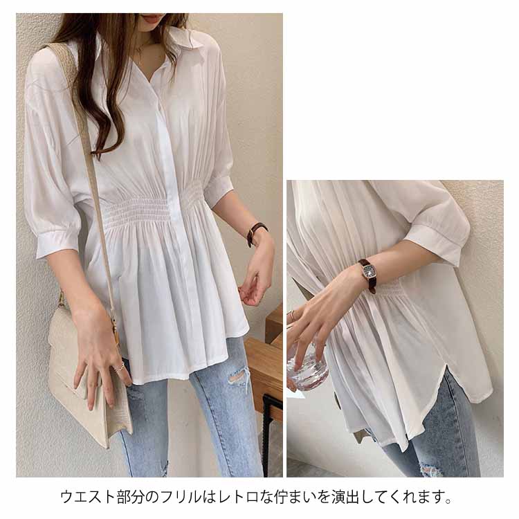 送料無料 シャツ ブラウス 7分袖 着痩せ フリル 綿混紡 薄手 トップス レディース シンプル ゆったり カジュアル お洒落