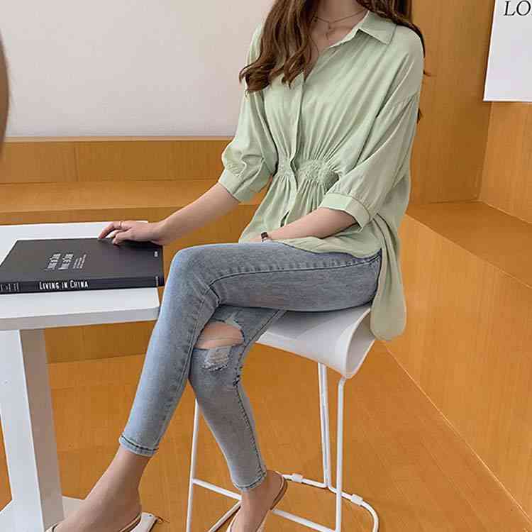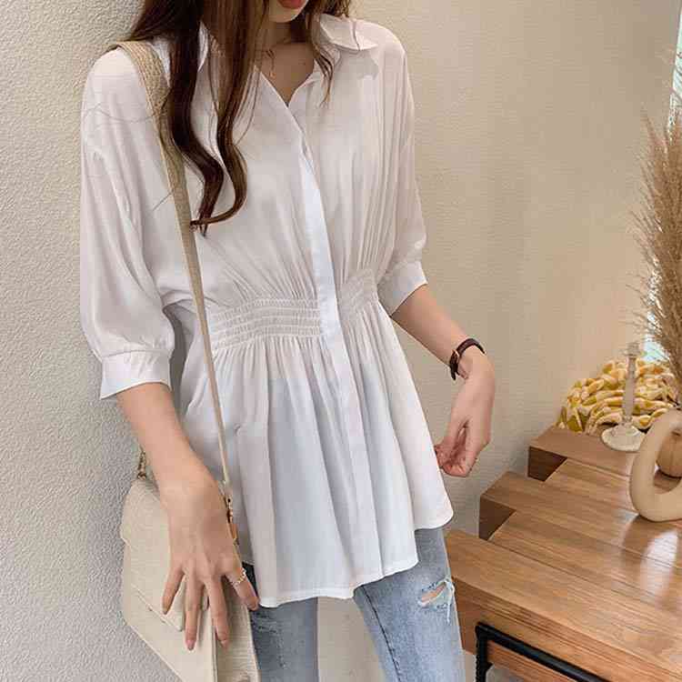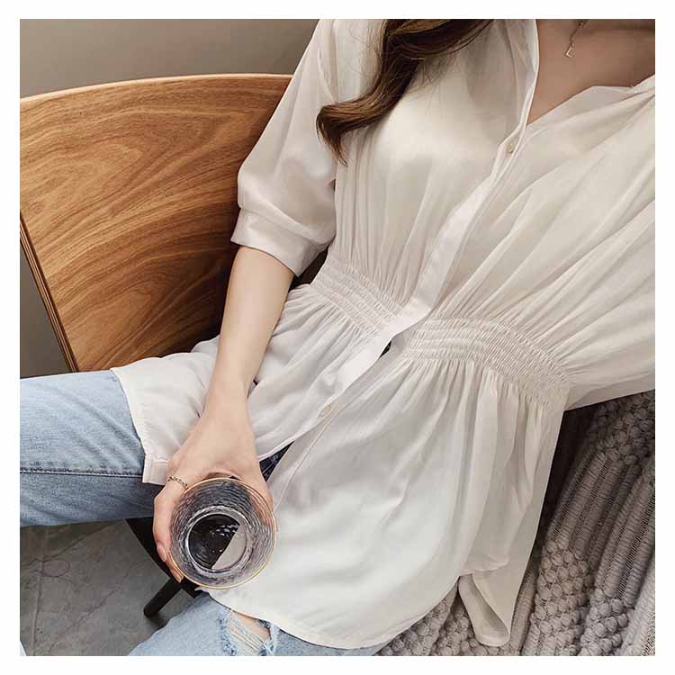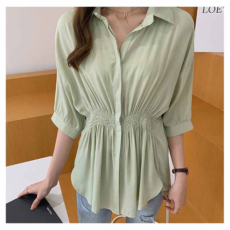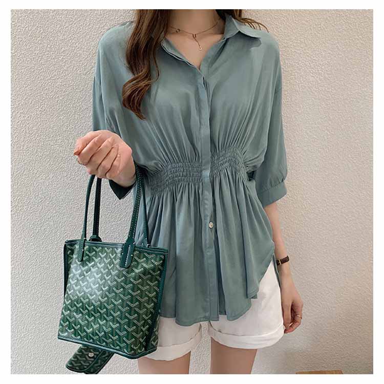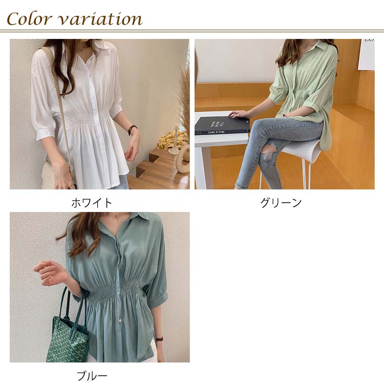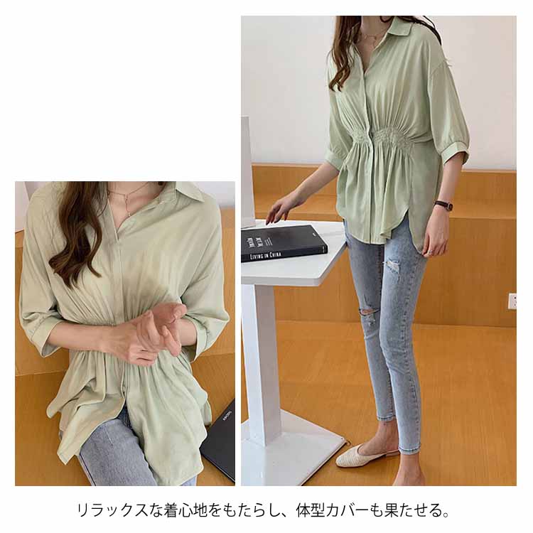 | 上品で気質をアップさせる7分丈シャツ。 ナチュラルに開いた襟部分は首元と鎖骨あたりの色気を強調。 ウエスト部分のフリルはレトロな佇まいを演出してくれます。 リラックスな着心地をもたらし、体型カバーも果たせる。 通勤にも日常にも、パンツにもスカートにも、ファッションを自由に楽しめる一枚。 | |