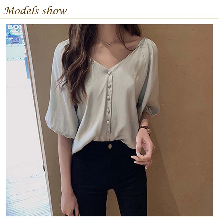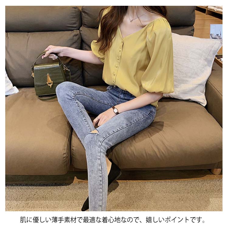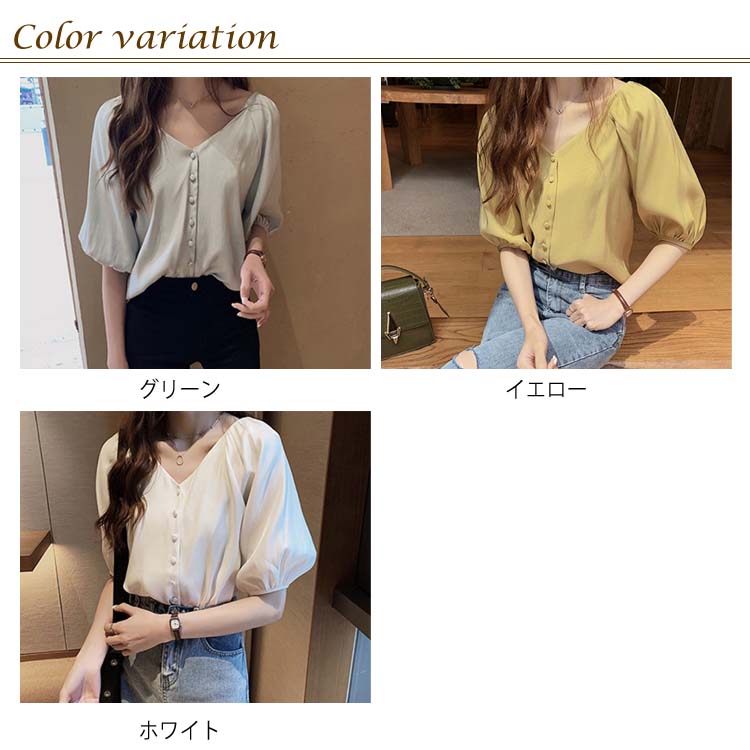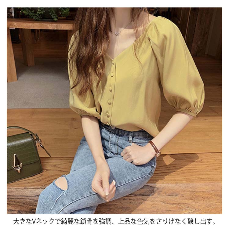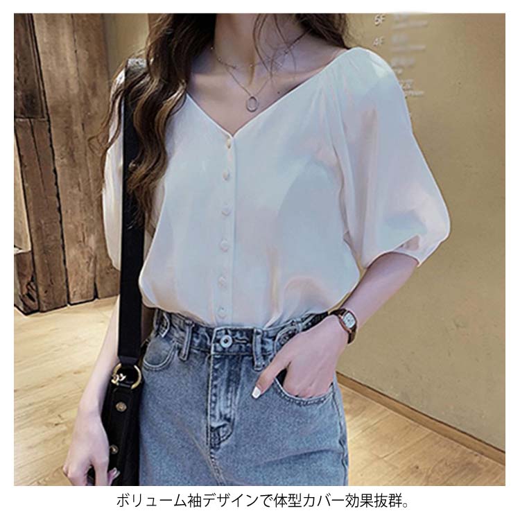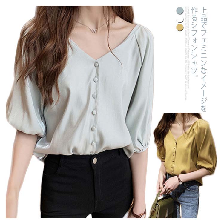 送料無料 シャツ シフォン ブラウス 5分袖 着痩せ Vネック シフォンシャツ 薄手 ボリューム袖 トップス シンプル レディース ゆったり カジュアル お洒落