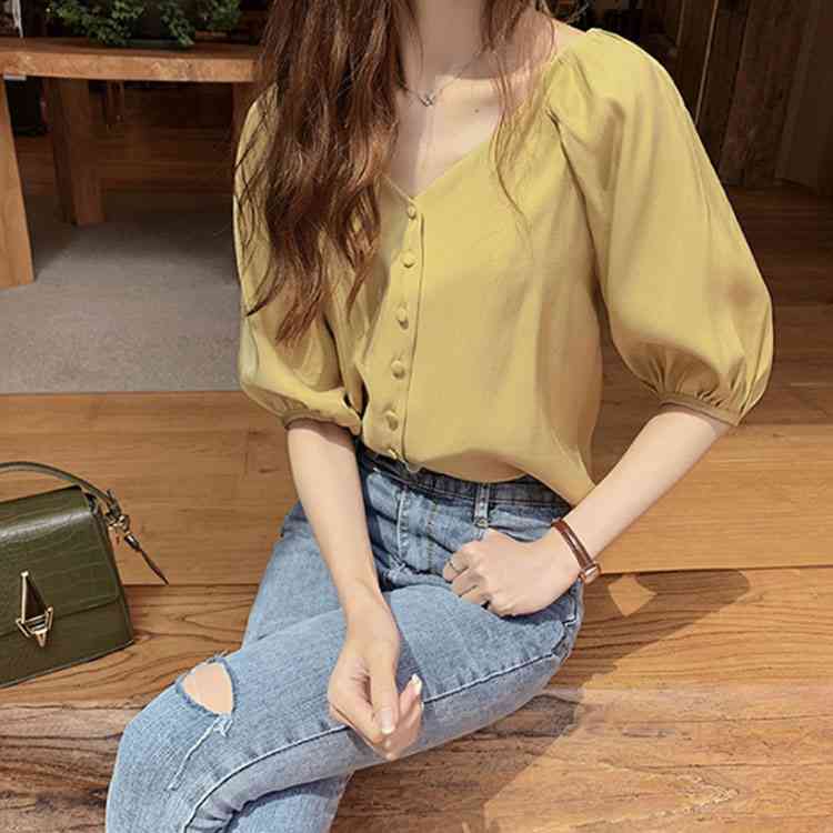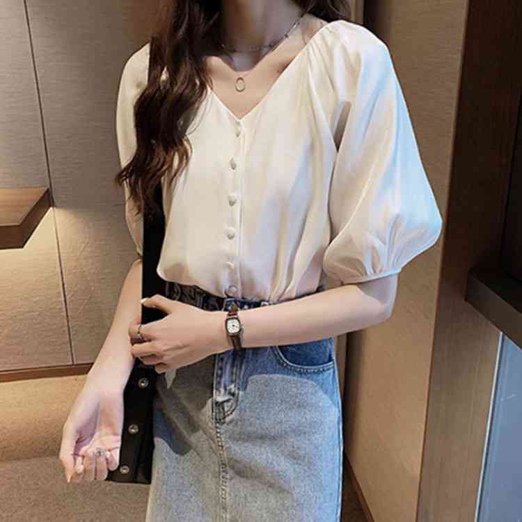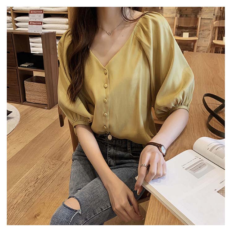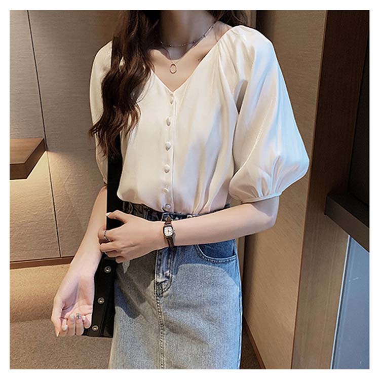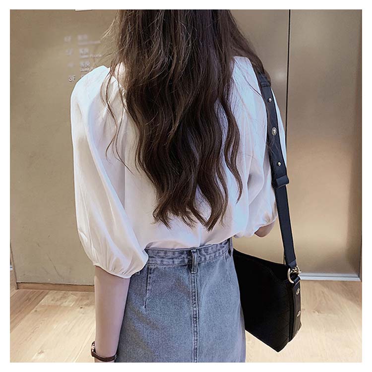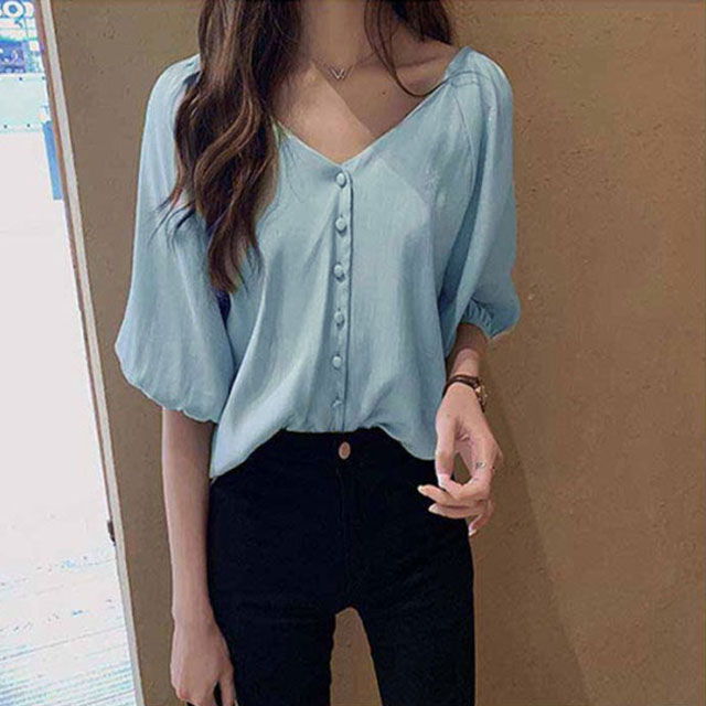 送料無料 シャツ シフォン ブラウス 5分袖 着痩せ Vネック シフォンシャツ 薄手 ボリューム袖 トップス シンプル レディース ゆったり カジュアル お洒落