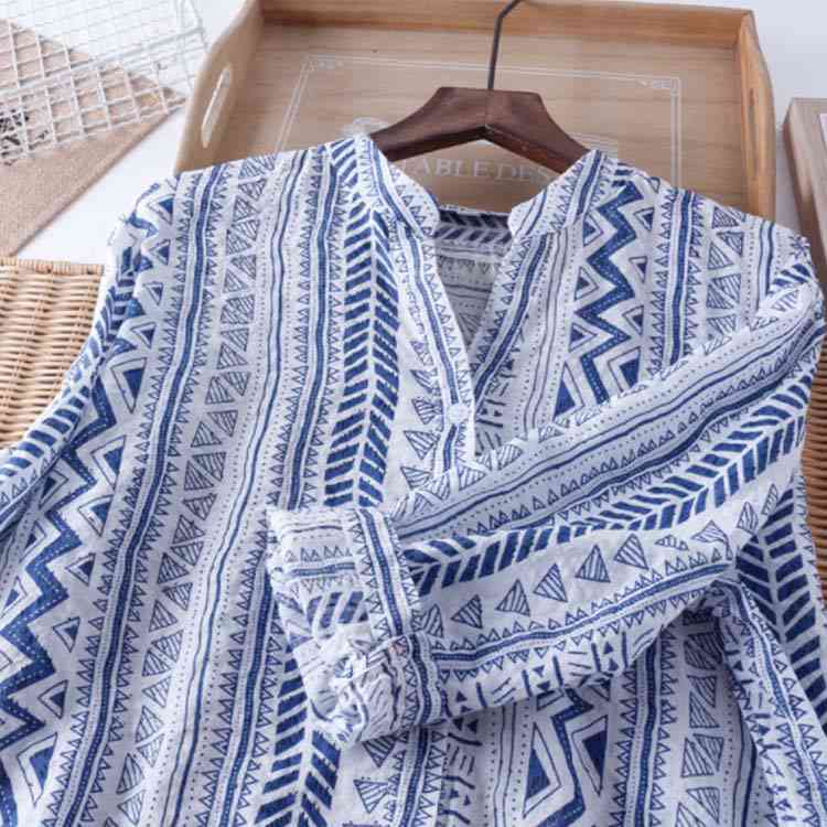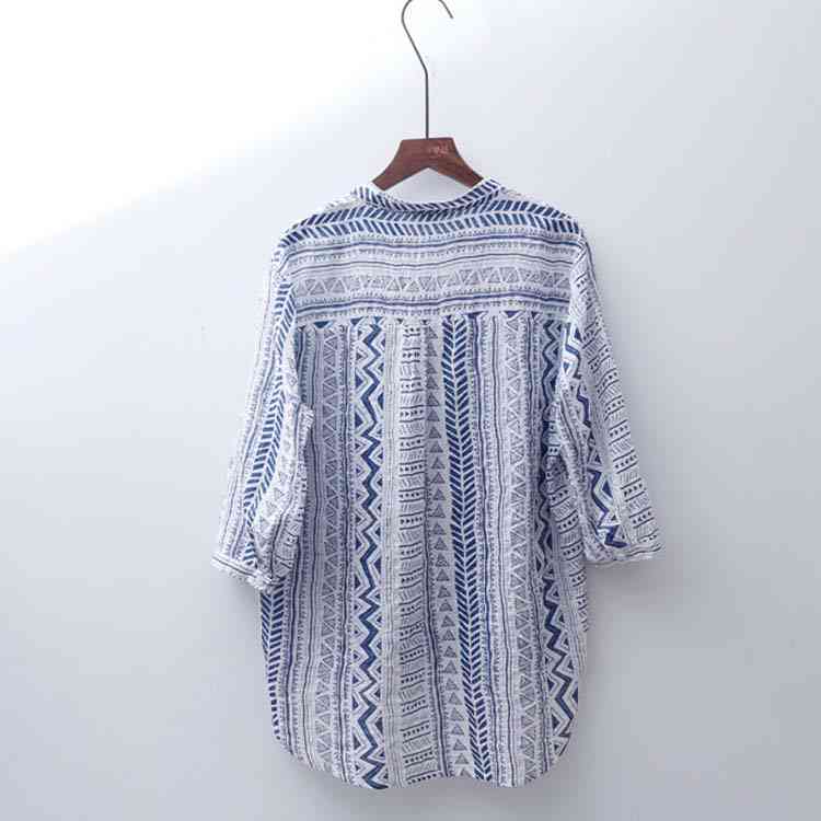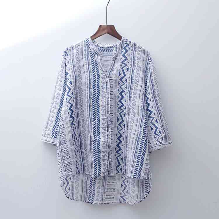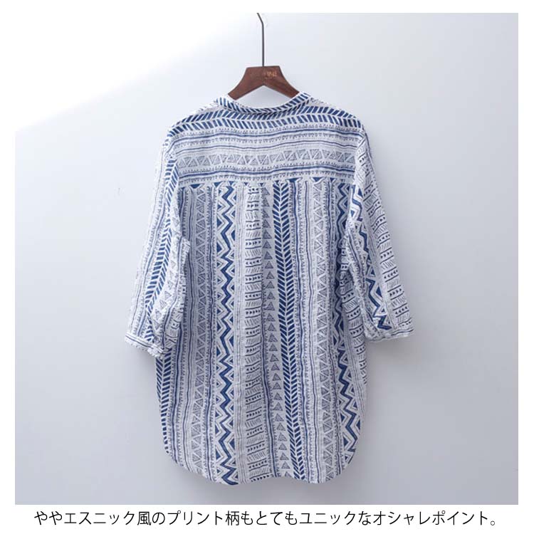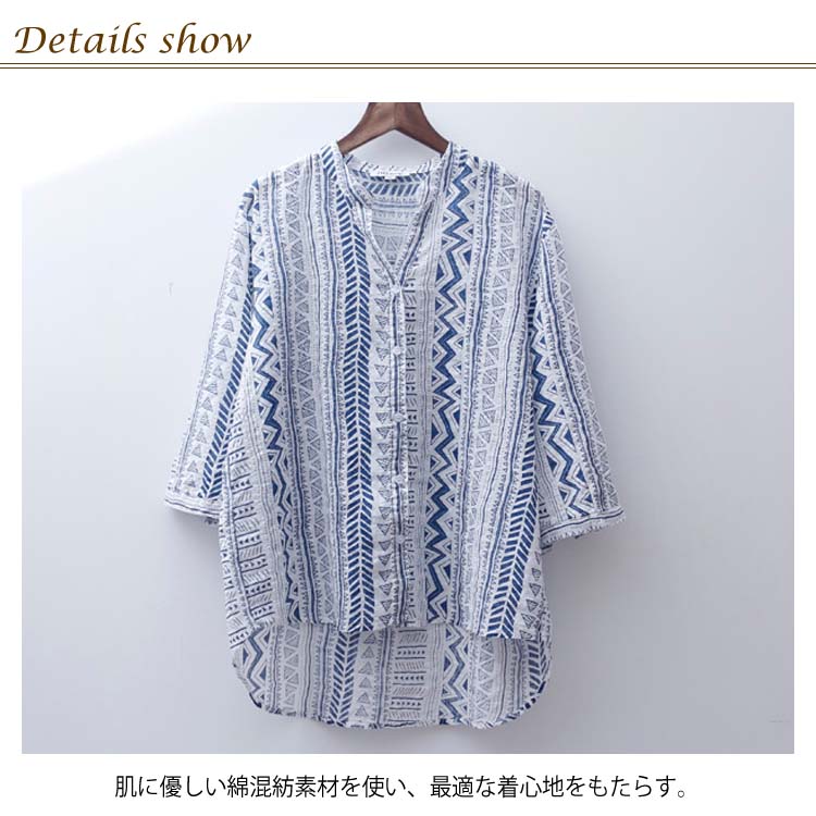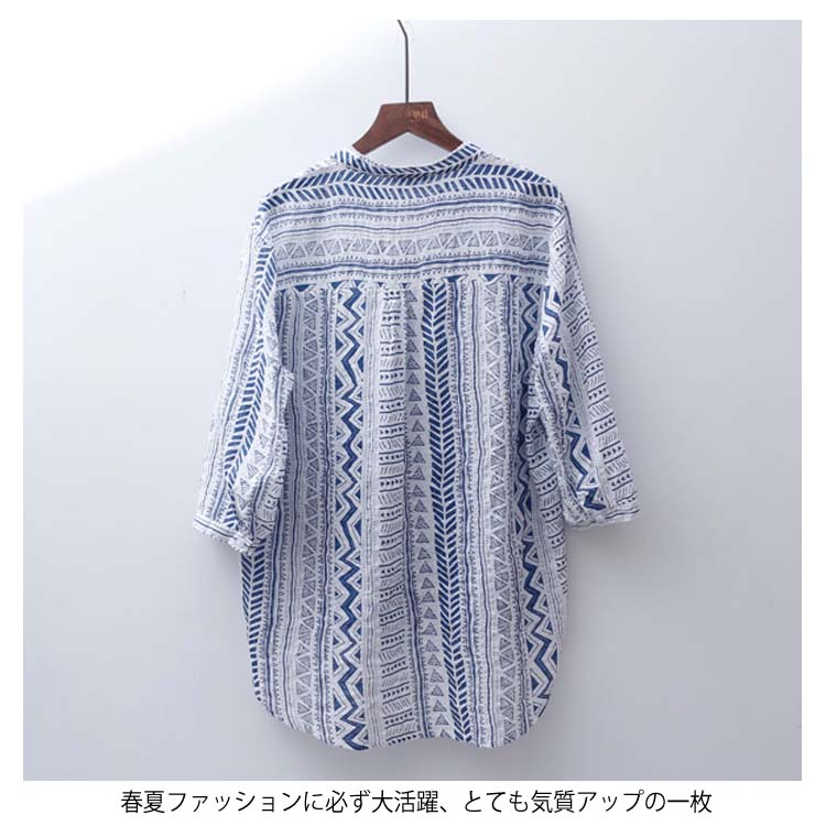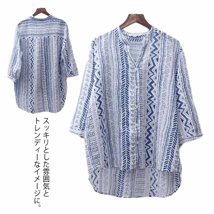 送料無料 シャツ ブラウス 7分袖 着痩せ Vネック プリント 薄手 透け感 綿麻シャツ トップス シンプル レディース ゆったり カジュアル お洒落