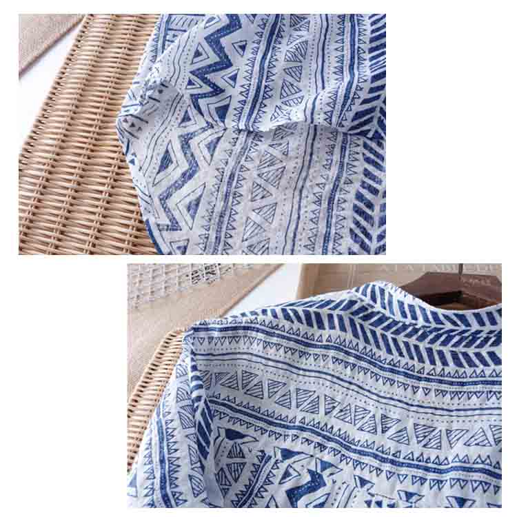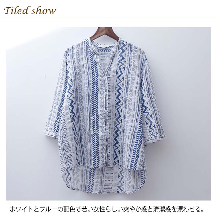 | スッキリとした雰囲気とトレンディーなイメージに。 ホワイトとブルーの配色で若い女性らしい爽やか感と清潔感を漂わせる。 肌に優しい綿混紡素材を使い、最適な着心地をもたらす。 ややエスニック風のプリント柄もとてもユニックなオシャレポイント。 春夏ファッションに必ず大活躍、とても気質アップの一枚 | |