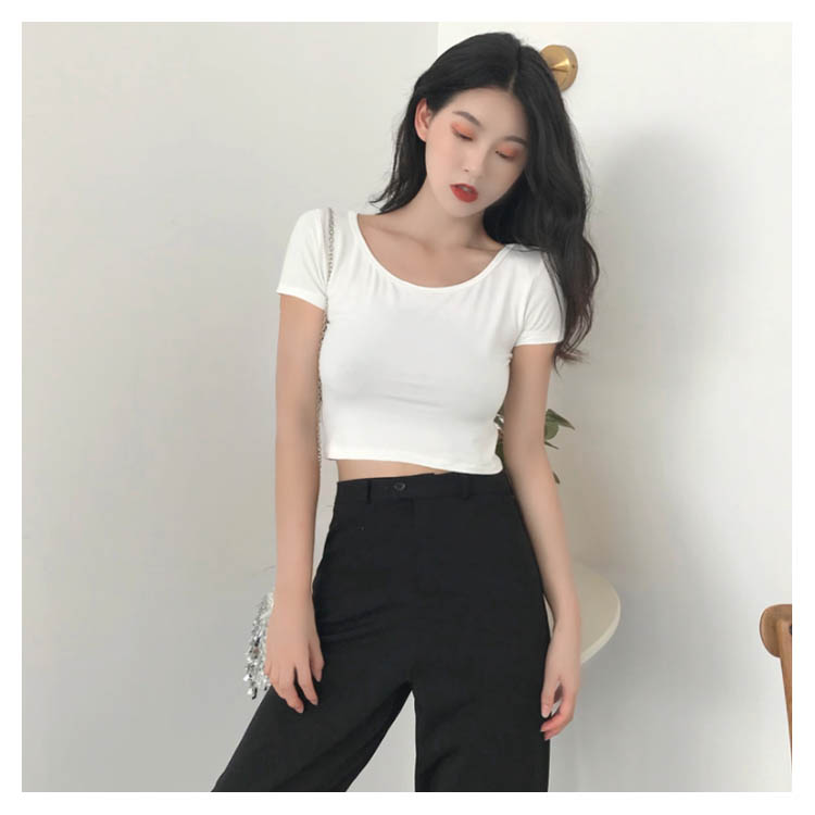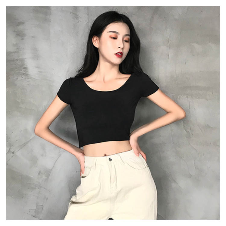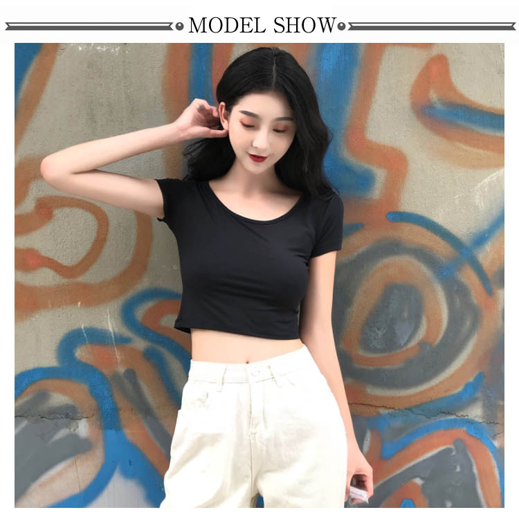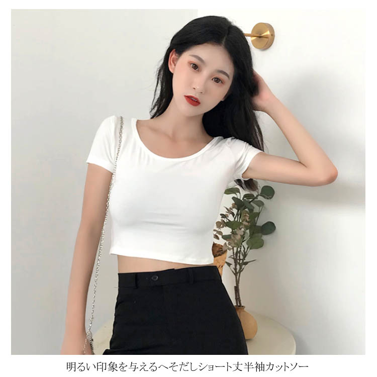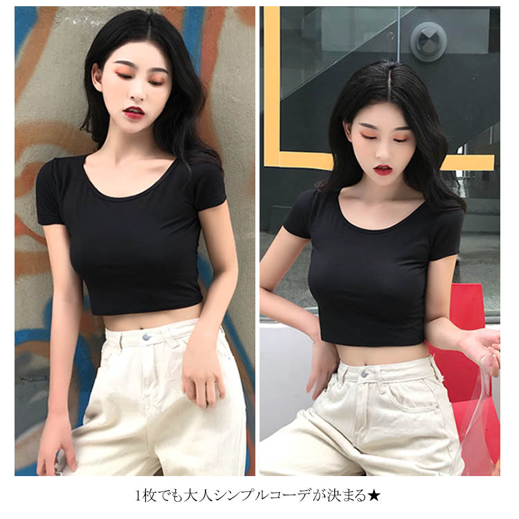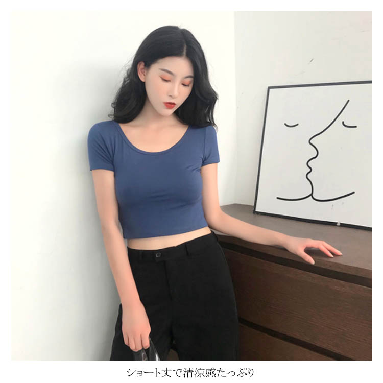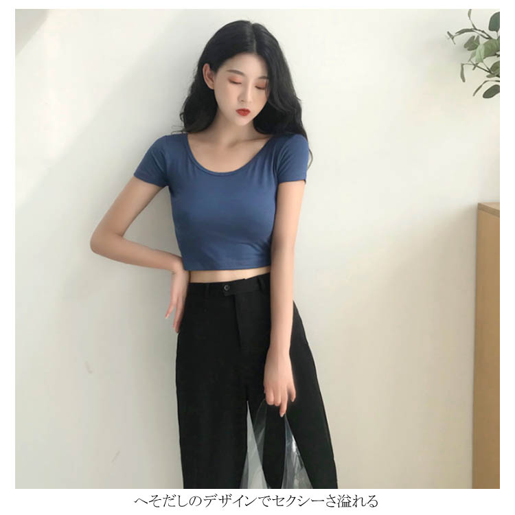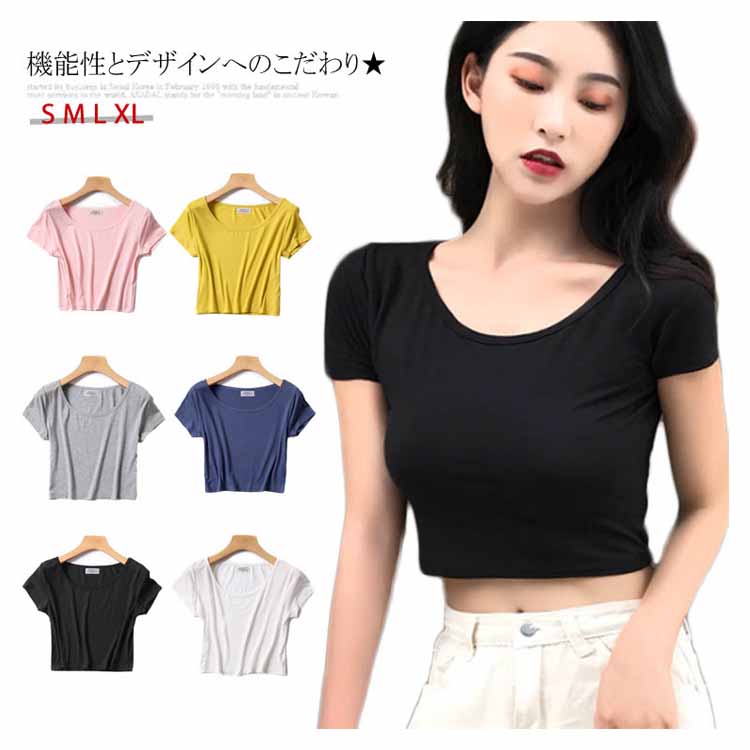 送料無料 Tシャツ レディース 半袖Tシャツ へそだし ラウンドネック ストレッチ 伸縮性 ショート丈 ショートTシャツ トップス プルオーバー お洒落 カジュアル シンプル リラックス 夏物 新作