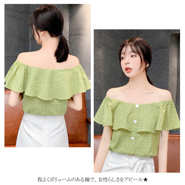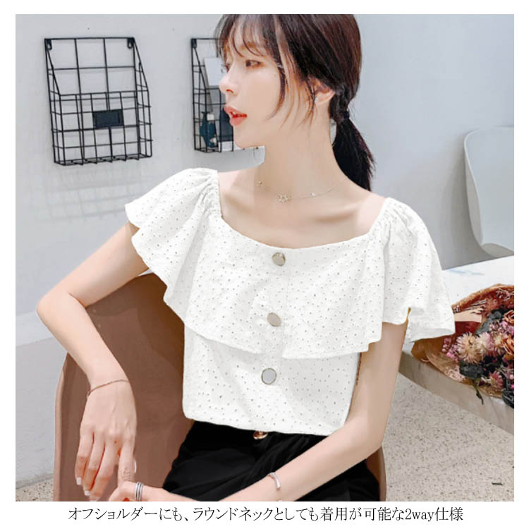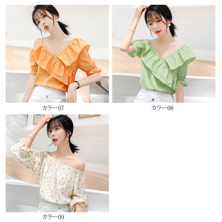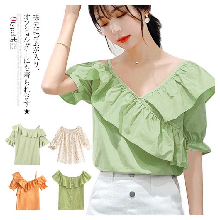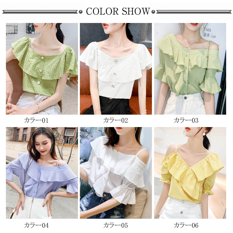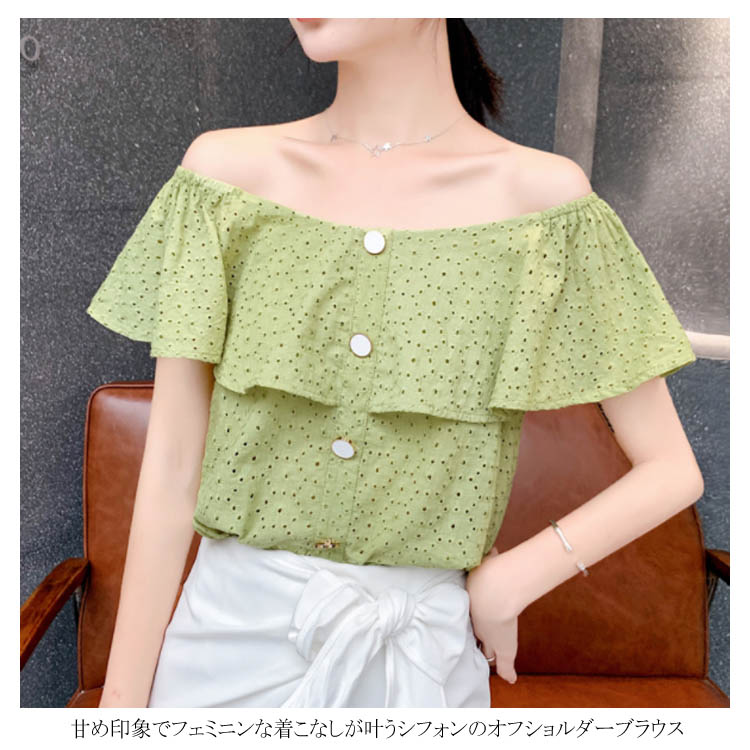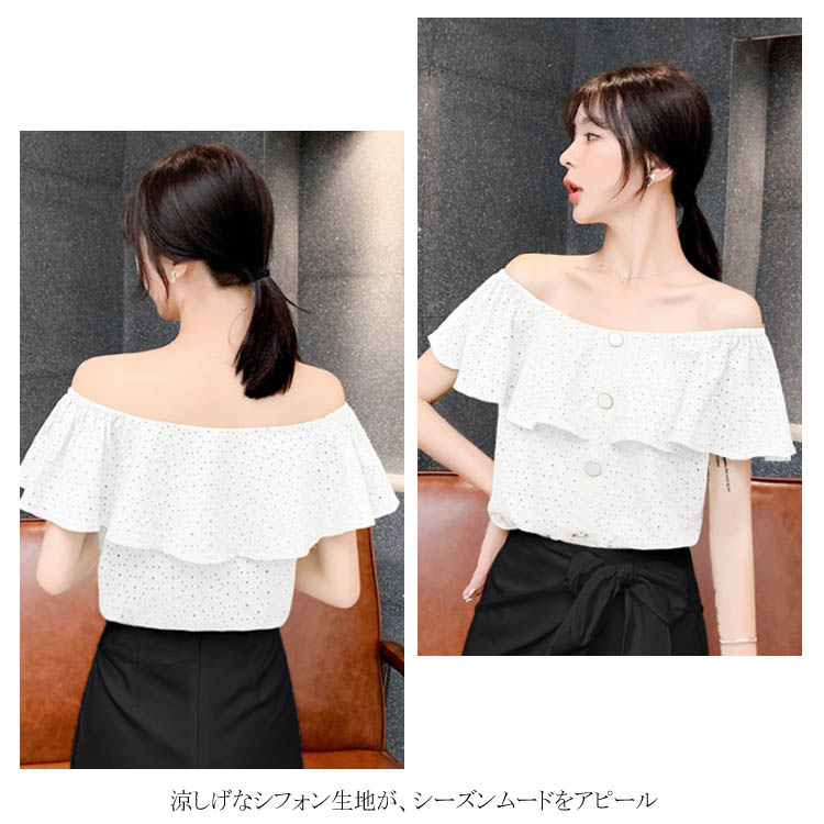 送料無料 オフショルダー レディース シフォンブラウス 半袖 オフショルブラウス シフォン ボタン付き フリル ボリュームスリーブ 薄手 ゆったり お洒落 キレイめ こなれ感 大人 トップス 春夏 夏新作