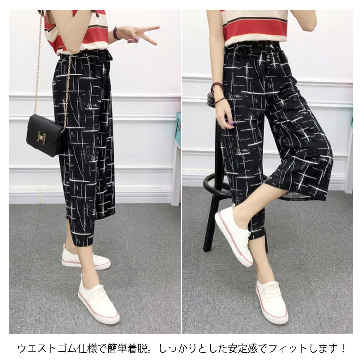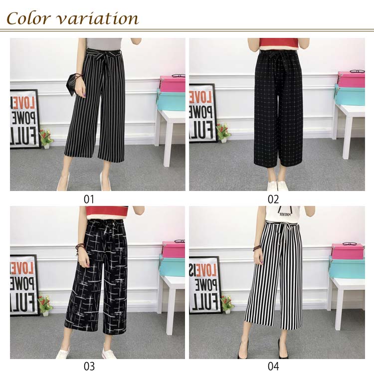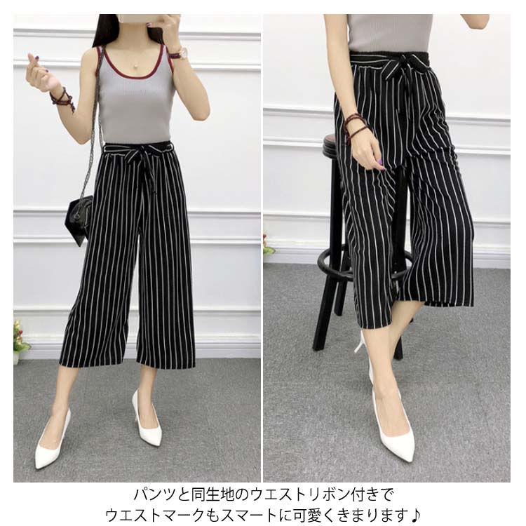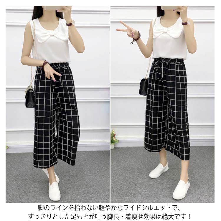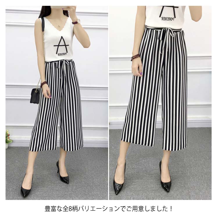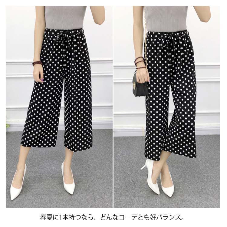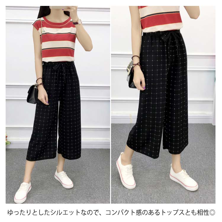 《送料無料》全8パターン!ウエストリボン付き ワイドパンツ ストライプ柄 ドット柄 チェック柄 無地 ガウチョパンツ 7分丈 ガウチョ パンツ 薄手 美脚 リラックス カジュアル キレイめ