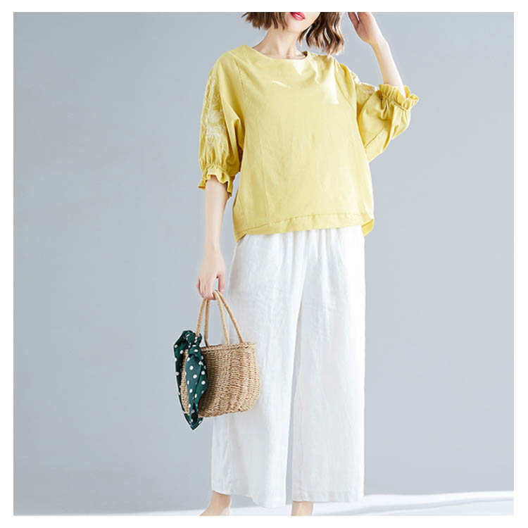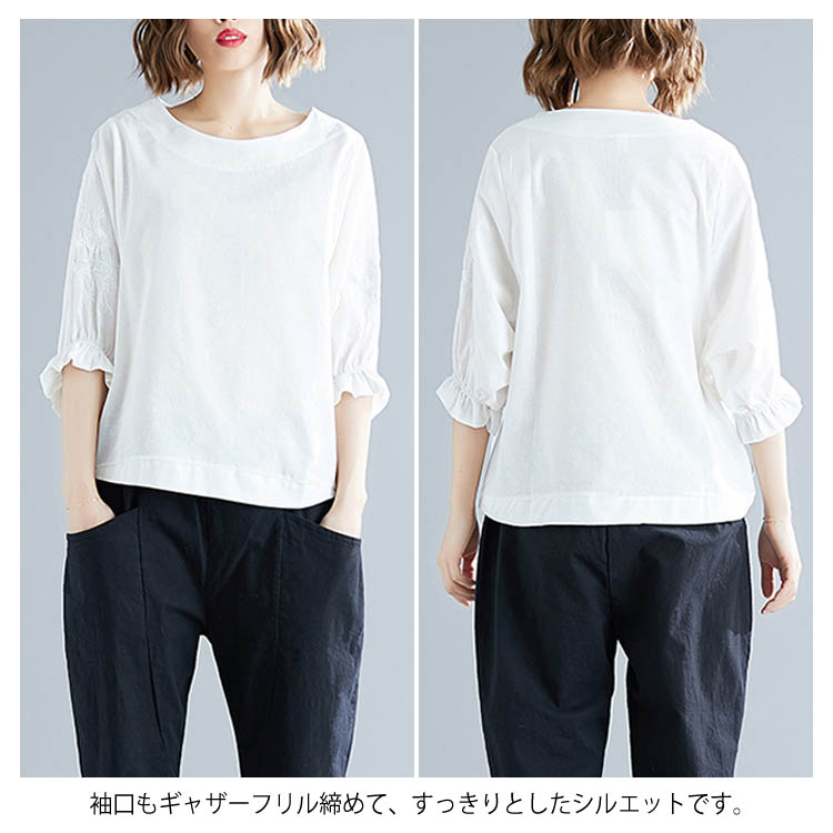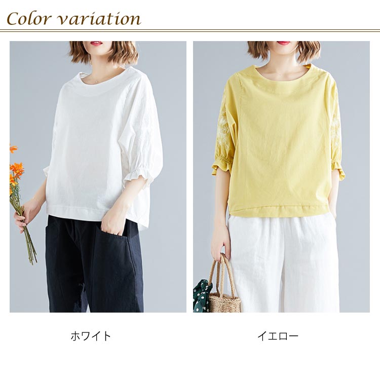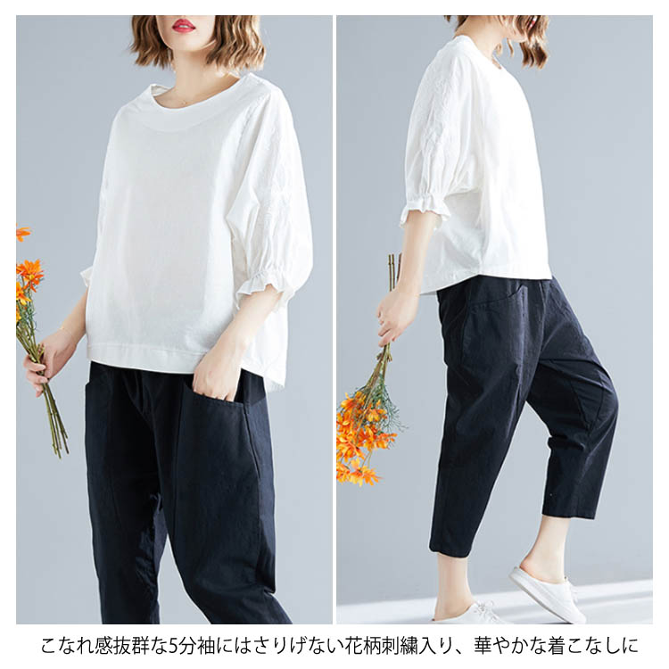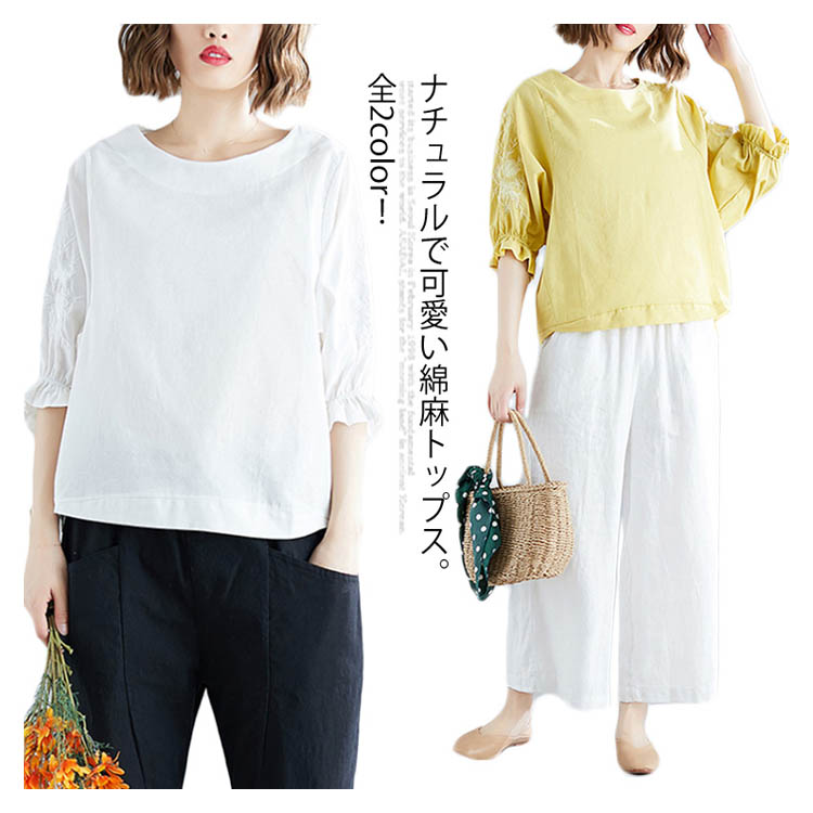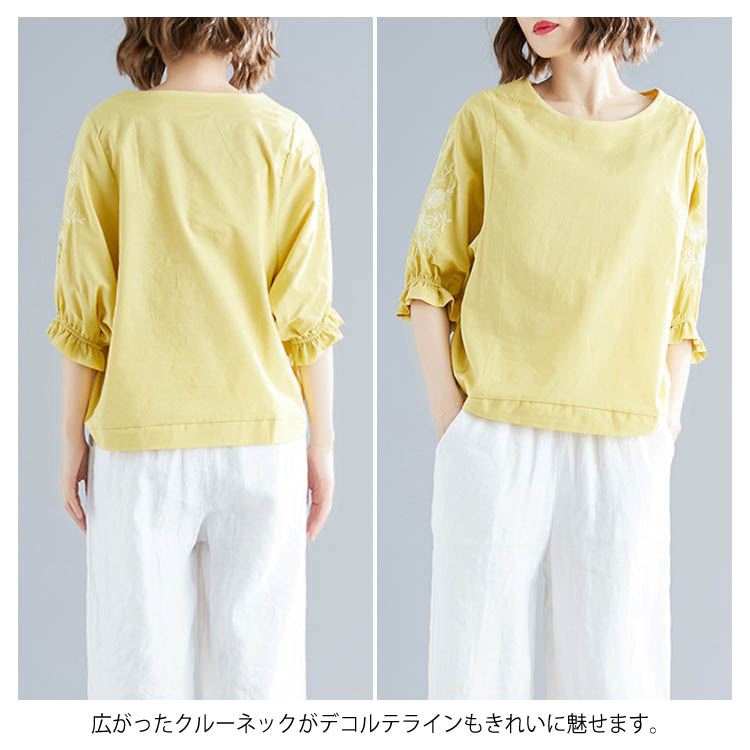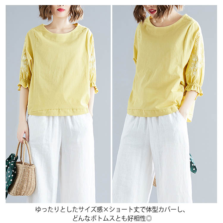 《送料無料》さりげない袖フリル&刺繍が可愛さ◎トップス tシャツ ブラウス プルオーバー 袖刺繍 5分袖Tシャツ クルーネック 綿麻 リネン ゆったり 可愛い シンプル ナチュラル 無地 春 夏