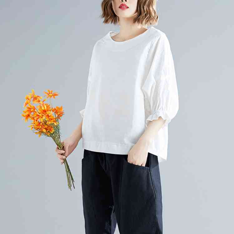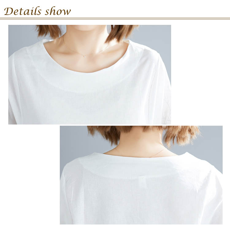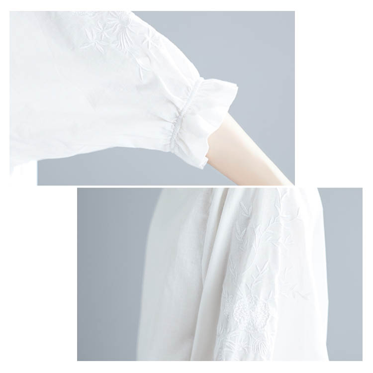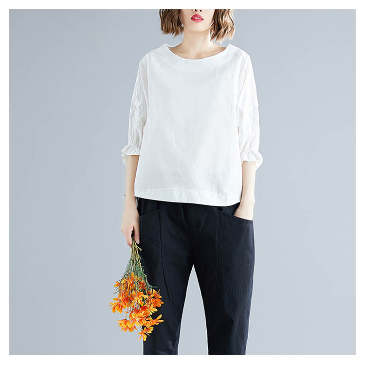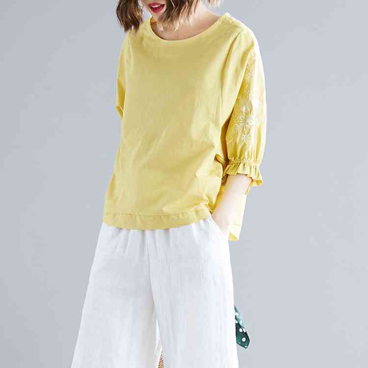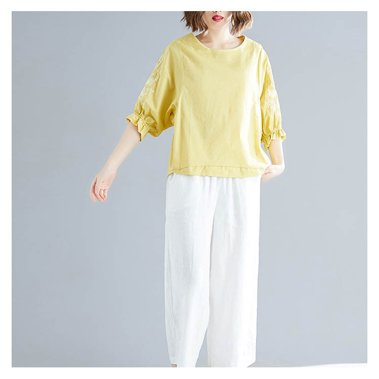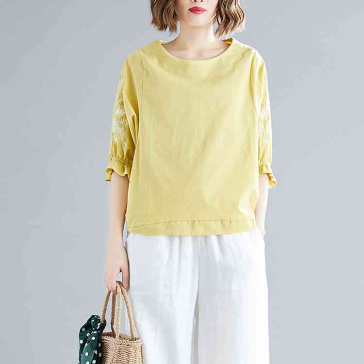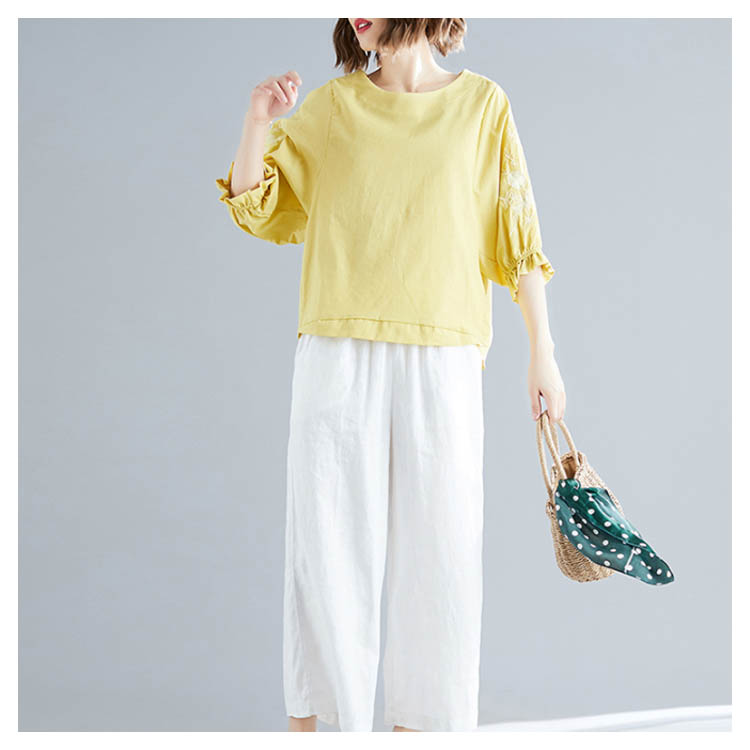 《送料無料》さりげない袖フリル&刺繍が可愛さ◎トップス tシャツ ブラウス プルオーバー 袖刺繍 5分袖Tシャツ クルーネック 綿麻 リネン ゆったり 可愛い シンプル ナチュラル 無地 春 夏