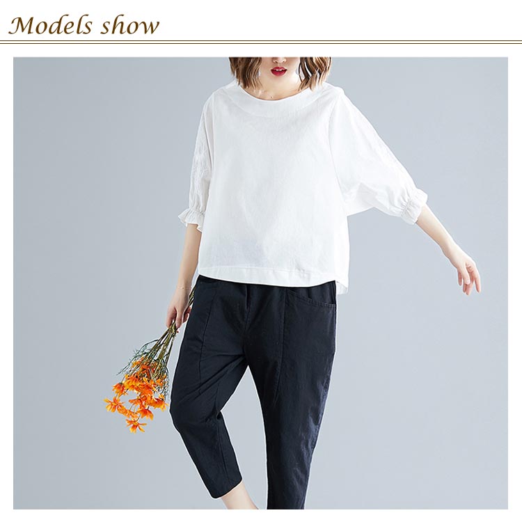 | 全2color!ナチュラルで可愛い綿麻トップス。 こなれ感抜群な5分袖にはさりげない花柄刺繍入り、華やかな着こなしに 袖口もギャザーフリル締めて、すっきりとしたシルエットです。 広がったクルーネックがデコルテラインもきれいに魅せます。 ゆったりとしたサイズ感×ショート丈で体型カバーし、どんなボトムスとも好相性◎ | |