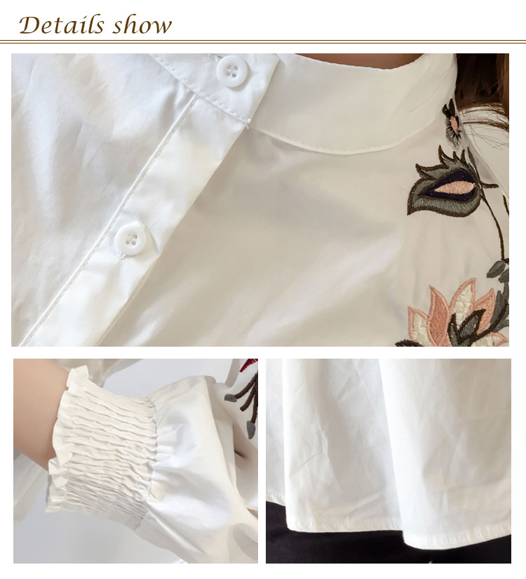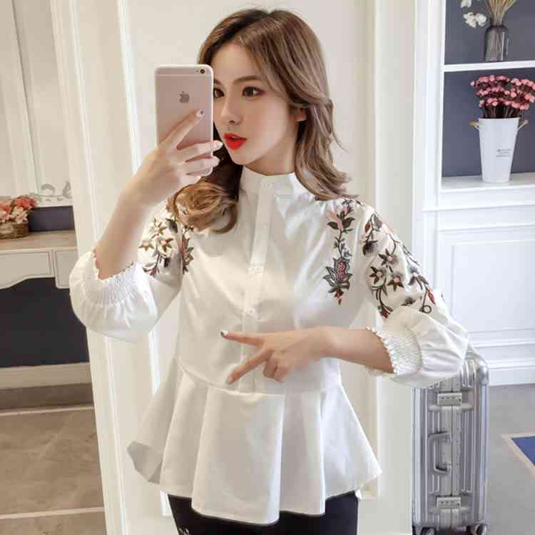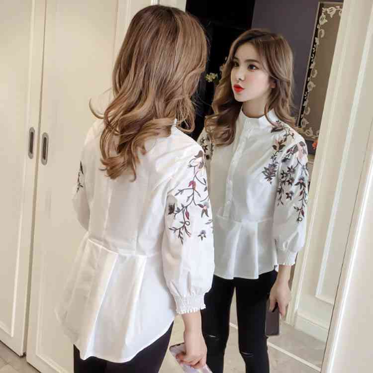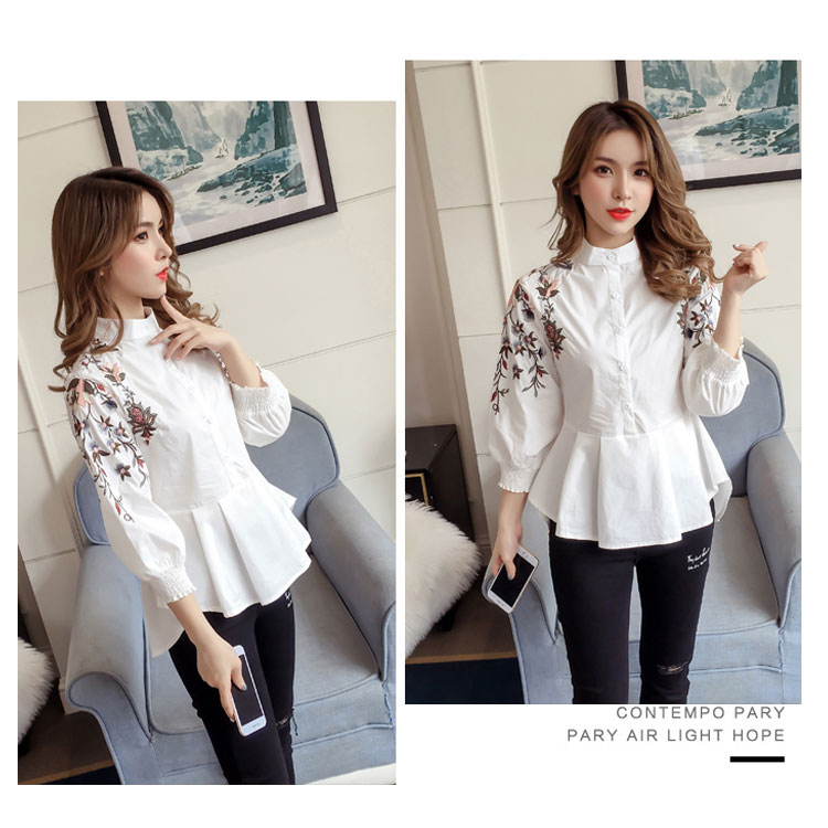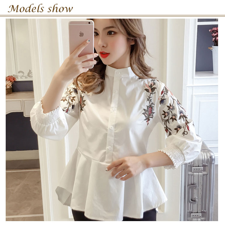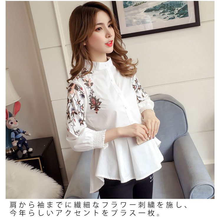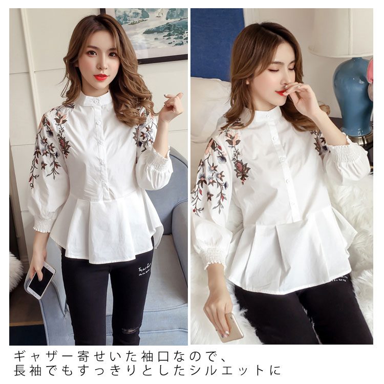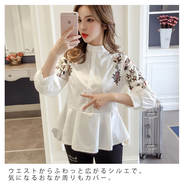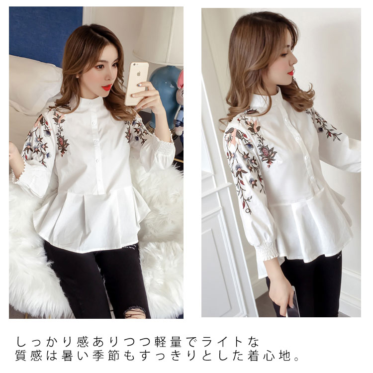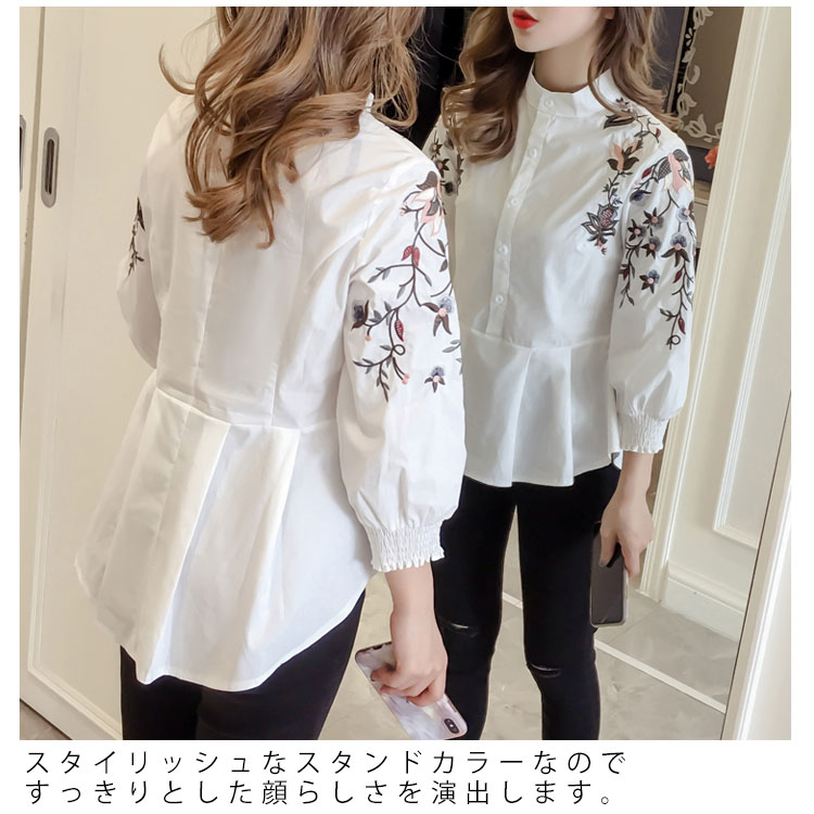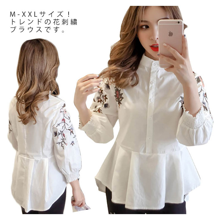 《送料無料》M-XXLサイズ!白シャツ ペプラム 刺繍ブラウス レディース スタンドカラー シャツ ブラウス 刺繍 トップス 長袖 Aライン 春 夏 大人可愛い