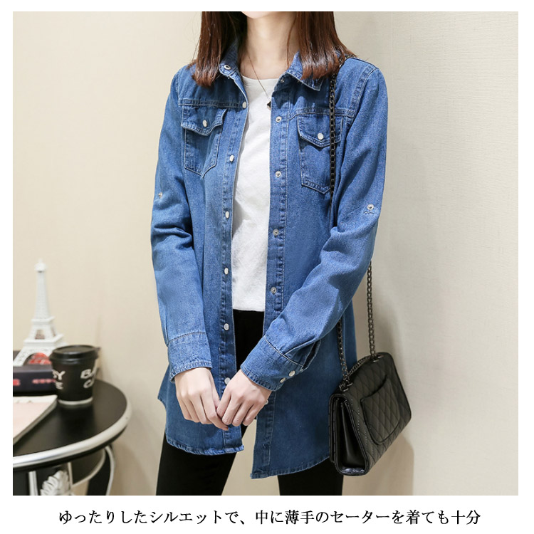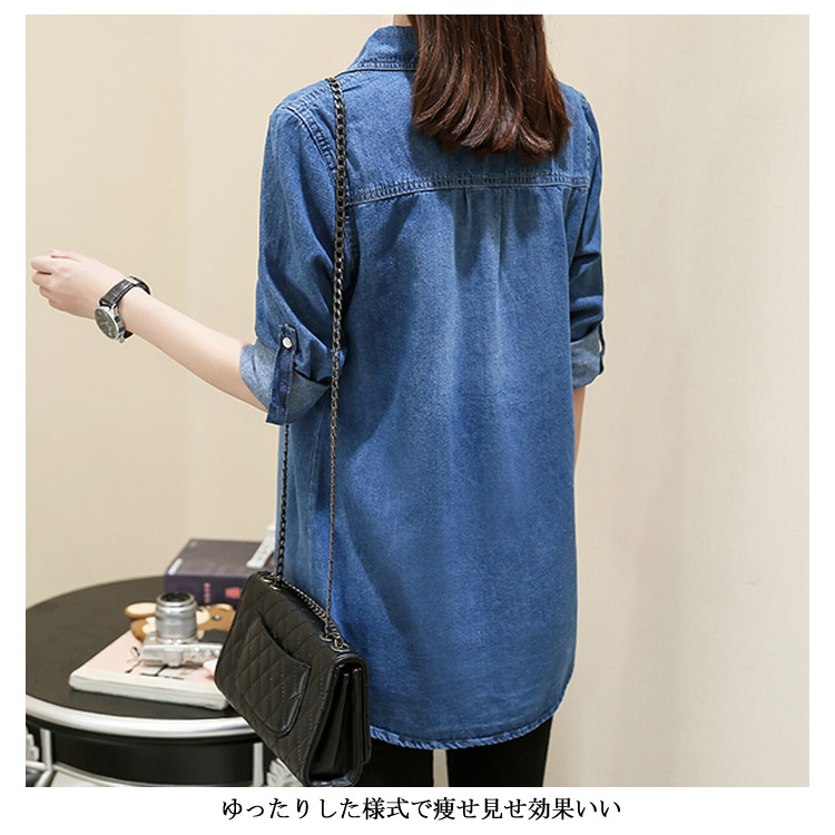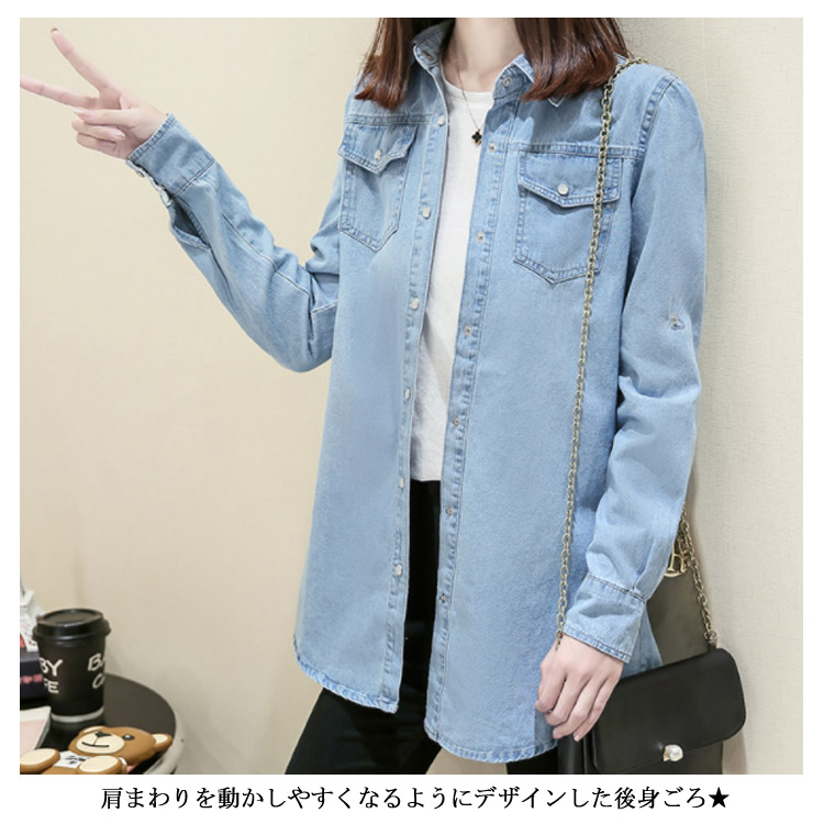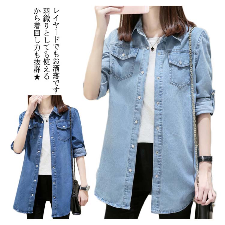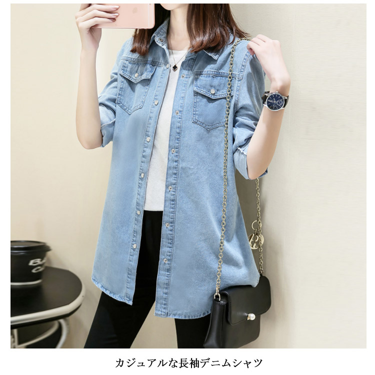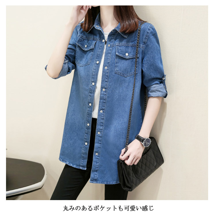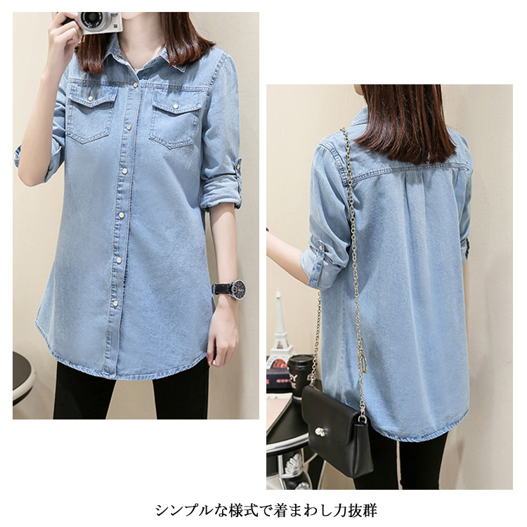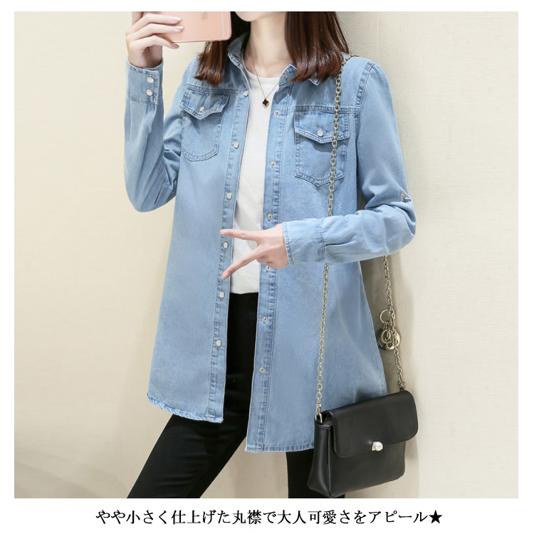 送料無料 ブラウス デニム レディース デニムシャツ デニムブラウス 長袖 折り襟 丸襟 ボタン付き ポケット付き 無地 カジュアル キレイめ お洒落 ゆったり 重ね着 レイヤード 春秋 前開き 秋新作