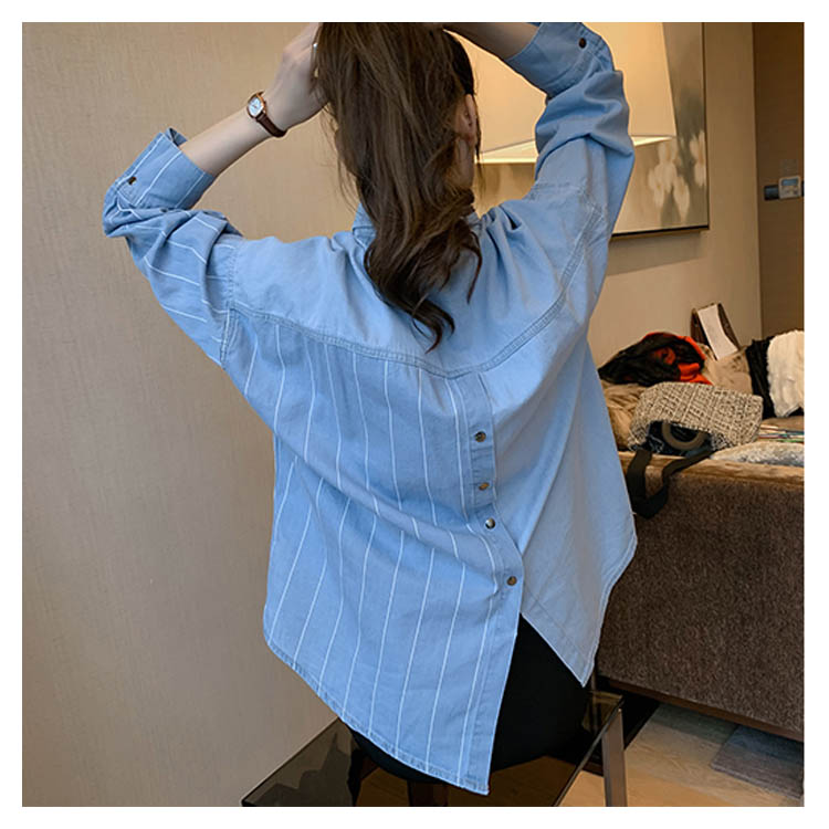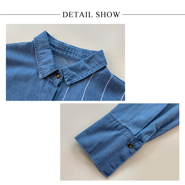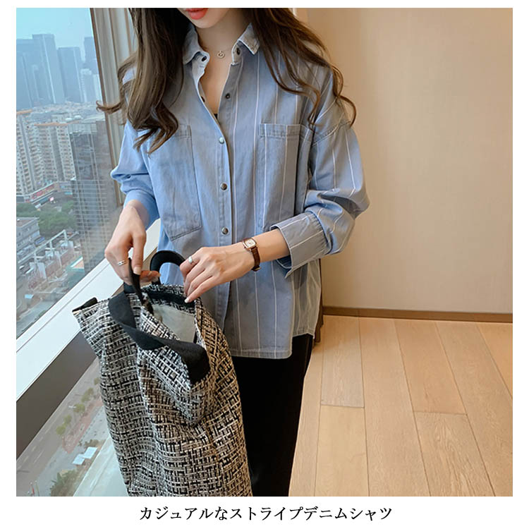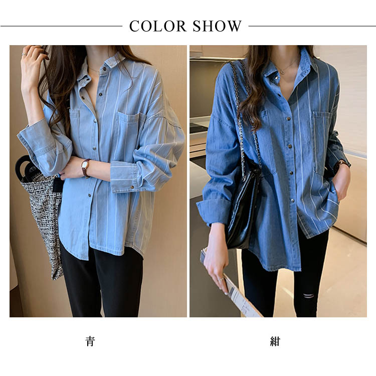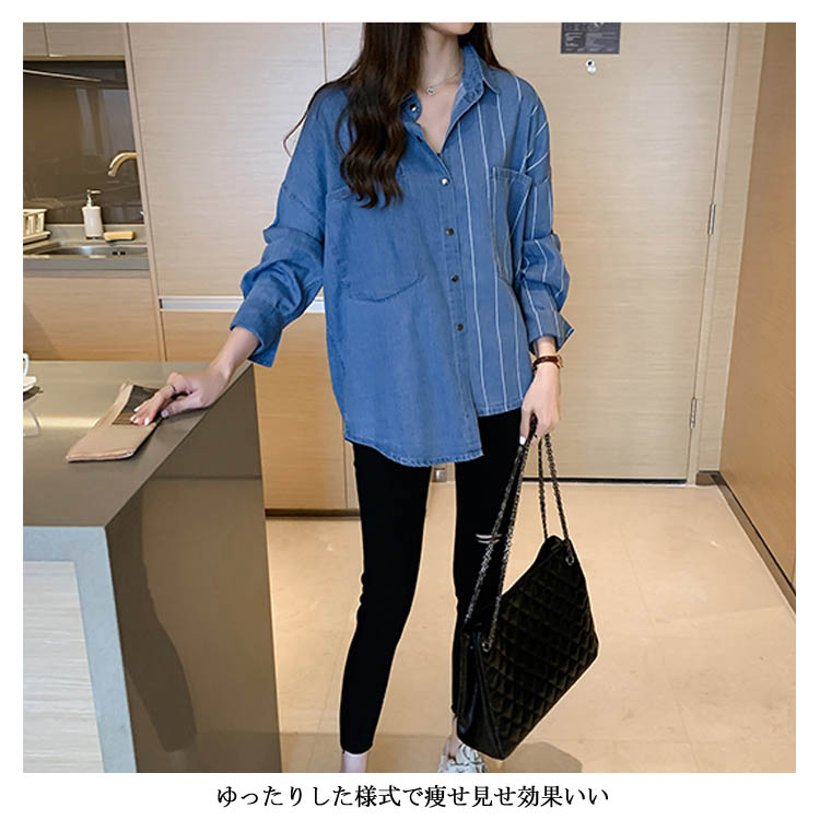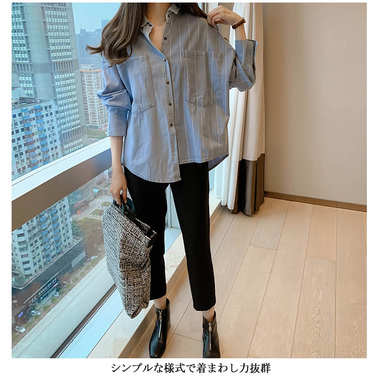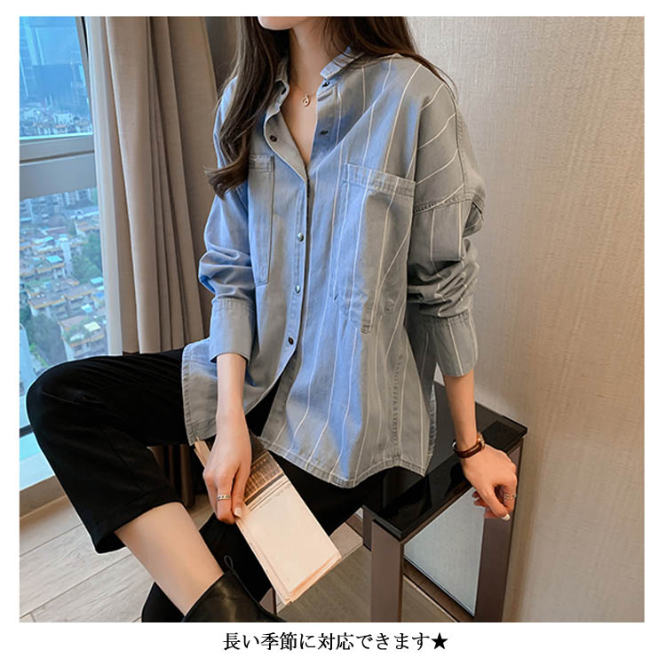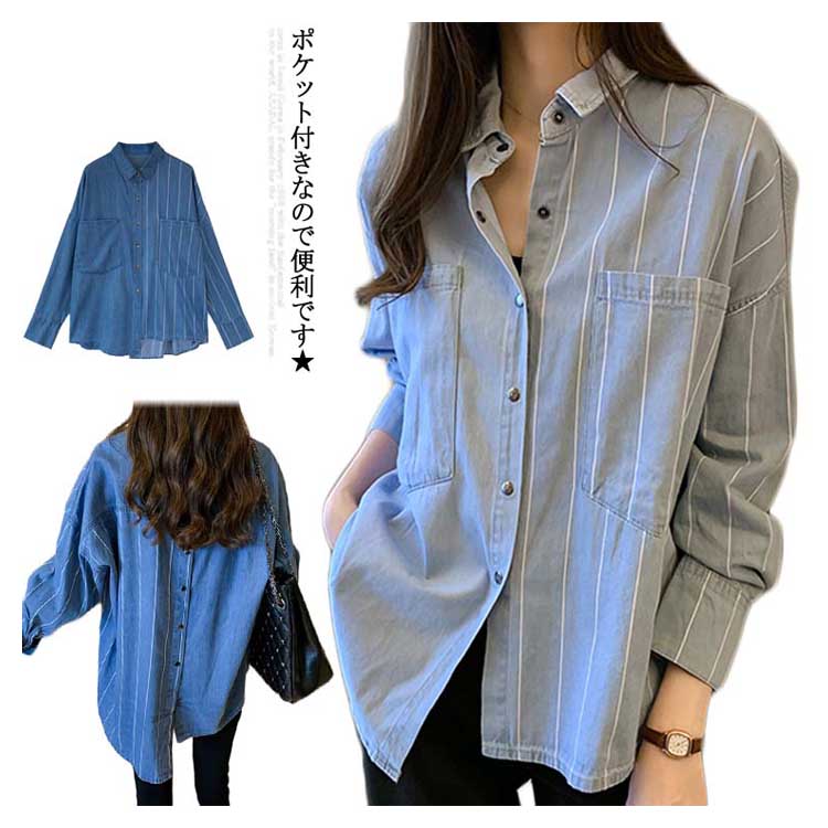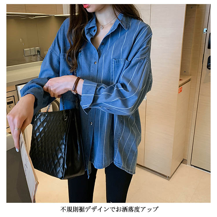 送料無料 ブラウス レディース 長袖ブラウス デニムシャツ シャツブラウス シャツコート ボタンシャツ ストライプシャツ 切り替え 不規則裾 カジュアル お洒落 ルーズ 体型カバー 普段着 秋新作