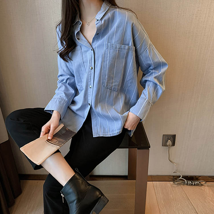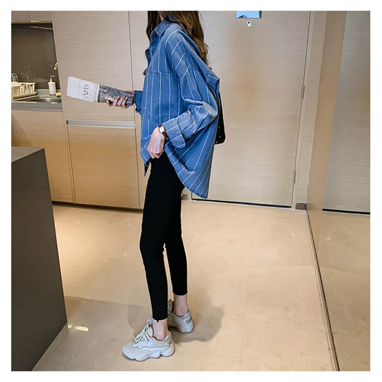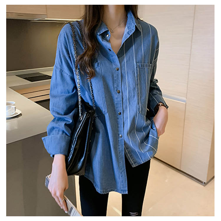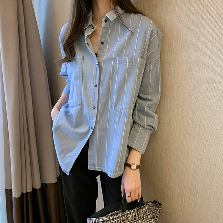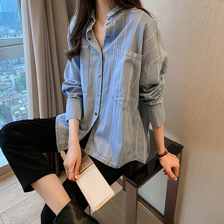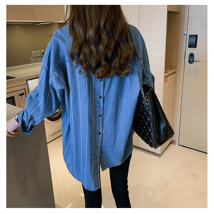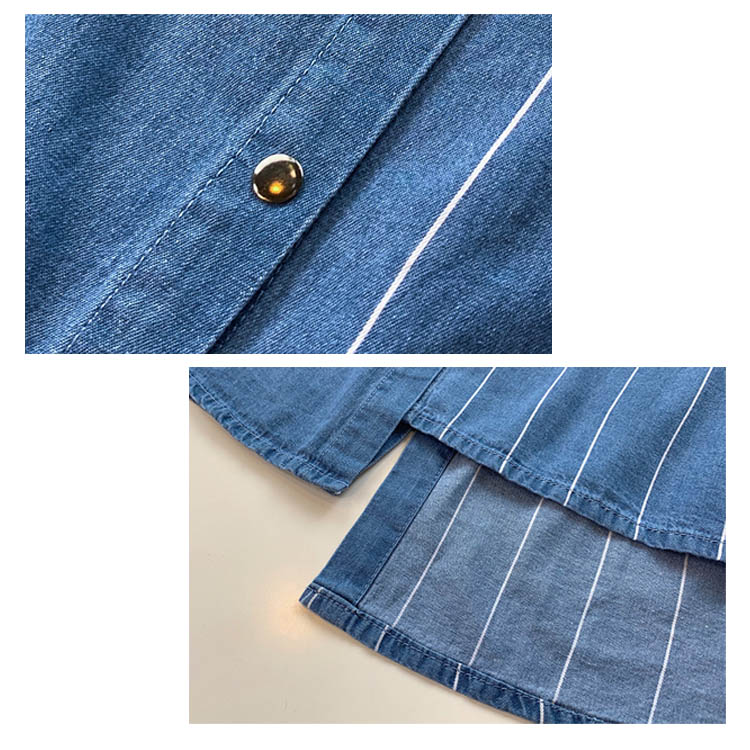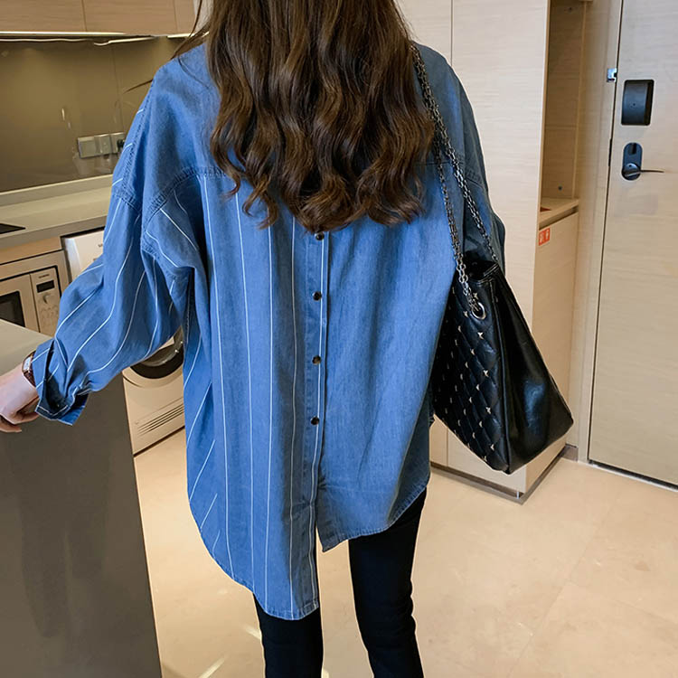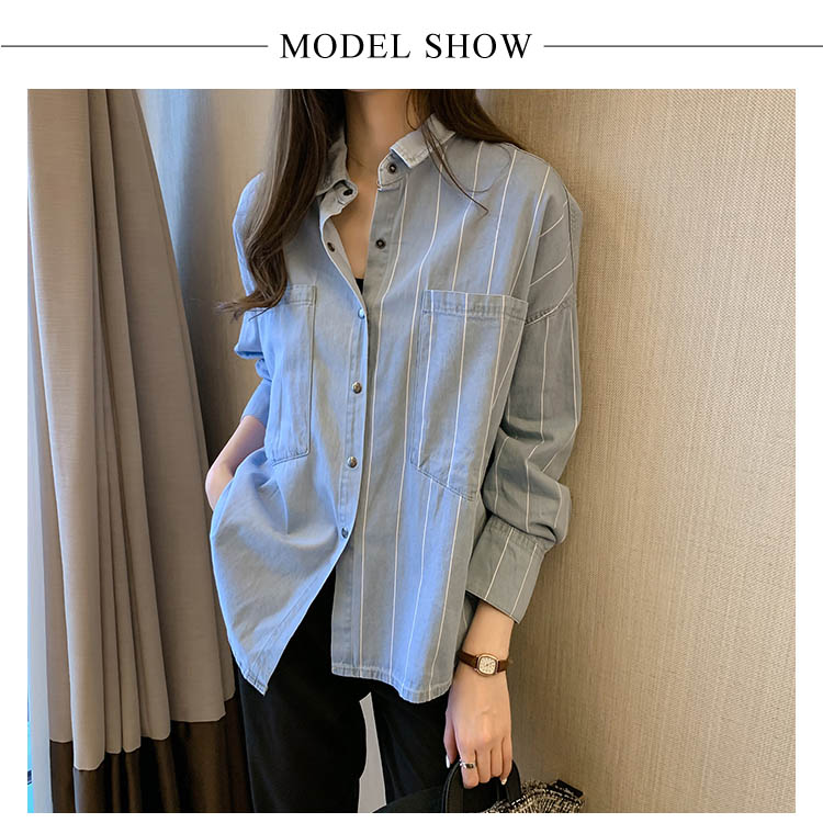 送料無料 ブラウス レディース 長袖ブラウス デニムシャツ シャツブラウス シャツコート ボタンシャツ ストライプシャツ 切り替え 不規則裾 カジュアル お洒落 ルーズ 体型カバー 普段着 秋新作