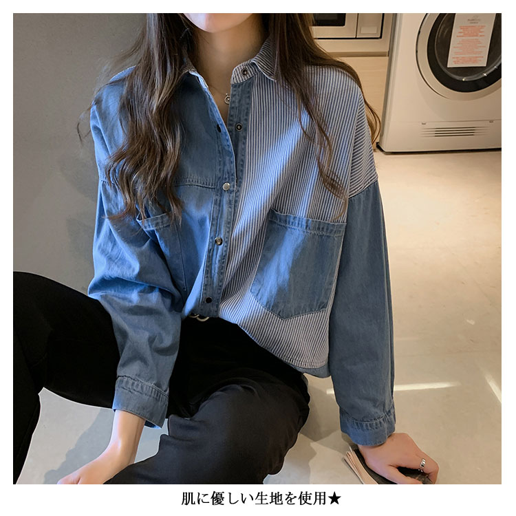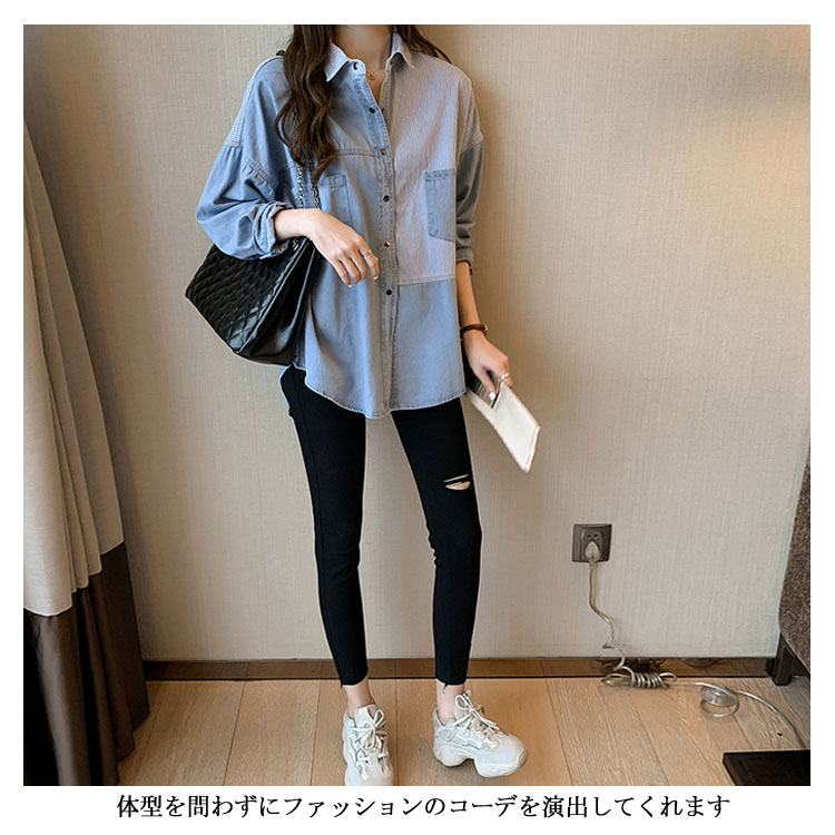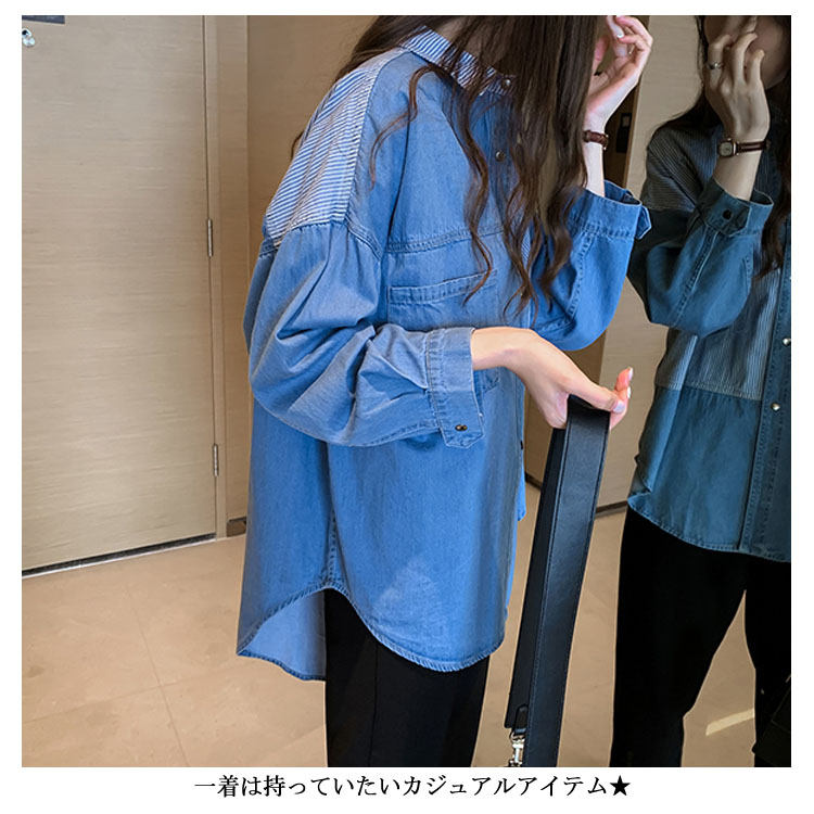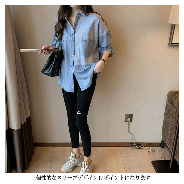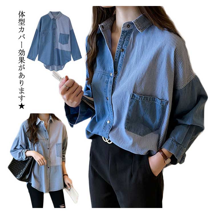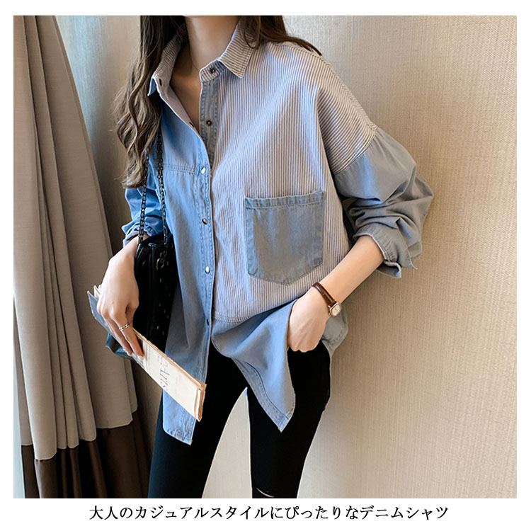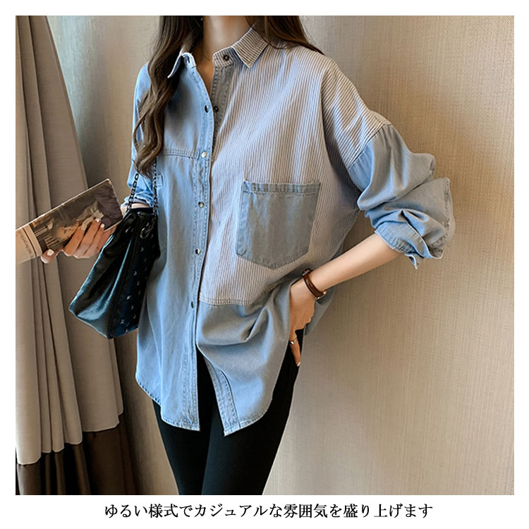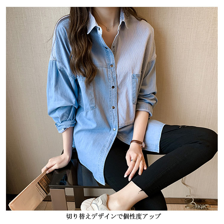 送料無料 デニムシャツ レディース シャツブラウス 長袖シャツ カジュアルシャツ 無地シャツ ロングシャツ ストライプシャツ 切り替え ライトアウター ルーズ ゆったり トレンド お洒落 かわいい 秋新作