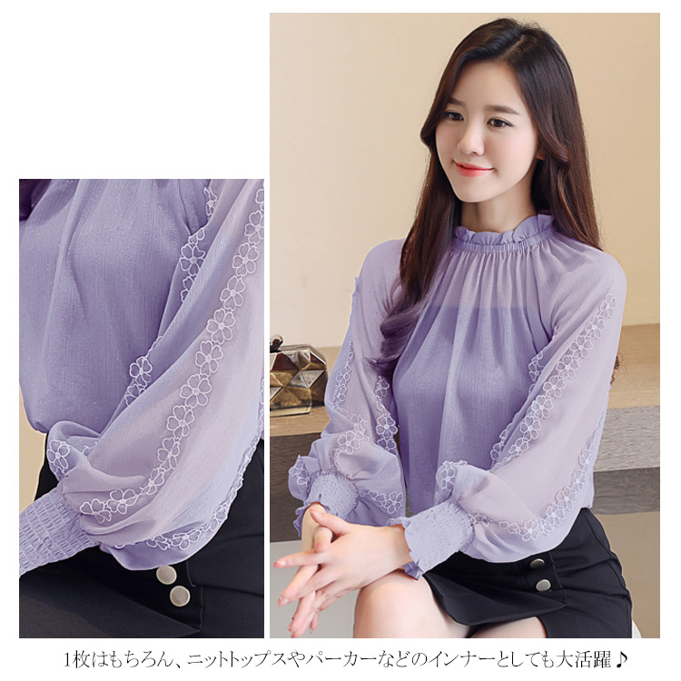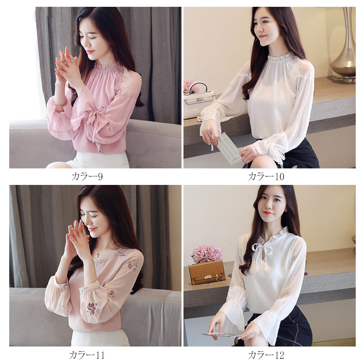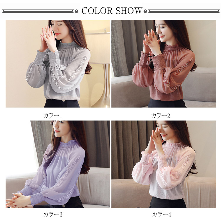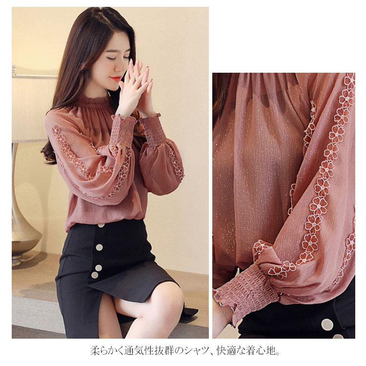 送料無料 シフォンブラウス 長袖 シャツ ブラウス レディース トップス フリル レース バルーン袖 刺繍 プルオーバー フレア リボン リボンタイ シフォン 透け感 キレイめ カジュアル 体型カバー 通勤 OL オフィス デート 二次会 お呼ばれ パーディー 結婚式 卒業式 入園式 春秋