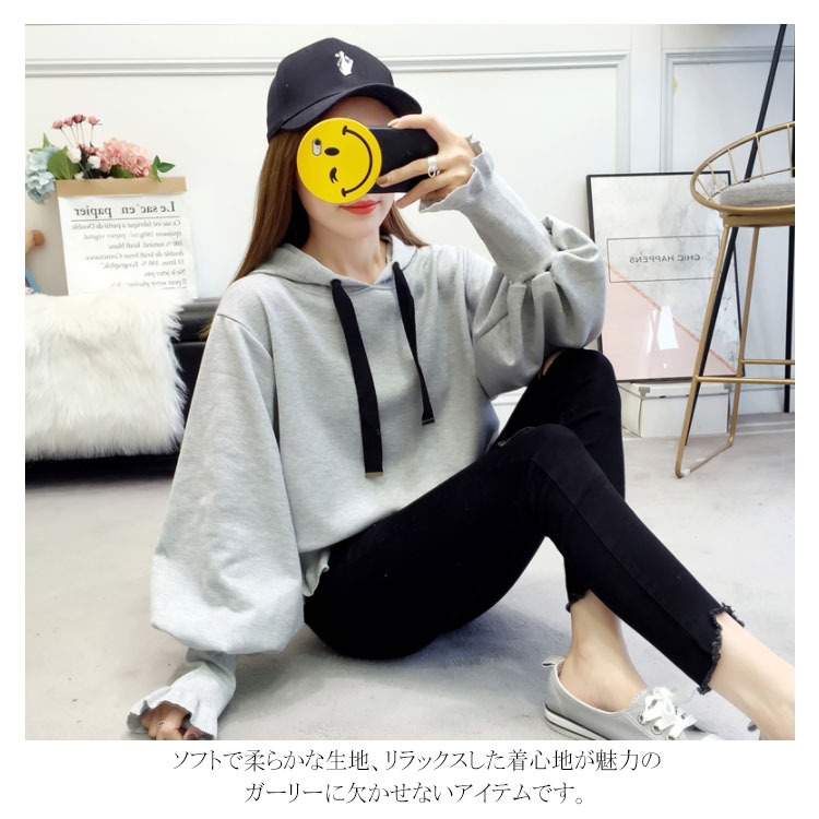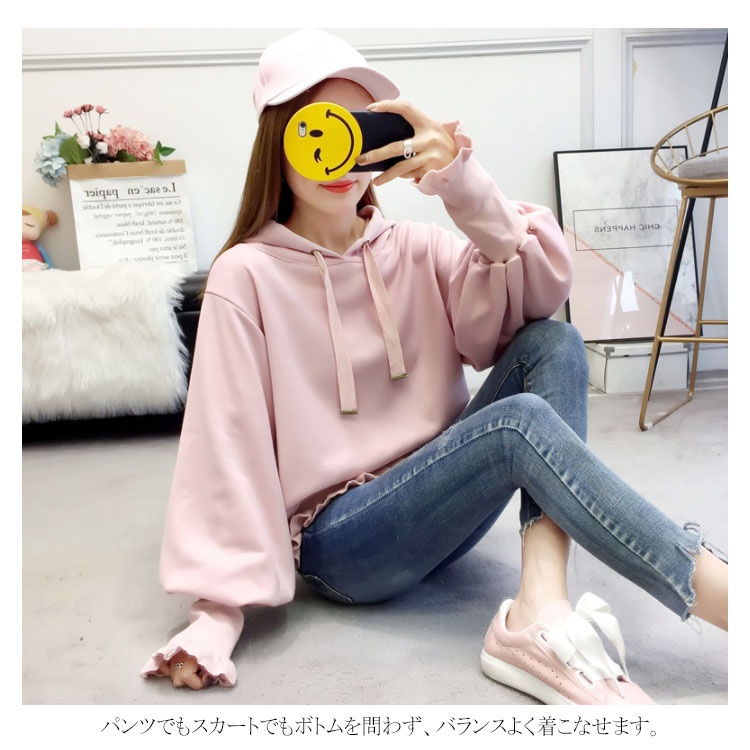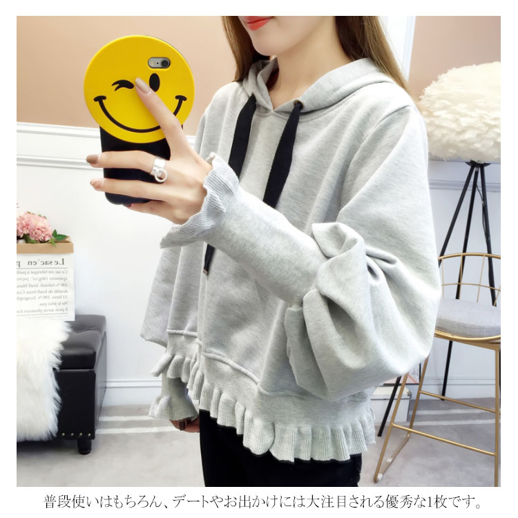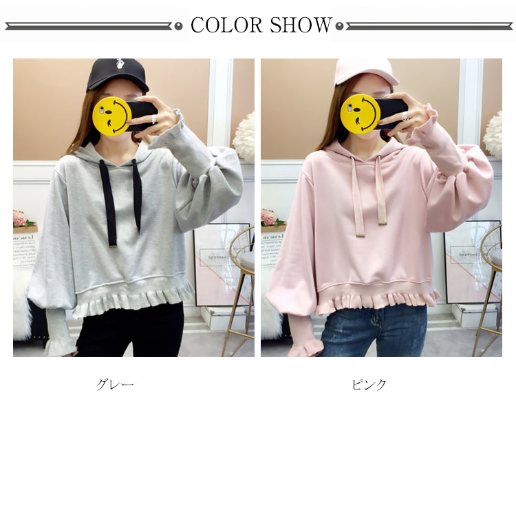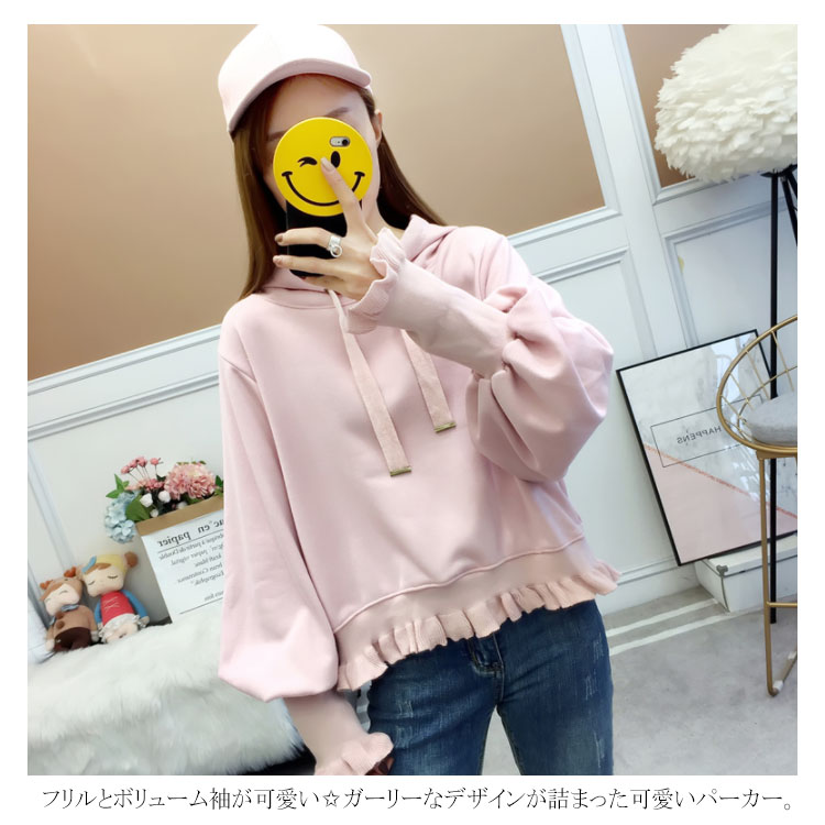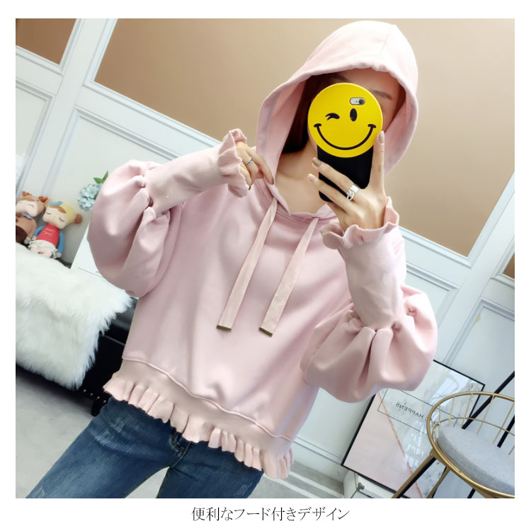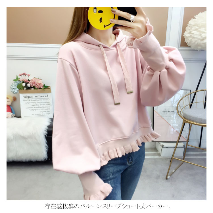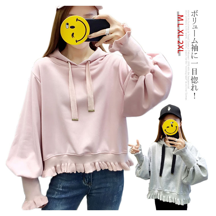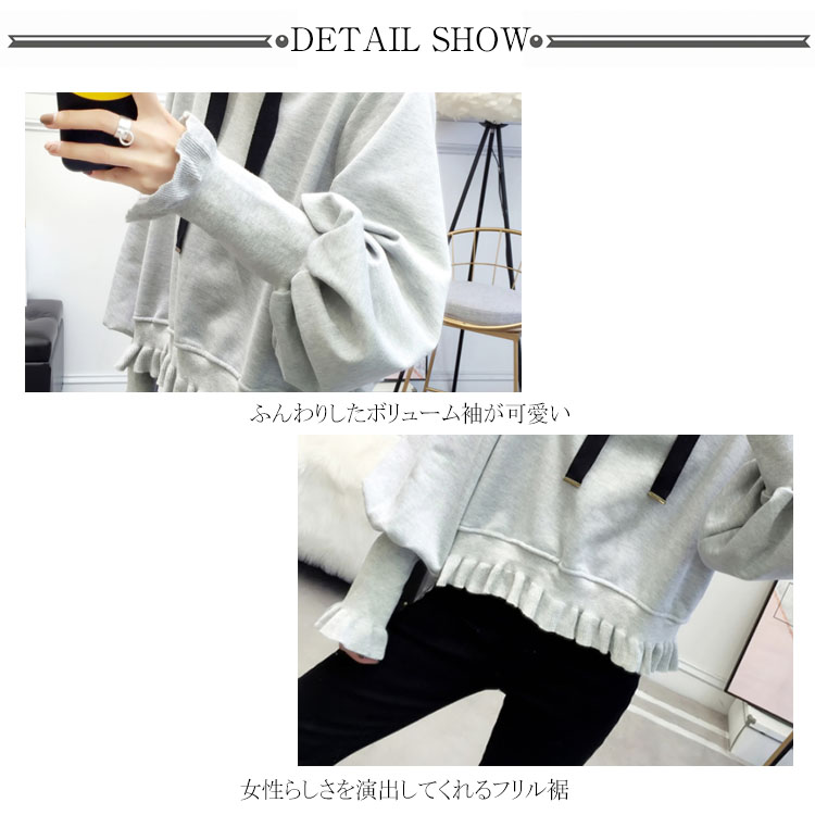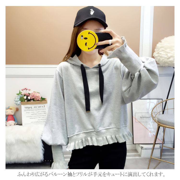 ふんわりしたフォルムが可愛い♪ パーカー スウェット プルオーバー レディース バルーンスリーブ フリル ボリューム ガーリー 可愛い オシャレ ショート丈 乙女 リブ袖 フード付き ゆったり 体型カバー デート お出かけ
