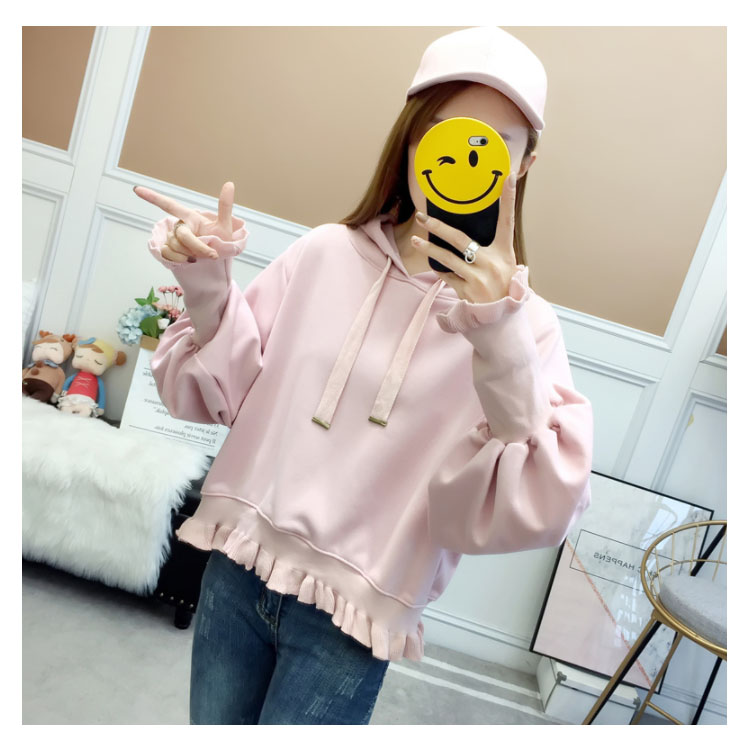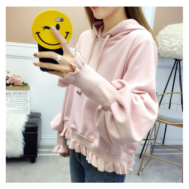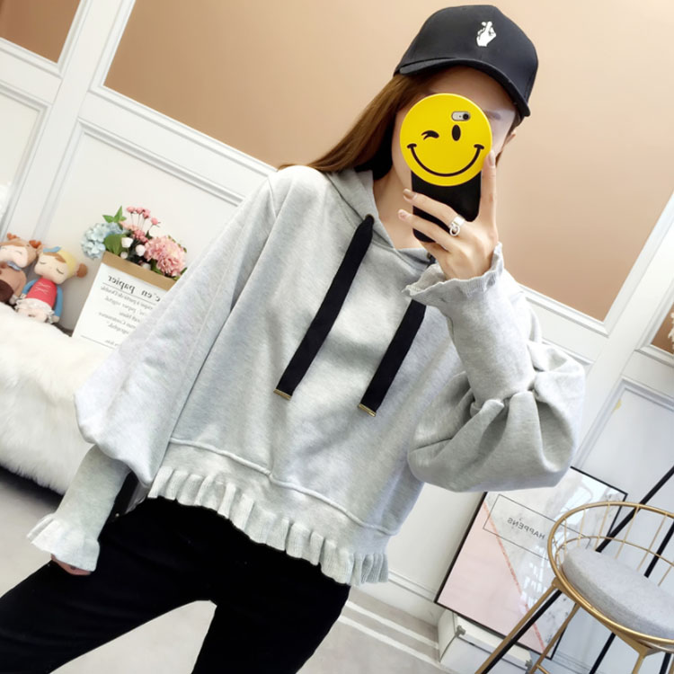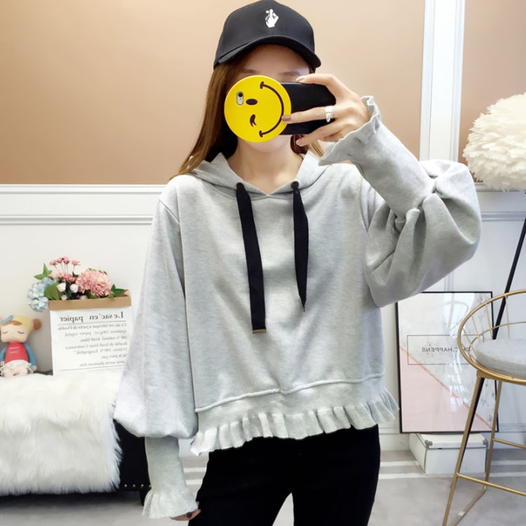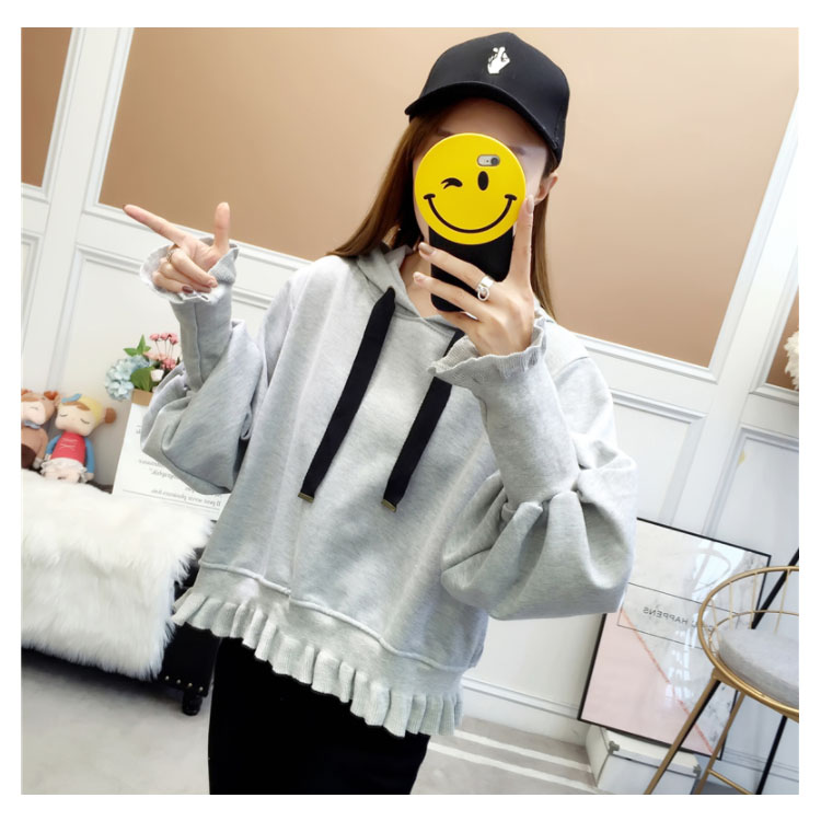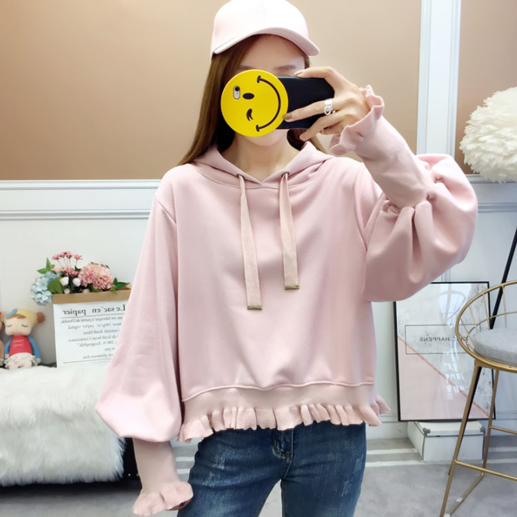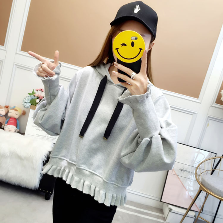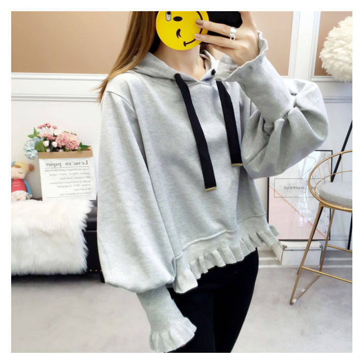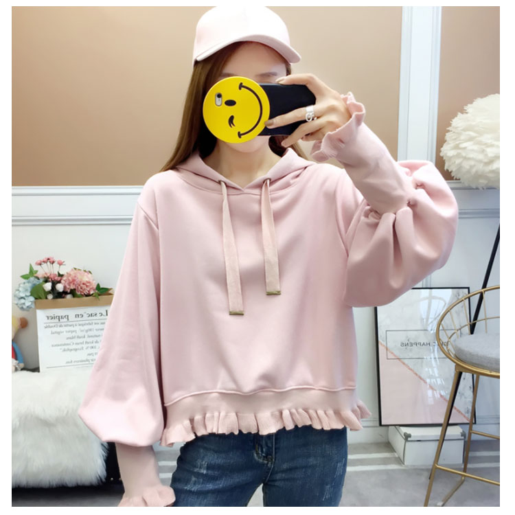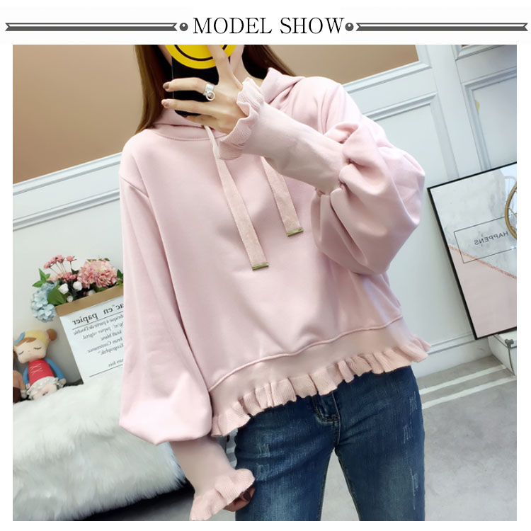 ふんわりしたフォルムが可愛い♪ パーカー スウェット プルオーバー レディース バルーンスリーブ フリル ボリューム ガーリー 可愛い オシャレ ショート丈 乙女 リブ袖 フード付き ゆったり 体型カバー デート お出かけ