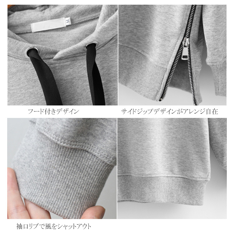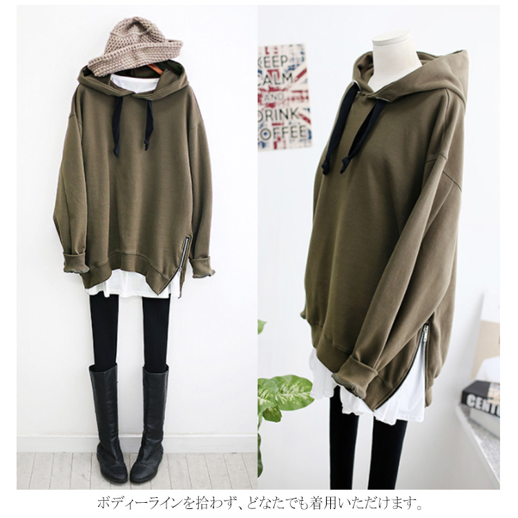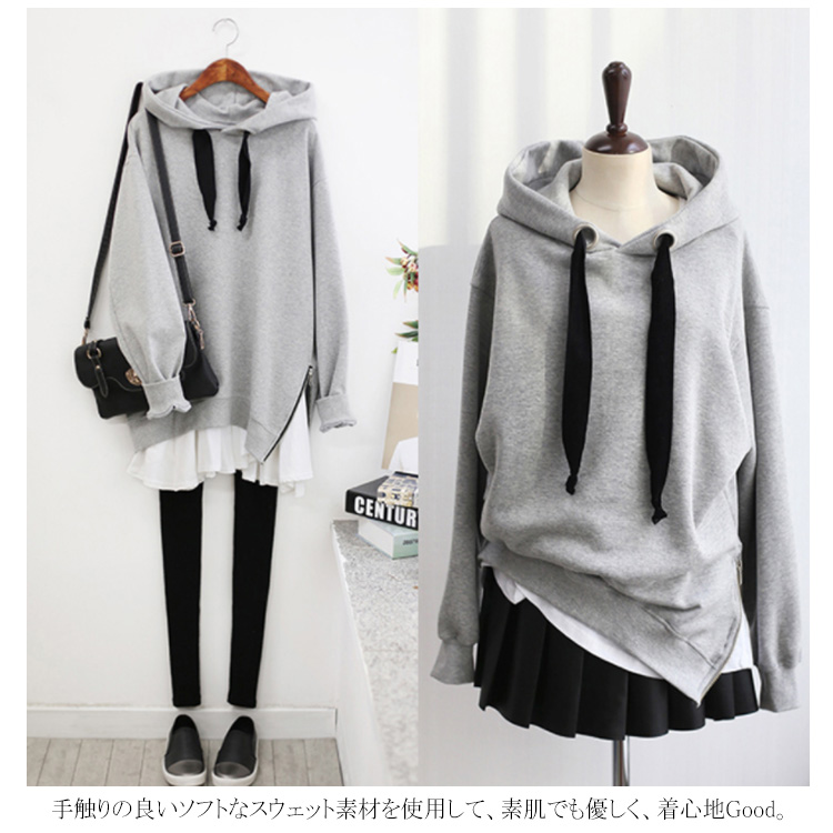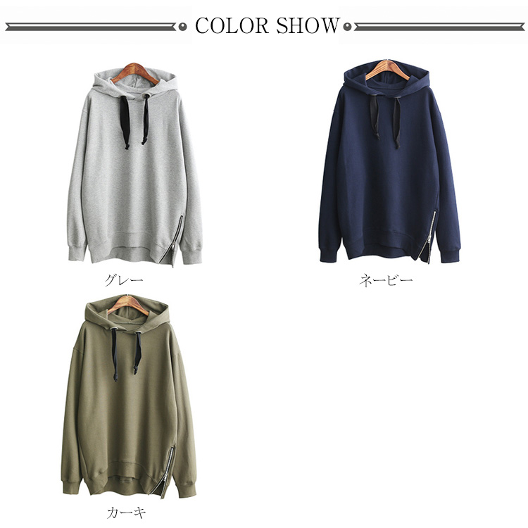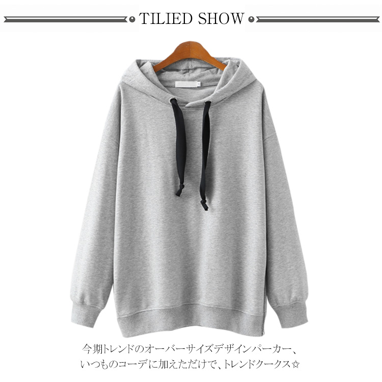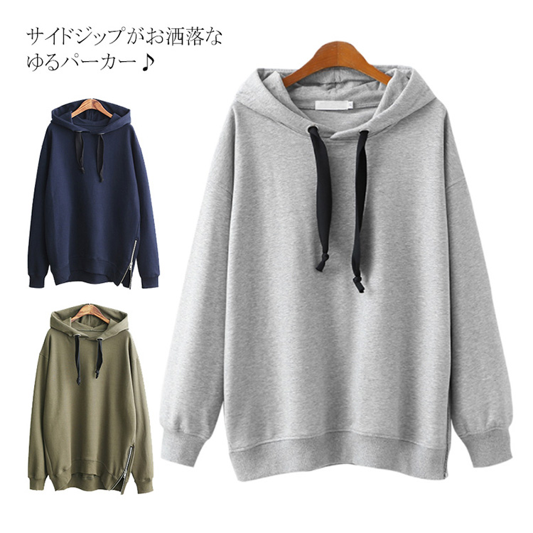 パーカー プルオーバー ゆったり レディース サイドジップ スリット フード付き ゆるシルエット 無地 学生 通学 通勤 体型カバー ボイスライク オーバーサイズ トップス 長袖 スウェット ドロップスリーブ