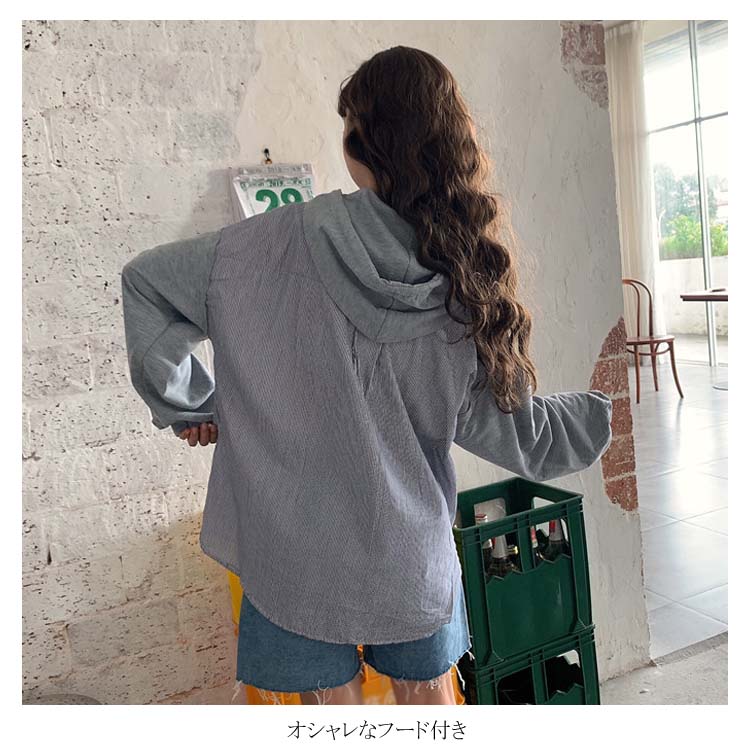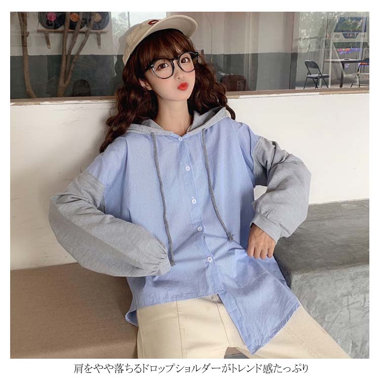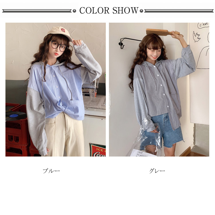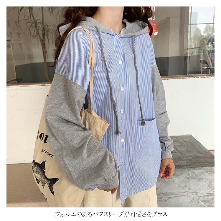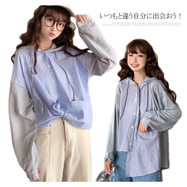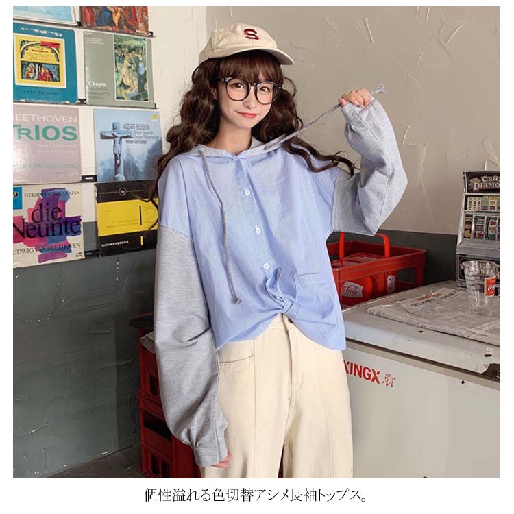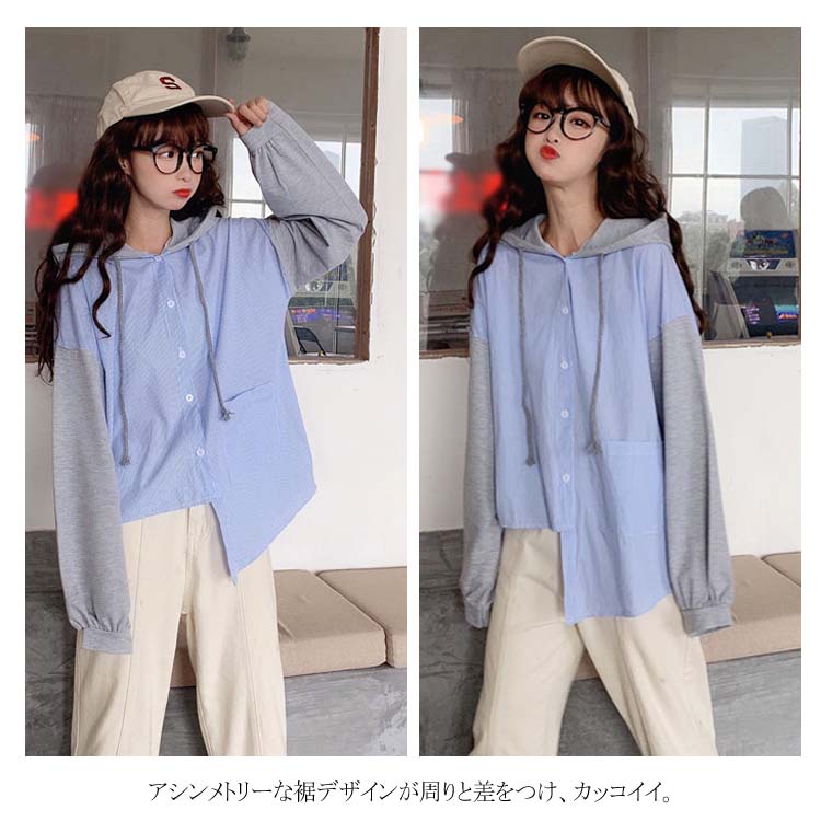 アシメデザインがお洒落なブラウス。 フード付き 長袖 ブラウス シャツ レディース バイカラー トップス ゆったり オーバーサイズ アシンメトリー ポケット付き ラフ ナチュラル ライトアウター パーカー カットソー 20代 ガーリー 学生 通学