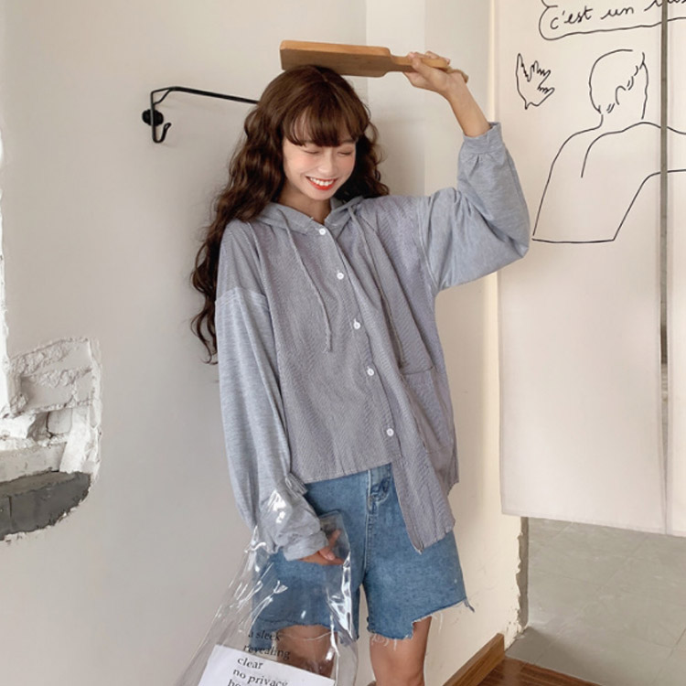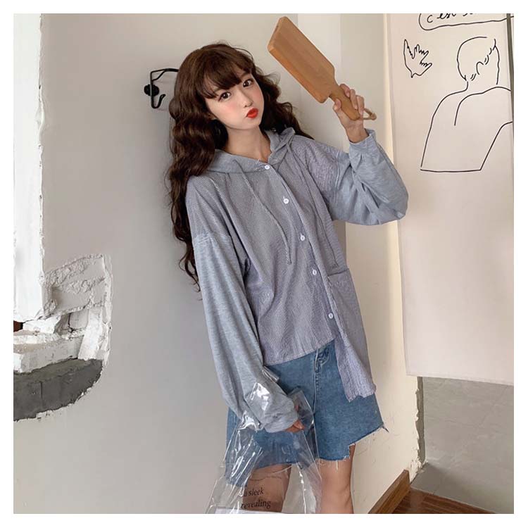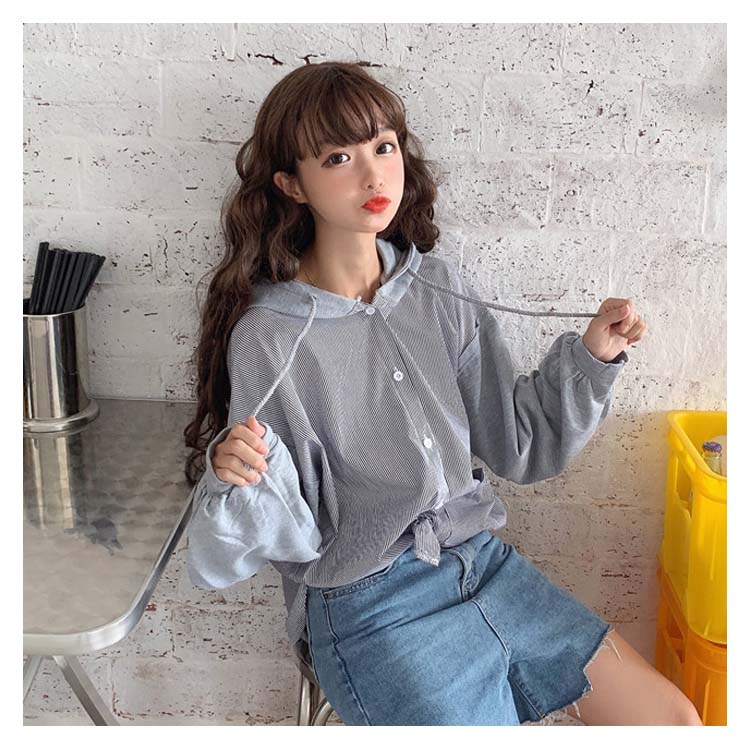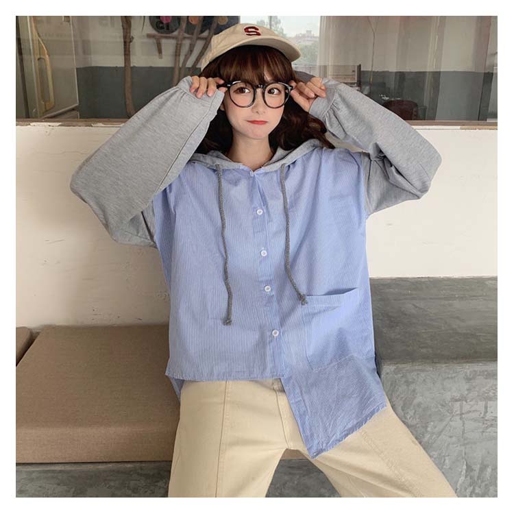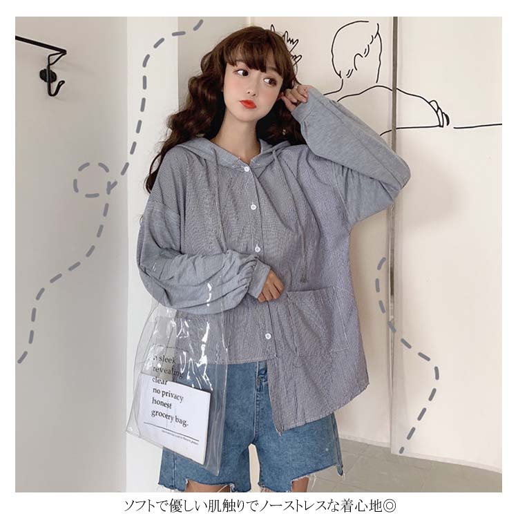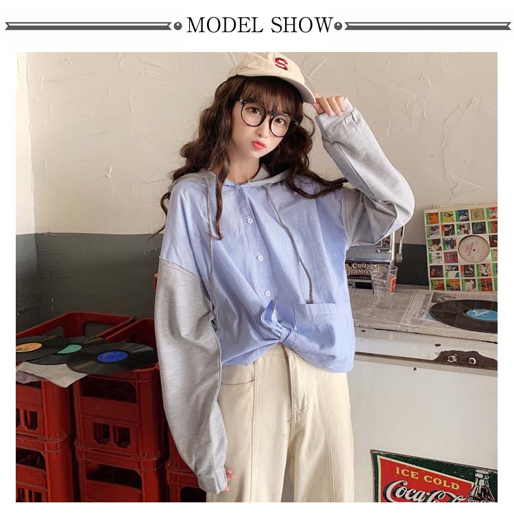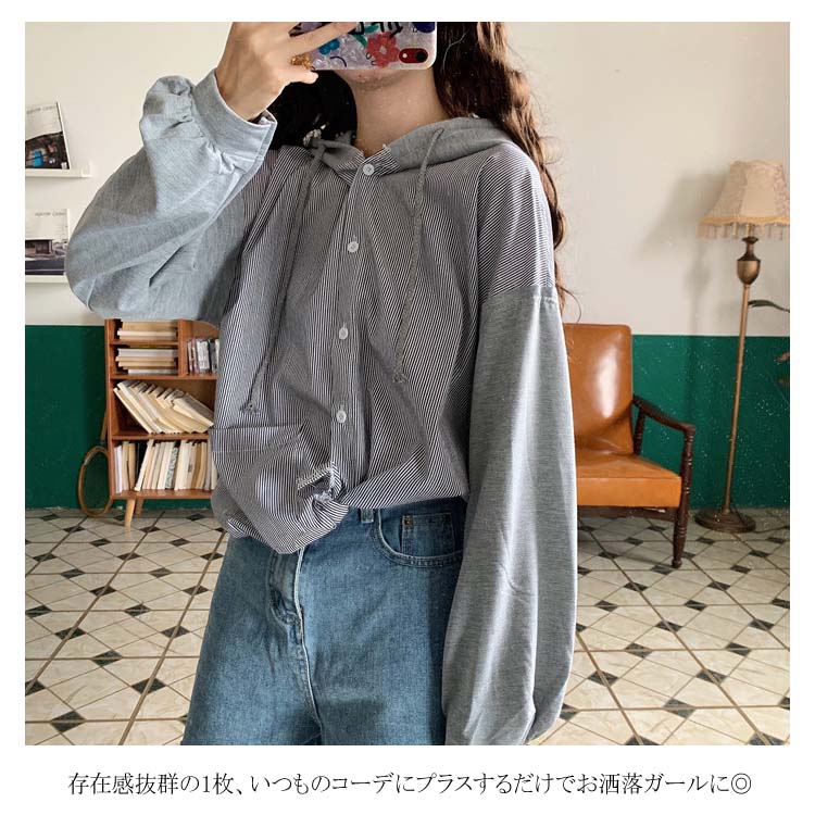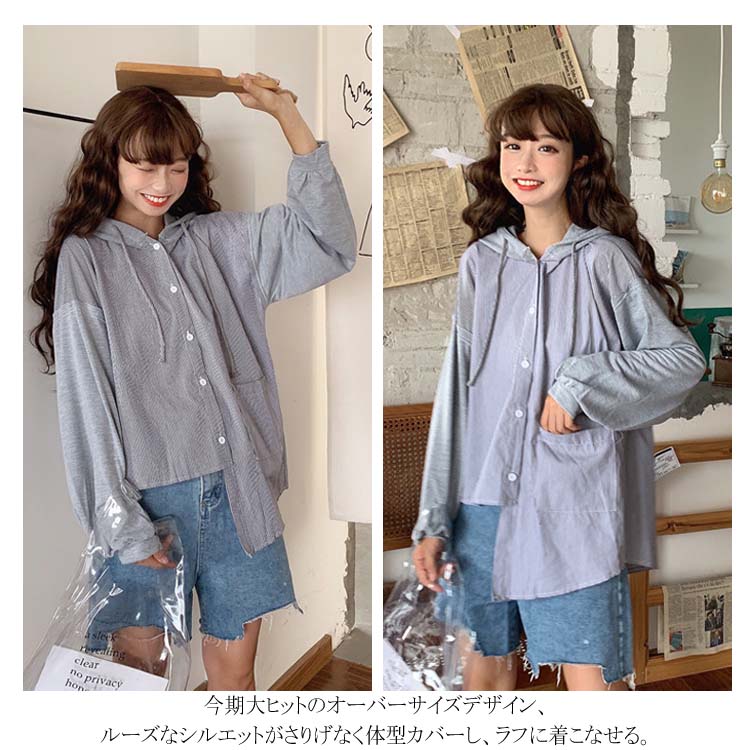 アシメデザインがお洒落なブラウス。 フード付き 長袖 ブラウス シャツ レディース バイカラー トップス ゆったり オーバーサイズ アシンメトリー ポケット付き ラフ ナチュラル ライトアウター パーカー カットソー 20代 ガーリー 学生 通学