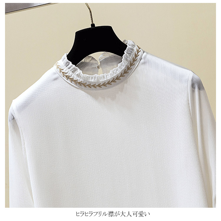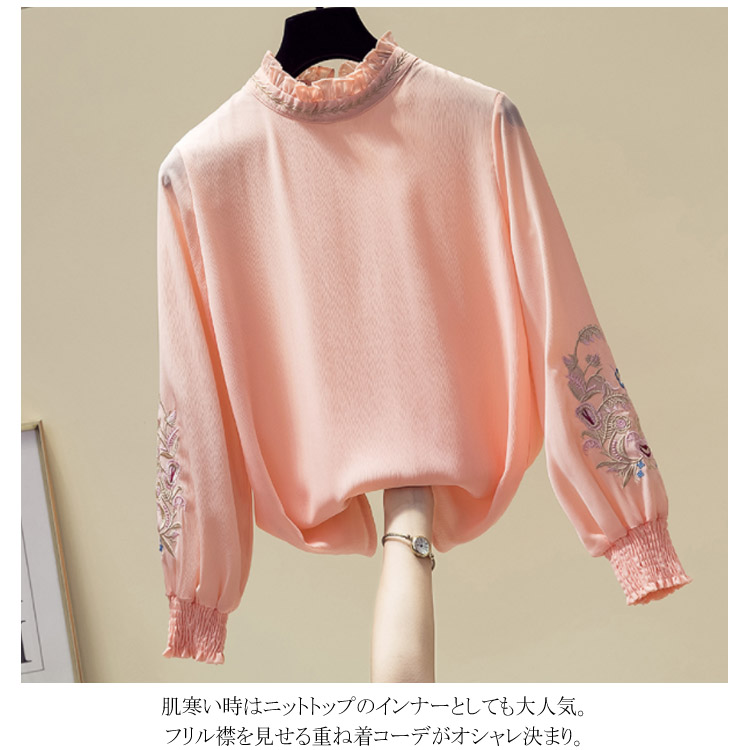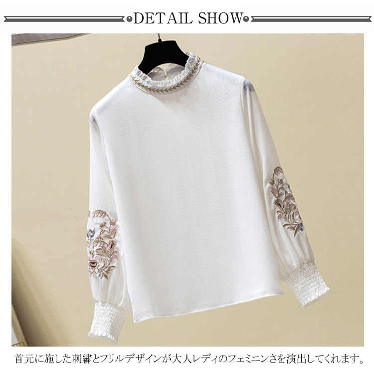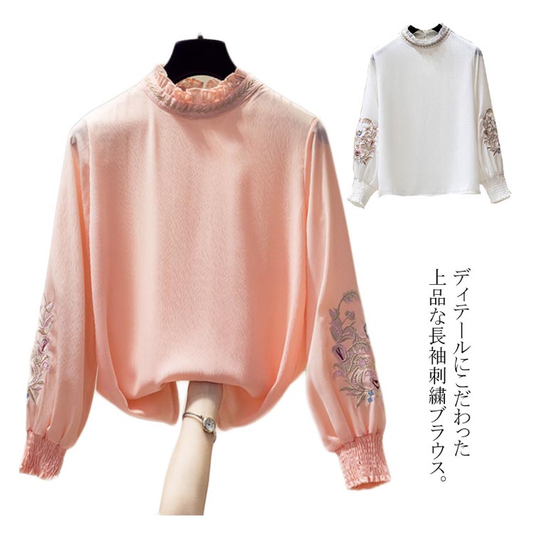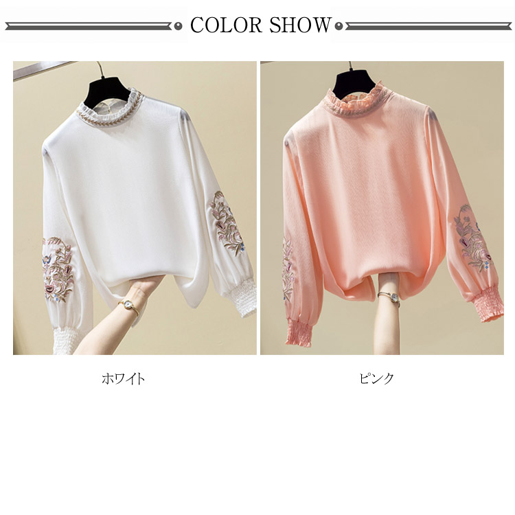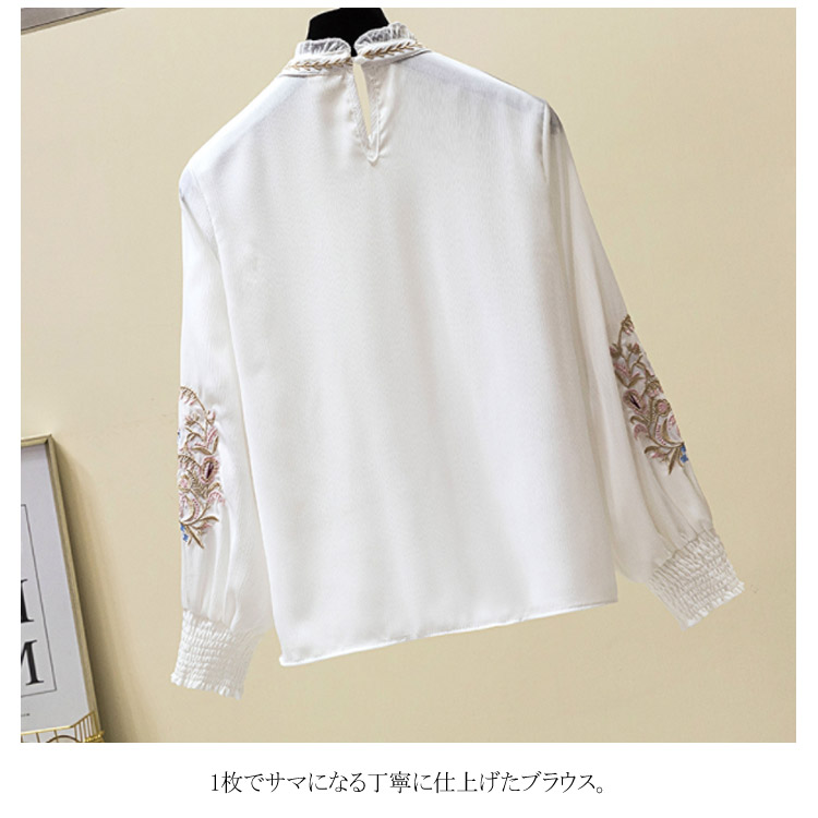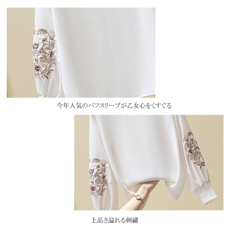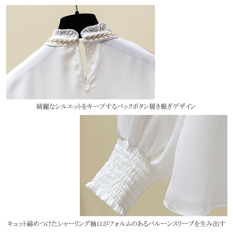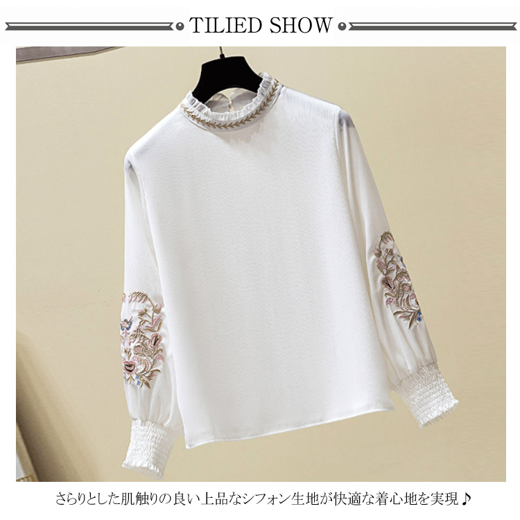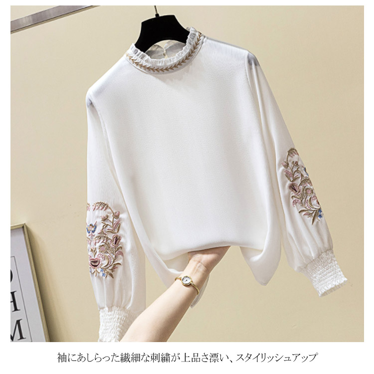 送料無料 パフスリーブが可愛い ブラウス 刺繍 フリル襟 立ち襟 レディース 長袖 ブラウス シャツ プルシャツ プルオーバー シフォン ブラウス 通勤 オシャレ キレイめ オフィス インナー バルーン袖