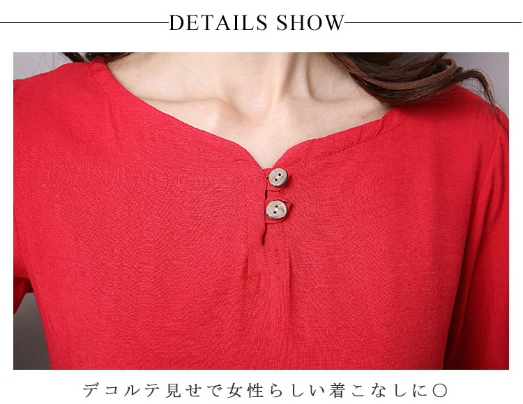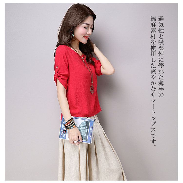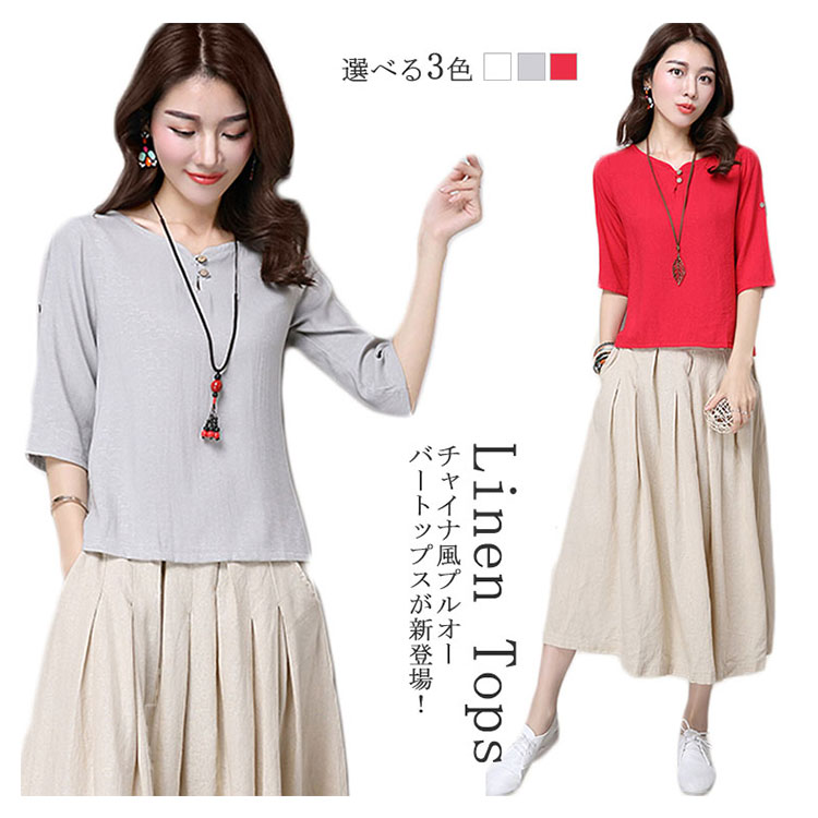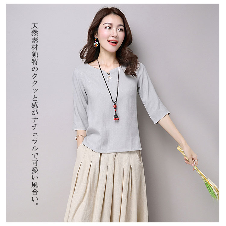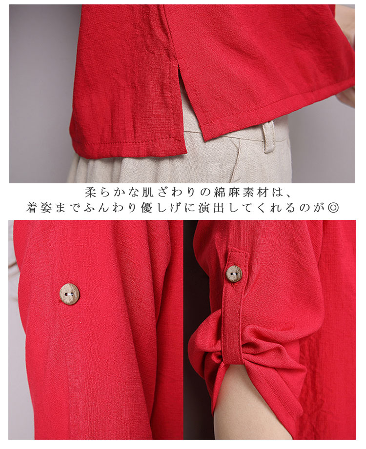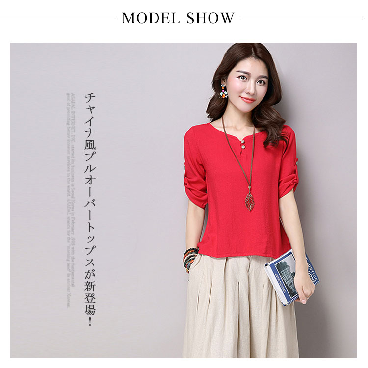 | チャイナ風プルオーバートップスが新登場! 通気性と吸湿性に優れた薄手の綿麻素材を使用した爽やかなサマートップスです。 天然素材独特のクタッと感がナチュラルで可愛い風合い。 | |